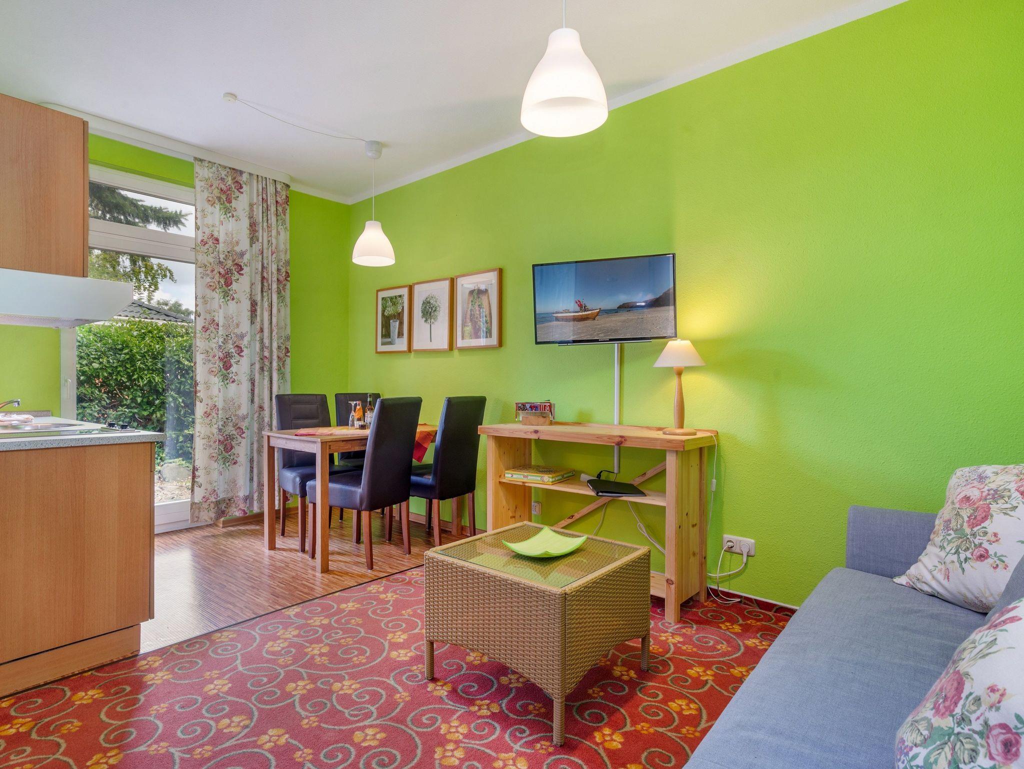 2-4 Pers.: 2-Zimmer-Wohnung mit 37 qm Wohnfläche, Parterre. Wohn-/Essraum mit Couchgarnitur (Ausziehcouch 2 Pers.), Esstisch, Küchenzeile (2 P. E-Herd, Spülmaschine, Minibackofen, Kaffeemaschine, Wasserkocher, 6-Set-Ess-Geschirr und Besteck, kleine Auswahl an Gläsern, kleine Topfsammlung, ein paar kleine Küchenhelfer --- Grundausstattung!!!)). Doppelbett, Couchgarnitur (Ausziehcouch 2 Personen), Bad/WC. Balkon mit Sitzmöbeln.