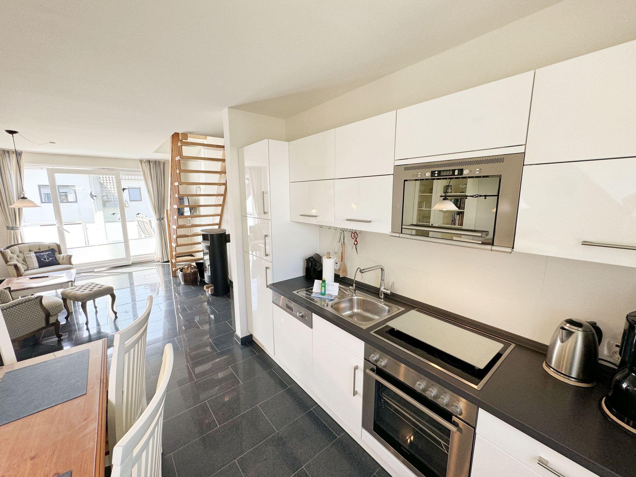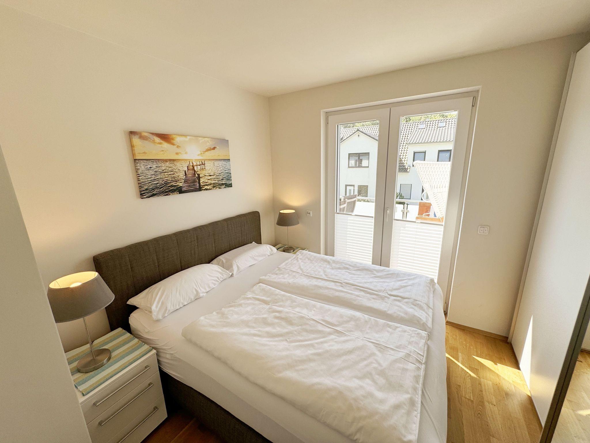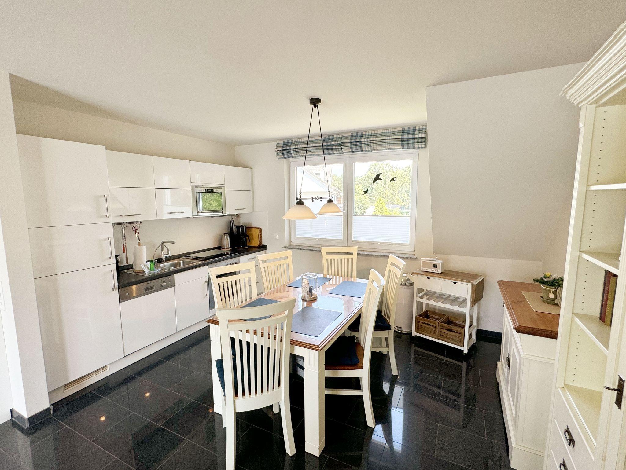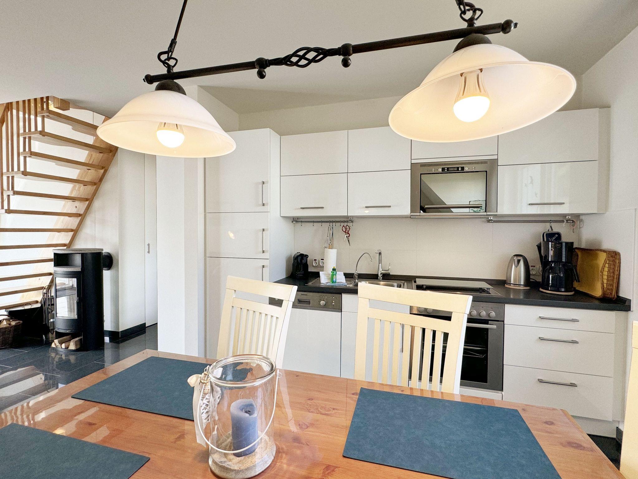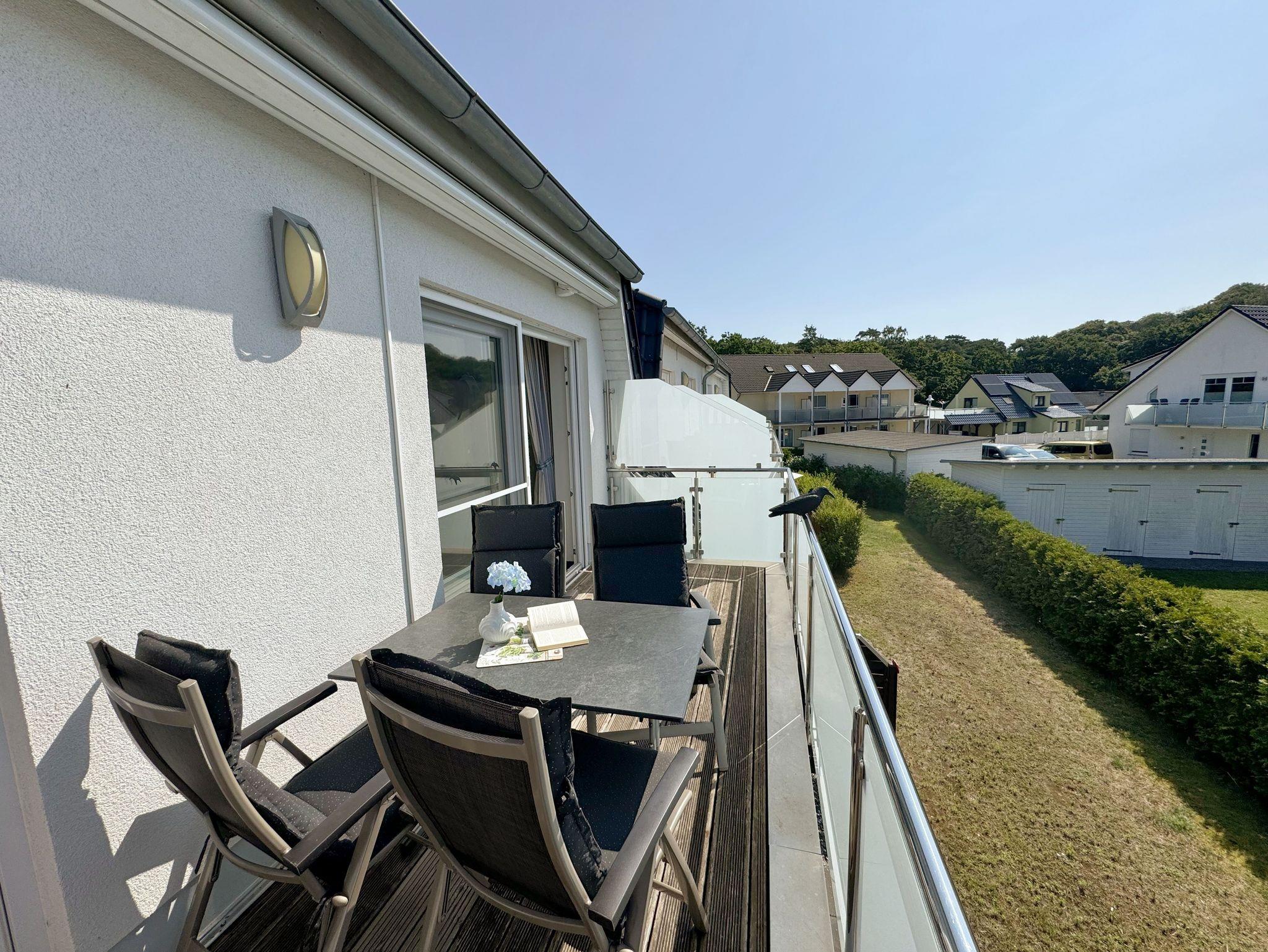 Die Nichtraucherferienwohnung Nr. 06 befindet sich im Obergeschoss im Haus Sanddorn. Sie bietet Ihnen mit Ihren ca. 70qm ausreichend Platz für 2 ? 4 Personen und ist der ideale Rückzugsort für Ihren Urlaub auf der Halbinsel Mönchgut. Treten Sie ein und lassen sich von der abgestimmten Einrichtung verzaubern. Der kleine Flurbereich ist mit einer Garderobe, einem Ganzkörperspiegel und einem Wandschrank versehen. Von hier aus gelangen Sie in den offenen Wohnbereich mit angrenzendem Essbereich sowie der offenen Küchenzeile. Der helle Wohnbereich wurde mit Vollholzmöbeln, einer Ledercouch, zwei bequeme Sessel, einem Couchtisch, zwei Leselampen, einem Smart-TV, einem DAB-Radio, einer kleinen Auswahl an Urlaubslektüre und WLAN ausgestattet. An kühlen Tagen sorgt ein Kaminofen für eine zusätzliche Gemütlichkeit. Von hier gelangen Sie auch auf den bestuhlten Südbalkon mit elektrischer Markise und Windsensor, welche Ihnen an sonnigen Tagen Schatten spendet. Angrenzend zum Wohnbereich befindet sich die vollausgestattet Küchenzeile. Die hochwertige Ausstattung umfasst ein 4 Zonen Cerankochfeld, einen Kühlschrank mit Eisfach, eine Spülmaschine, einen Backofen, eine Mikrowelle, eine Kaffeemaschine mit Thermoskanne, eine Nespresso Maschine, einen Toaster, einen Wasserkocher sowie diverse Küchenutensilien, die Sie zum Kochen benötigen. Ein Essplatz rundet den Bereich ab. Das Schlafzimmer, welches sich auf der gleichen Ebene befindet, wurde mit einem Boxspringbett (1,60m x 2,00m) mit durchgehenden Topper, Nachttischablagen und einem großen Kleiderschrank ausgestattet. Auch von hier gelangen Sie auf den Südbalkon. Das Tageslicht-Bad sorgt mit seinem beheizbaren Handtuchheizkörper, einem WC, einer ebenerdigen Dusche, einem Waschplatz, einem Fön, einem Kosmetikspiegel, einer Waschmaschine und einem Wäschetrockner für Komfort und Bequemlichkeit. Das zweite Schlafzimmer erreichen Sie durch eine Links-/Rechts Treppe vom Wohnbereich. Hier können Sie mit 2 Einzelbetten (á 0,90m x 2,00m), verstellbare Lattenroste, einer Kommode, einen Kleiderschrank und einen Smart-TV zufrieden in den Schlaf kommen. Abgerundet wird der Schlafkomfort in diesem Raum mit einem elektrisch gesteuerten Dachfenster mit Insektenschutzgitter und Verdunklungsrollo. Von hier aus gelangen Sie in das zusätzliche Gäste-WC mit Waschplatz und Einbauschrank. Alle Räumlichkeiten sind zusätzlich mit Insektenschutzgitter, elektrischen Außenrollo´s und einer Fußbodenheizung ausgestattet. Haustiere sind nicht erlaubt. Ein PKW-Stellplatz (Nr.06) befindet sich direkt am Haus. Im Schuppen (Nr.06) können Sie Ihre mitgebrachten oder geliehenen Fahrräder unterstellen. Die Erstausstattung eines Wäschepaketes (komplette Bettwäsche, 1 Duschhandtuch, 2 kleine Handtücher) können Sie bis 14 Tage vor Anreise gegen einen Aufpreis dazu buchen oder durch eigenes Ergänzen. Ab 2 gebuchten Paketen erhalten Sie einmalig 1 Geschirrhandtuch und 1 Duschvorleger hinzu.