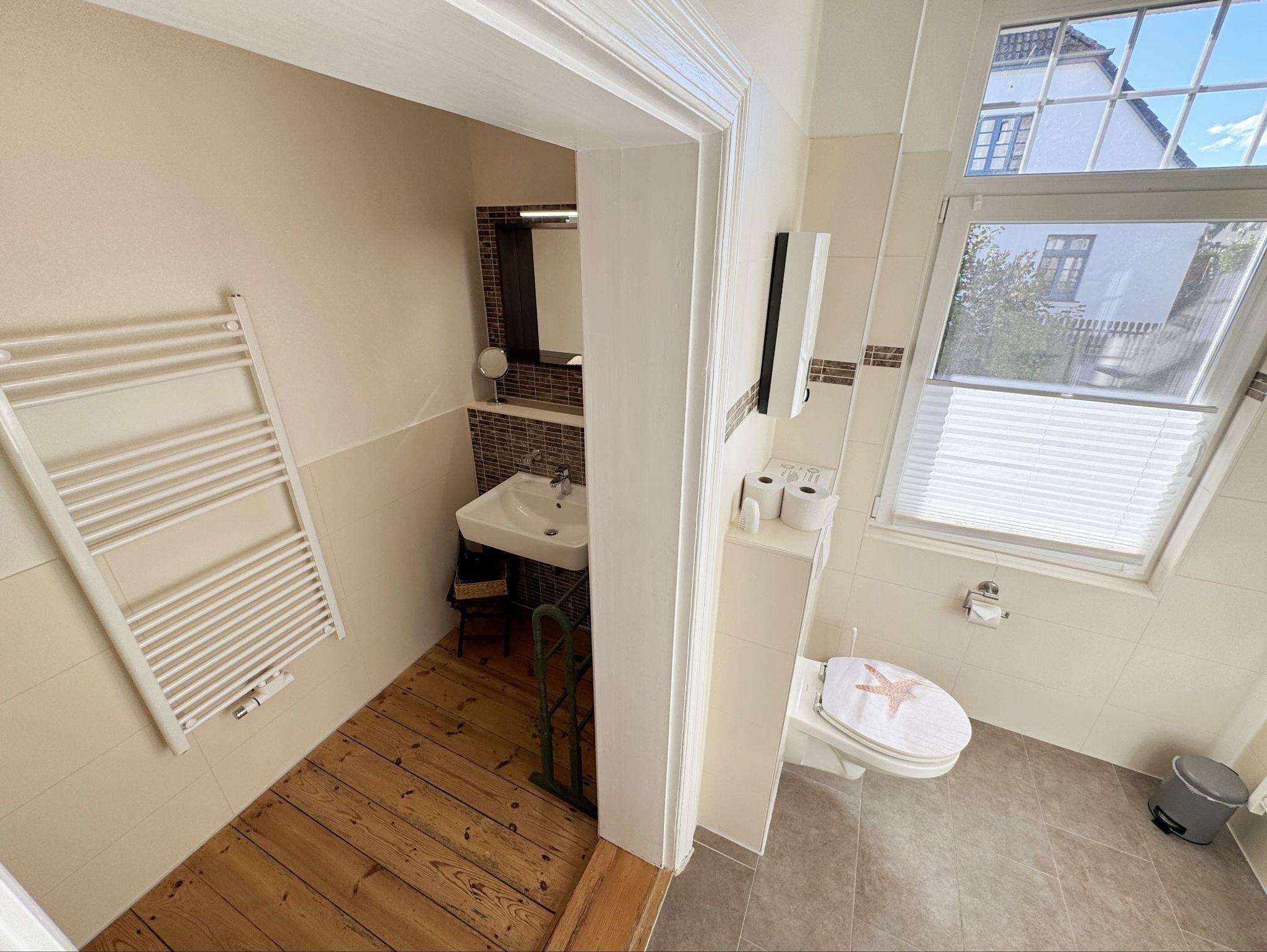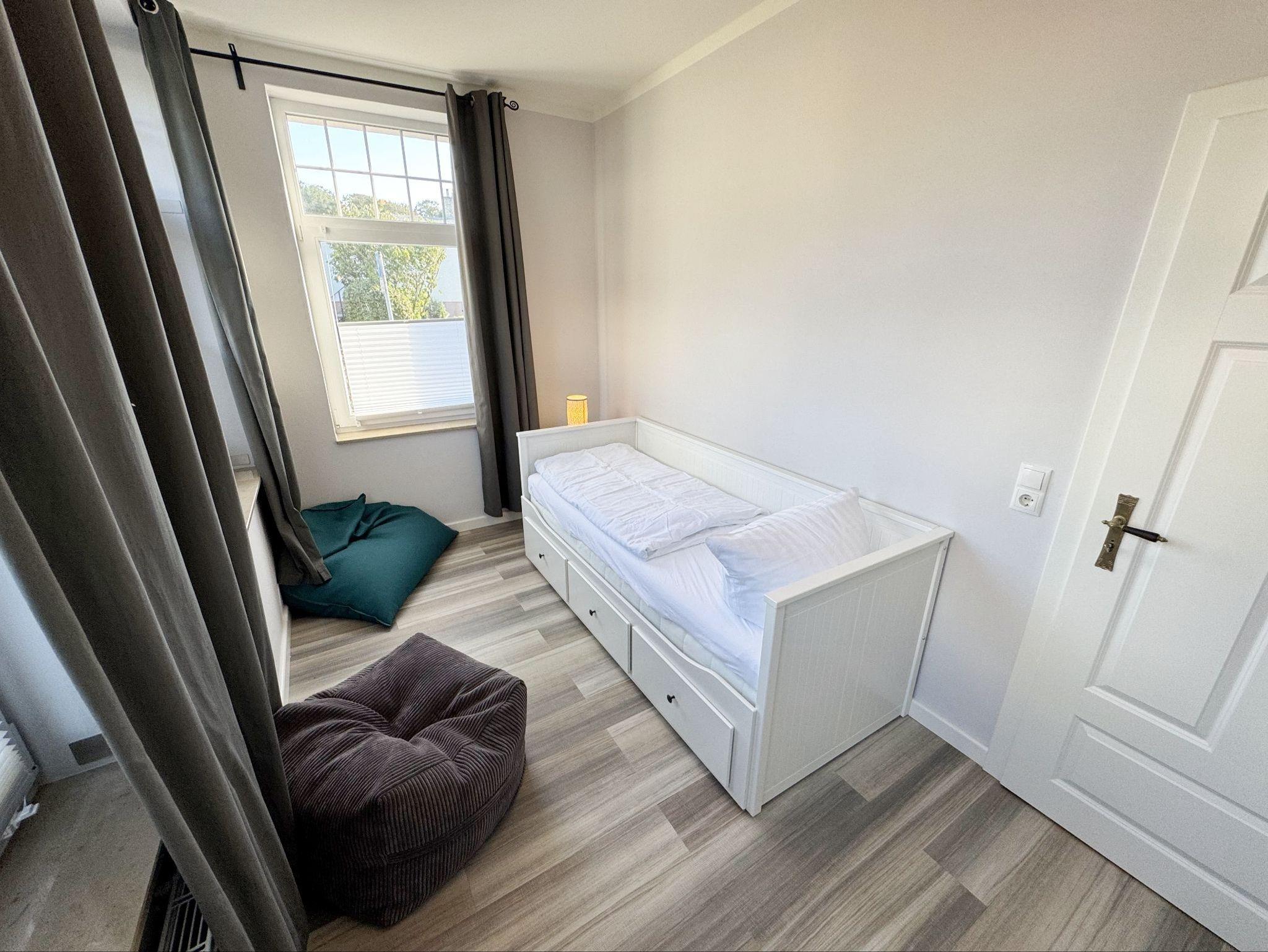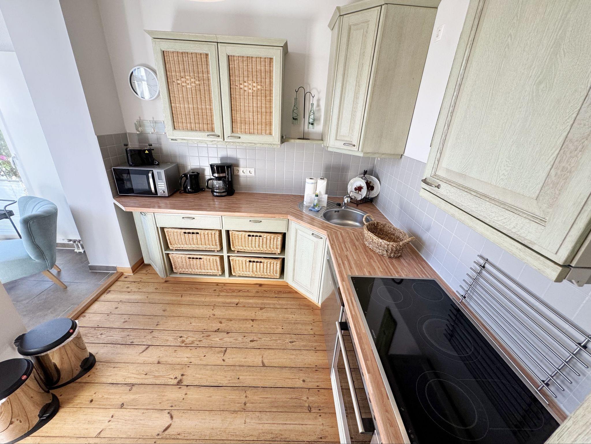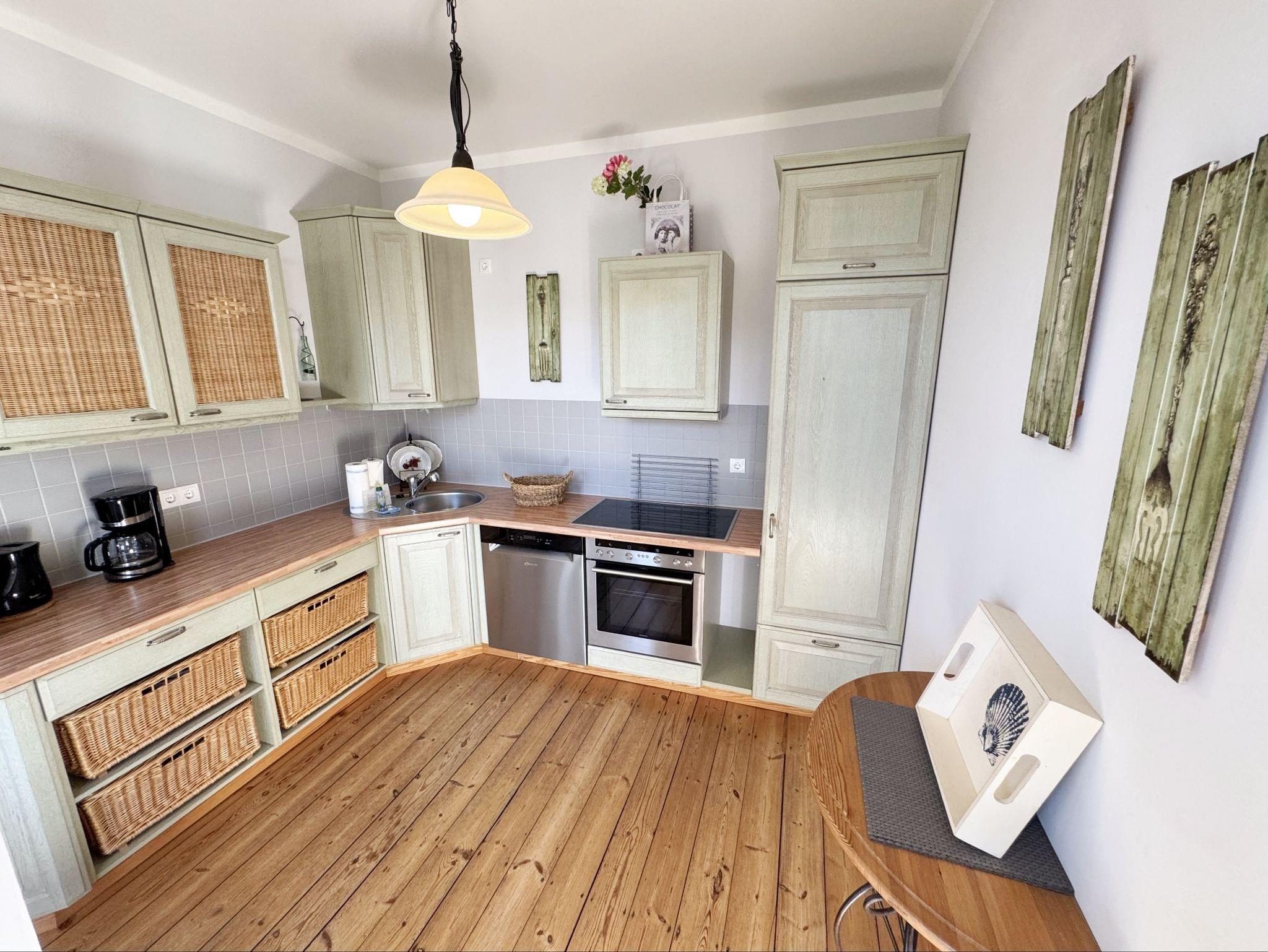 Unsere Ferienwohnung 2 ?Rosengarten? ist eine komfortable ca. 70 m² große Nichtraucherwohnung im Erdgeschoß des Hauses Seestern. Hier finden Sie für Ihre Familie, max. 5 Erwachsene und 1 Kleinkind bis 3 Jahre im Kinderreisebett, für einen angenehmen Urlaub ausreichend Platz, viel Bequemlichkeit und Komfort. Sie werden sich einfach WOHLFÜHLEN! In der modernen und voll ausgestatteten Küche können Sie gemeinsam Ihr Essen zubereiten. Alles was Sie brauchen steht zur Verfügung ? Herd mit Ceranfeld, Backofen, Geschirrspüler, Mikrowelle, Kühlschrank mit Gefrierfach, ausreichend Stauraum und natürlich auch ein Wasserkocher, Toaster, Kaffeemaschine und diverse Küchenutensilien. Auf der vorgesetzten Veranda, die als Esszimmer eingerichtet wurde, können Sie die Mahlzeiten gemeinsam einnehmen und verweilen. Von dort kommen Sie auch direkt zu Ihrer eigenen und bestuhlten Terrasse (Südost) mit kleinen Rosengarten, der nur dieser Wohnung zur Verfügung steht. Zusätzlich können Sie aber auch den gemeinschaftlichen Garten nutzen, den Sie auch von der Veranda aus direkt oder über den Hof erreichen können. Im Wohnzimmer mit Flachbild-TV und Radio mit Bluetooth finden Sie einen gemütlichen Couchbereich zum Ausruhen (Aufbettungsmöglichkeit für 5. Person - 1,40m x 2,00m), einen Couchtisch, einen Lesesessel, Leselampe sowie ein Sideboard runden den Bereich ab. Auch auf einen Internetanschluss (WLAN) müssen Sie im Urlaub nicht verzichten. Dieser ist inklusive für Sie. Das geräumige Schlafzimmer mit Boxspringbett (1,80 m x 2,00 m) und großen Kleiderschrank bietet zudem bei Bedarf noch Platz für ein Kinderreisebett für Ihr kleinstes Familienmitglied. Hier haben wir die beiden historischen Fenster anhand eines Fotos aus ?alter Zeit? nachbauen lassen können. Hier schließt sich eine Veranda an: das 2. Schlafzimmer mit einem Kojenbett (2x 0,80 m x 2,00 m), welches auch mit Flachbild-TV voll eingerichtet wurde. Wenn die Abende kühler werden, können Sie sich in der wohnungseigenen Sauna aufwärmen und erholen. Das Bad mit Sauna wurde als Duschbad mit WC, Fön und Handtuchheizkörper ausgestattet und im separaten Vorraum, mit dem historischen Dielenboden und einer Wand in Steinoptik, findet man den großen Waschtisch, Spiegel und auch Ablagemöglichkeiten. Im Wohn-, Schlafzimmer, in der Küche und im Vorraum zum Bad konnten wir den alten Holzfußboden erhalten und haben diesen aufarbeiten lassen. In den anderen Räumen haben wir hochwertige Fliesen oder ein anderes passendes Material ausgelegt. Insektenschutzgitter und Verdunklungsmöglichkeiten sind vorhanden. Für unsere kleinen Gäste stehen je 1 Kinderreisebett (ohne Zusatzmatratze / ohne Bettinlett) und 1 Hochstuhl pro Wohnung inklusive zur Verfügung. Ihr PKW-Stellplatz (Nr. 2) befindet sich auf dem Grundstück sowie ein Gemeinschaftsgrill. 2 Haustiere sind gegen eine Gebühr willkommen. Eine Waschmaschine und ein Trockner stehen allen Gästen gegen Gebühr zur Verfügung. Diese Räumlichkeiten befinden sich auf der Hofseite. Die Erstausstattung eines Wäschepaketes (komplette Bettwäsche, 1 Duschhandtuch, 2 kleine Handtücher) können Sie bis 14 Tage vor Anreise gegen einen Aufpreis dazu buchen oder durch eigene ergänzen. Ab 2 gebuchten Paketen erhalten Sie einmalig 1 Geschirrhandtuch und 1 Duschvorleger hinzu.
