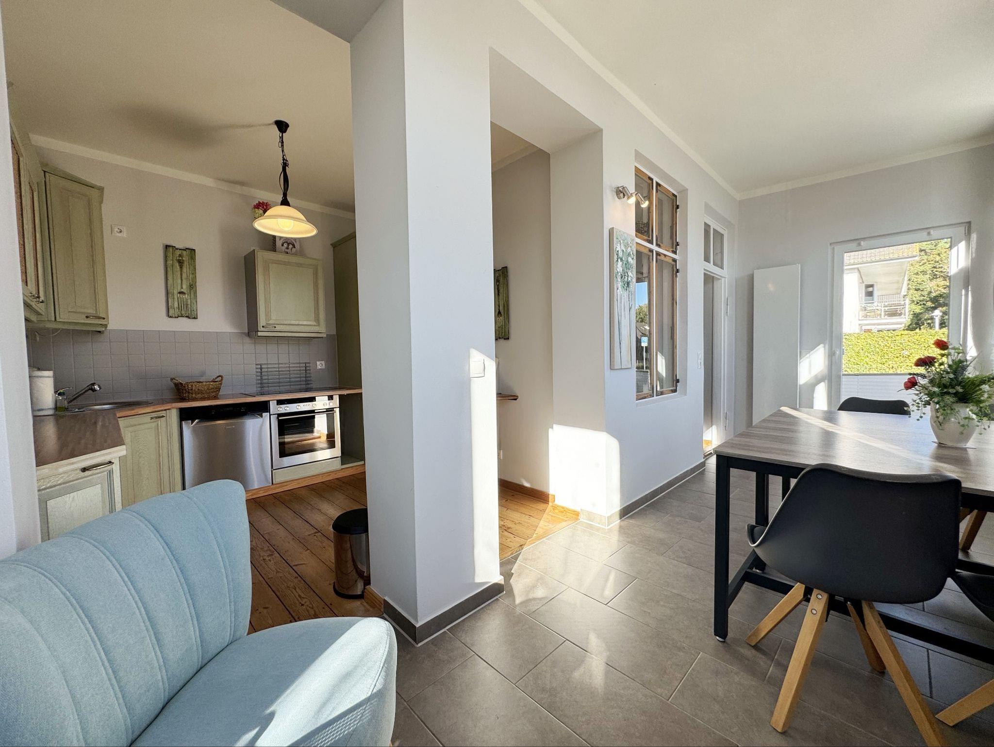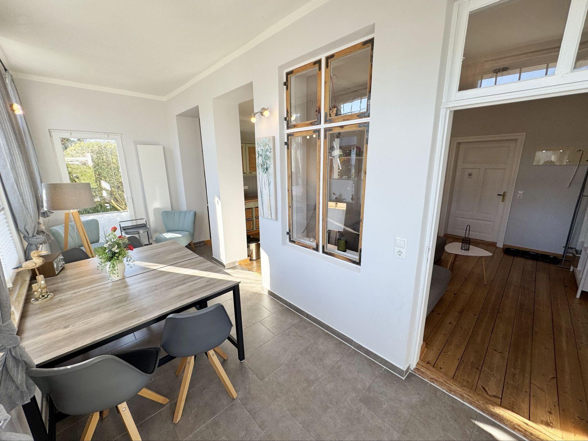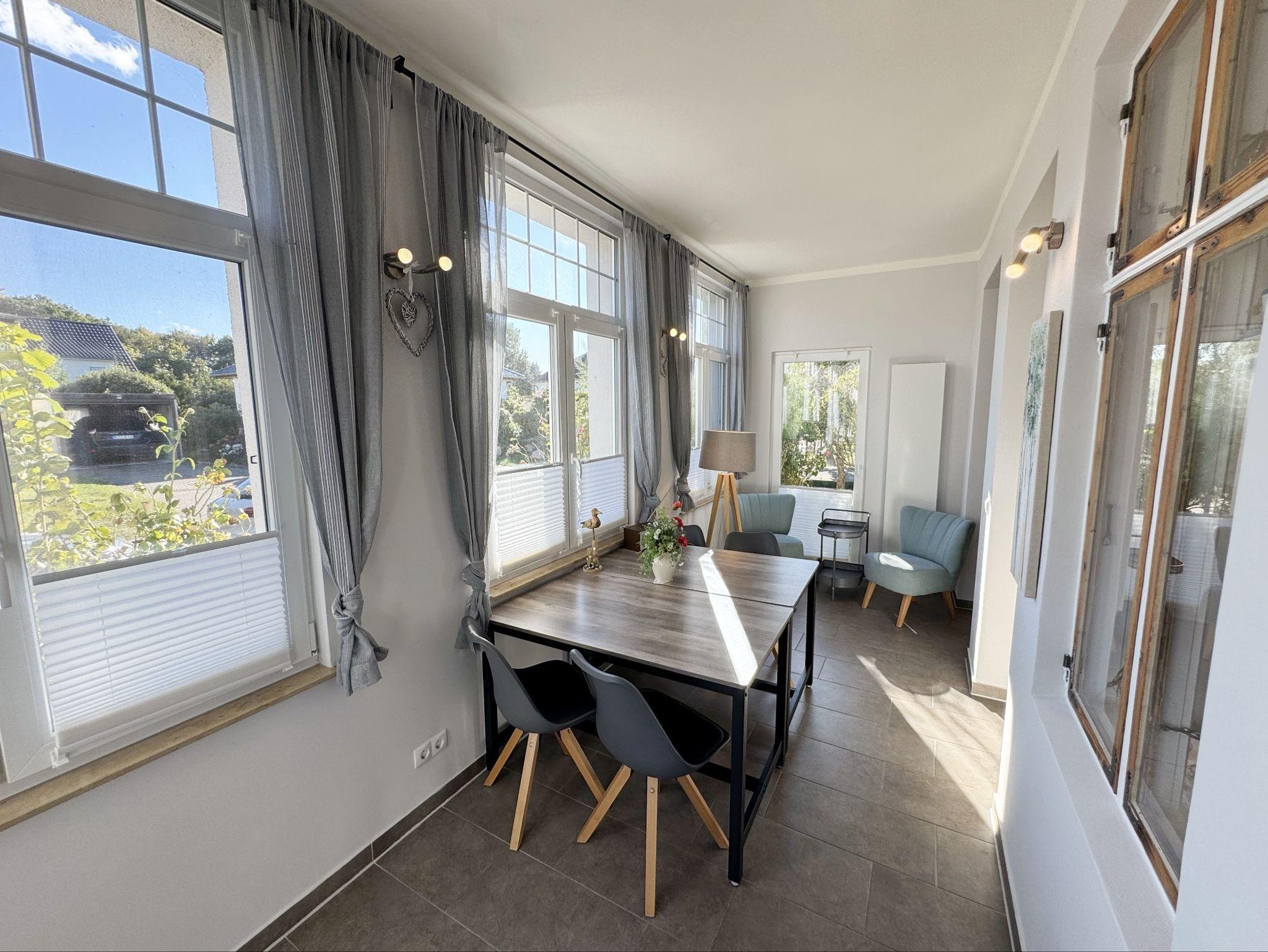 Unsere Ferienwohnung 2 ?Rosengarten? ist eine komfortable ca. 70 m² große Nichtraucherwohnung im Erdgeschoß des Hauses Seestern. Hier finden Sie für Ihre Familie, max. 5 Erwachsene und 1 Kleinkind bis 3 Jahre im Kinderreisebett, für einen angenehmen Urlaub ausreichend Platz, viel Bequemlichkeit und Komfort. Sie werden sich einfach WOHLFÜHLEN! In der modernen und voll ausgestatteten Küche können Sie gemeinsam Ihr Essen zubereiten. Alles was Sie brauchen steht zur Verfügung ? Herd mit Ceranfeld, Backofen, Geschirrspüler, Mikrowelle, Kühlschrank mit Gefrierfach, ausreichend Stauraum und natürlich auch ein Wasserkocher, Toaster, Kaffeemaschine und diverse Küchenutensilien. Auf der vorgesetzten Veranda, die als Esszimmer eingerichtet wurde, können Sie die Mahlzeiten gemeinsam einnehmen und verweilen. Von dort kommen Sie auch direkt zu Ihrer eigenen und bestuhlten Terrasse (Südost) mit kleinen Rosengarten, der nur dieser Wohnung zur Verfügung steht. Zusätzlich können Sie aber auch den gemeinschaftlichen Garten nutzen, den Sie auch von der Veranda aus direkt oder über den Hof erreichen können. Im Wohnzimmer mit Flachbild-TV und Radio mit Bluetooth finden Sie einen gemütlichen Couchbereich zum Ausruhen (Aufbettungsmöglichkeit für 5. Person - 1,40m x 2,00m), einen Couchtisch, einen Lesesessel, Leselampe sowie ein Sideboard runden den Bereich ab. Auch auf einen Internetanschluss (WLAN) müssen Sie im Urlaub nicht verzichten. Dieser ist inklusive für Sie. Das geräumige Schlafzimmer mit Boxspringbett (1,80 m x 2,00 m) und großen Kleiderschrank bietet zudem bei Bedarf noch Platz für ein Kinderreisebett für Ihr kleinstes Familienmitglied. Hier haben wir die beiden historischen Fenster anhand eines Fotos aus ?alter Zeit? nachbauen lassen können. Hier schließt sich eine Veranda an: das 2. Schlafzimmer mit einem Kojenbett (2x 0,80 m x 2,00 m), welches auch mit Flachbild-TV voll eingerichtet wurde. Wenn die Abende kühler werden, können Sie sich in der wohnungseigenen Sauna aufwärmen und erholen. Das Bad mit Sauna wurde als Duschbad mit WC, Fön und Handtuchheizkörper ausgestattet und im separaten Vorraum, mit dem historischen Dielenboden und einer Wand in Steinoptik, findet man den großen Waschtisch, Spiegel und auch Ablagemöglichkeiten. Im Wohn-, Schlafzimmer, in der Küche und im Vorraum zum Bad konnten wir den alten Holzfußboden erhalten und haben diesen aufarbeiten lassen. In den anderen Räumen haben wir hochwertige Fliesen oder ein anderes passendes Material ausgelegt. Insektenschutzgitter und Verdunklungsmöglichkeiten sind vorhanden. Für unsere kleinen Gäste stehen je 1 Kinderreisebett (ohne Zusatzmatratze / ohne Bettinlett) und 1 Hochstuhl pro Wohnung inklusive zur Verfügung. Ihr PKW-Stellplatz (Nr. 2) befindet sich auf dem Grundstück sowie ein Gemeinschaftsgrill. 2 Haustiere sind gegen eine Gebühr willkommen. Eine Waschmaschine und ein Trockner stehen allen Gästen gegen Gebühr zur Verfügung. Diese Räumlichkeiten befinden sich auf der Hofseite. Die Erstausstattung eines Wäschepaketes (komplette Bettwäsche, 1 Duschhandtuch, 2 kleine Handtücher) können Sie bis 14 Tage vor Anreise gegen einen Aufpreis dazu buchen oder durch eigene ergänzen. Ab 2 gebuchten Paketen erhalten Sie einmalig 1 Geschirrhandtuch und 1 Duschvorleger hinzu.