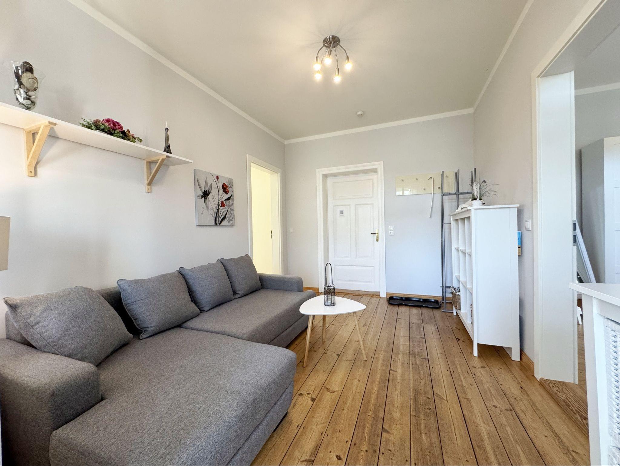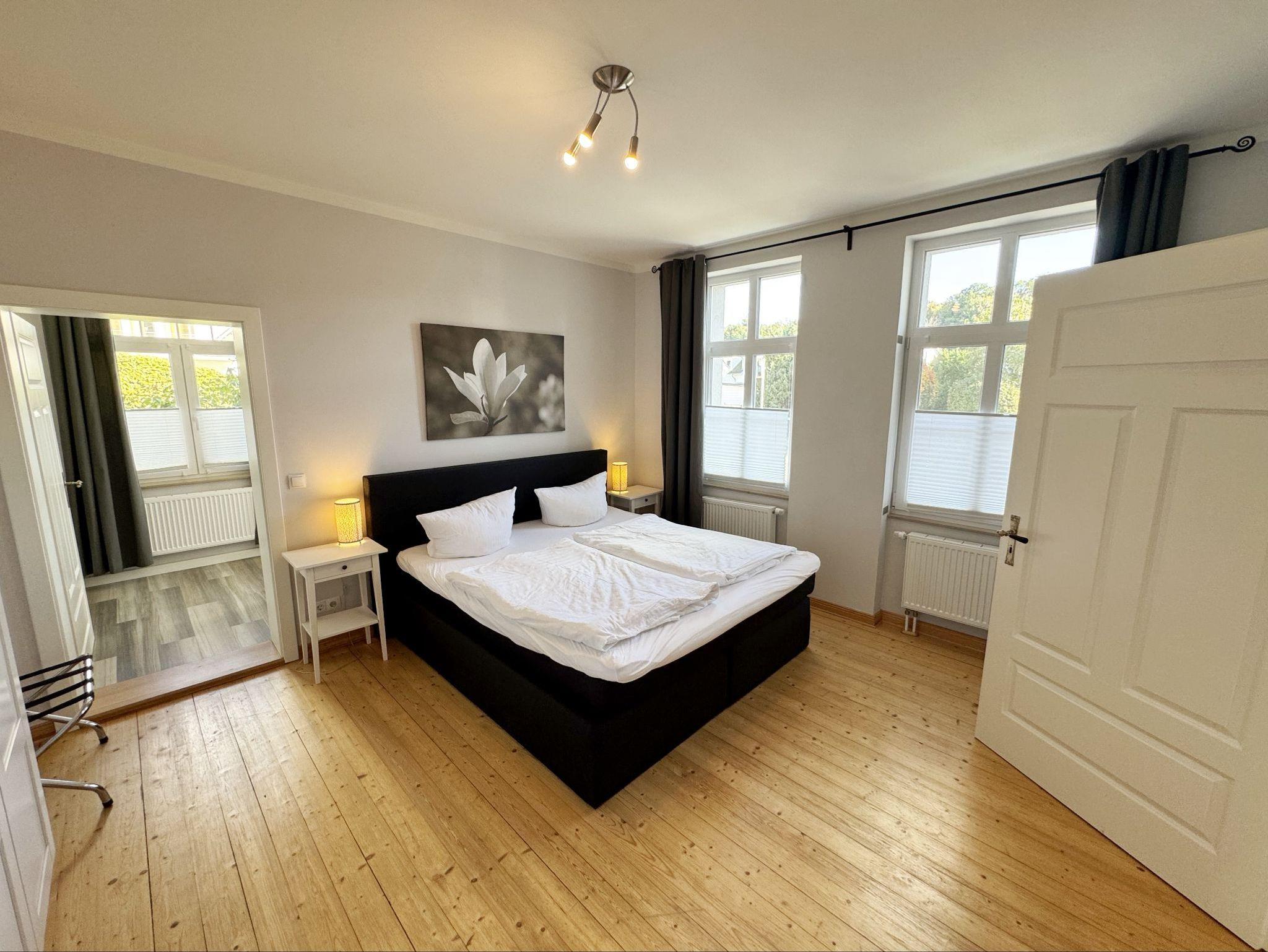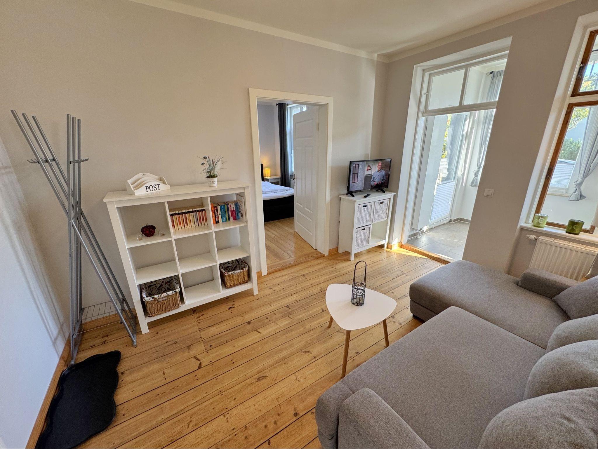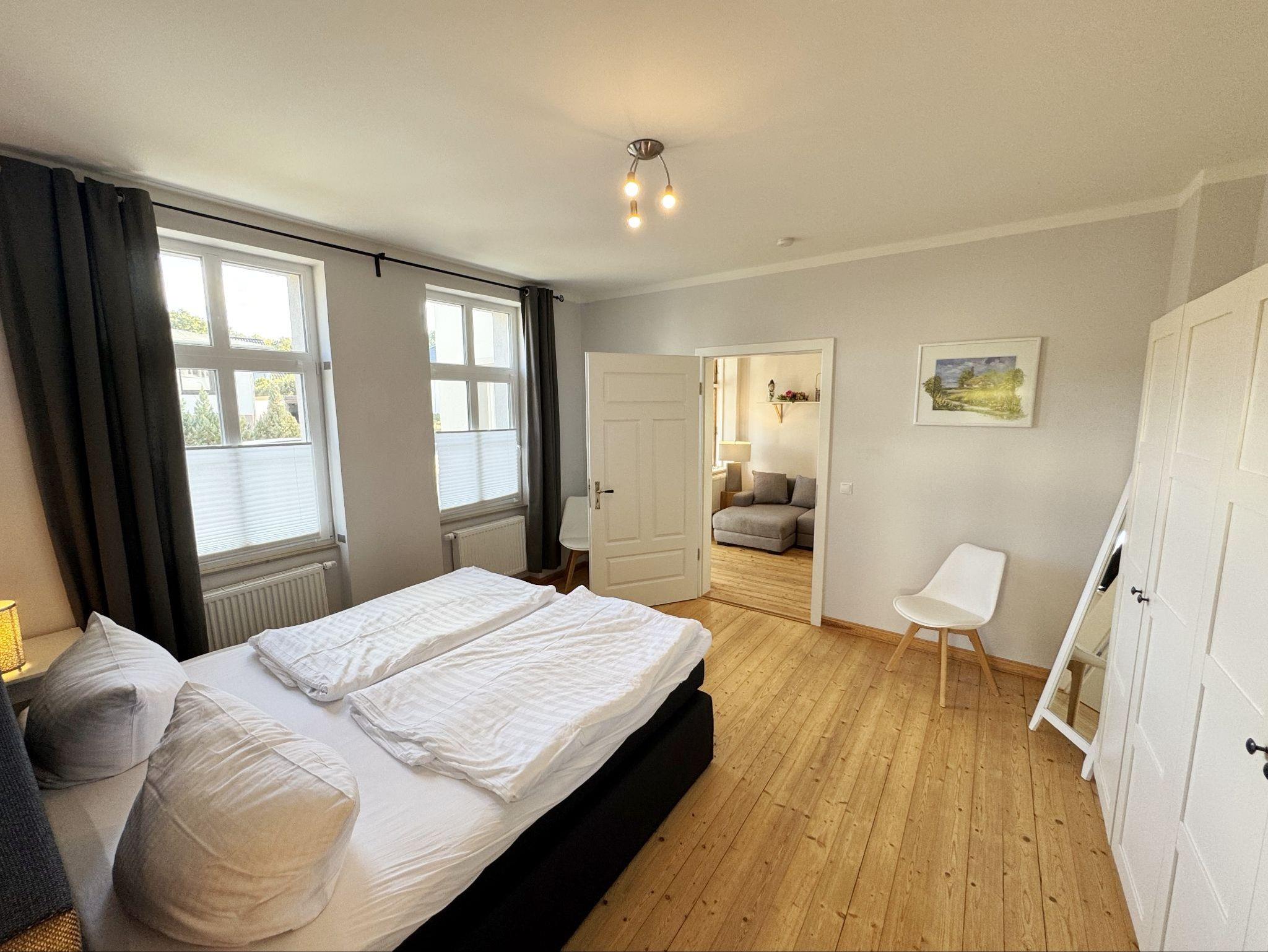 Unsere Ferienwohnung 2 ?Rosengarten? ist eine komfortable ca. 70 m² große Nichtraucherwohnung im Erdgeschoß des Hauses Seestern. Hier finden Sie für Ihre Familie, max. 5 Erwachsene und 1 Kleinkind bis 3 Jahre im Kinderreisebett, für einen angenehmen Urlaub ausreichend Platz, viel Bequemlichkeit und Komfort. Sie werden sich einfach WOHLFÜHLEN! In der modernen und voll ausgestatteten Küche können Sie gemeinsam Ihr Essen zubereiten. Alles was Sie brauchen steht zur Verfügung ? Herd mit Ceranfeld, Backofen, Geschirrspüler, Mikrowelle, Kühlschrank mit Gefrierfach, ausreichend Stauraum und natürlich auch ein Wasserkocher, Toaster, Kaffeemaschine und diverse Küchenutensilien. Auf der vorgesetzten Veranda, die als Esszimmer eingerichtet wurde, können Sie die Mahlzeiten gemeinsam einnehmen und verweilen. Von dort kommen Sie auch direkt zu Ihrer eigenen und bestuhlten Terrasse (Südost) mit kleinen Rosengarten, der nur dieser Wohnung zur Verfügung steht. Zusätzlich können Sie aber auch den gemeinschaftlichen Garten nutzen, den Sie auch von der Veranda aus direkt oder über den Hof erreichen können. Im Wohnzimmer mit Flachbild-TV und Radio mit Bluetooth finden Sie einen gemütlichen Couchbereich zum Ausruhen (Aufbettungsmöglichkeit für 5. Person - 1,40m x 2,00m), einen Couchtisch, einen Lesesessel, Leselampe sowie ein Sideboard runden den Bereich ab. Auch auf einen Internetanschluss (WLAN) müssen Sie im Urlaub nicht verzichten. Dieser ist inklusive für Sie. Das geräumige Schlafzimmer mit Boxspringbett (1,80 m x 2,00 m) und großen Kleiderschrank bietet zudem bei Bedarf noch Platz für ein Kinderreisebett für Ihr kleinstes Familienmitglied. Hier haben wir die beiden historischen Fenster anhand eines Fotos aus ?alter Zeit? nachbauen lassen können. Hier schließt sich eine Veranda an: das 2. Schlafzimmer mit einem Kojenbett (2x 0,80 m x 2,00 m), welches auch mit Flachbild-TV voll eingerichtet wurde. Wenn die Abende kühler werden, können Sie sich in der wohnungseigenen Sauna aufwärmen und erholen. Das Bad mit Sauna wurde als Duschbad mit WC, Fön und Handtuchheizkörper ausgestattet und im separaten Vorraum, mit dem historischen Dielenboden und einer Wand in Steinoptik, findet man den großen Waschtisch, Spiegel und auch Ablagemöglichkeiten. Im Wohn-, Schlafzimmer, in der Küche und im Vorraum zum Bad konnten wir den alten Holzfußboden erhalten und haben diesen aufarbeiten lassen. In den anderen Räumen haben wir hochwertige Fliesen oder ein anderes passendes Material ausgelegt. Insektenschutzgitter und Verdunklungsmöglichkeiten sind vorhanden. Für unsere kleinen Gäste stehen je 1 Kinderreisebett (ohne Zusatzmatratze / ohne Bettinlett) und 1 Hochstuhl pro Wohnung inklusive zur Verfügung. Ihr PKW-Stellplatz (Nr. 2) befindet sich auf dem Grundstück sowie ein Gemeinschaftsgrill. 2 Haustiere sind gegen eine Gebühr willkommen. Eine Waschmaschine und ein Trockner stehen allen Gästen gegen Gebühr zur Verfügung. Diese Räumlichkeiten befinden sich auf der Hofseite. Die Erstausstattung eines Wäschepaketes (komplette Bettwäsche, 1 Duschhandtuch, 2 kleine Handtücher) können Sie bis 14 Tage vor Anreise gegen einen Aufpreis dazu buchen oder durch eigene ergänzen. Ab 2 gebuchten Paketen erhalten Sie einmalig 1 Geschirrhandtuch und 1 Duschvorleger hinzu.