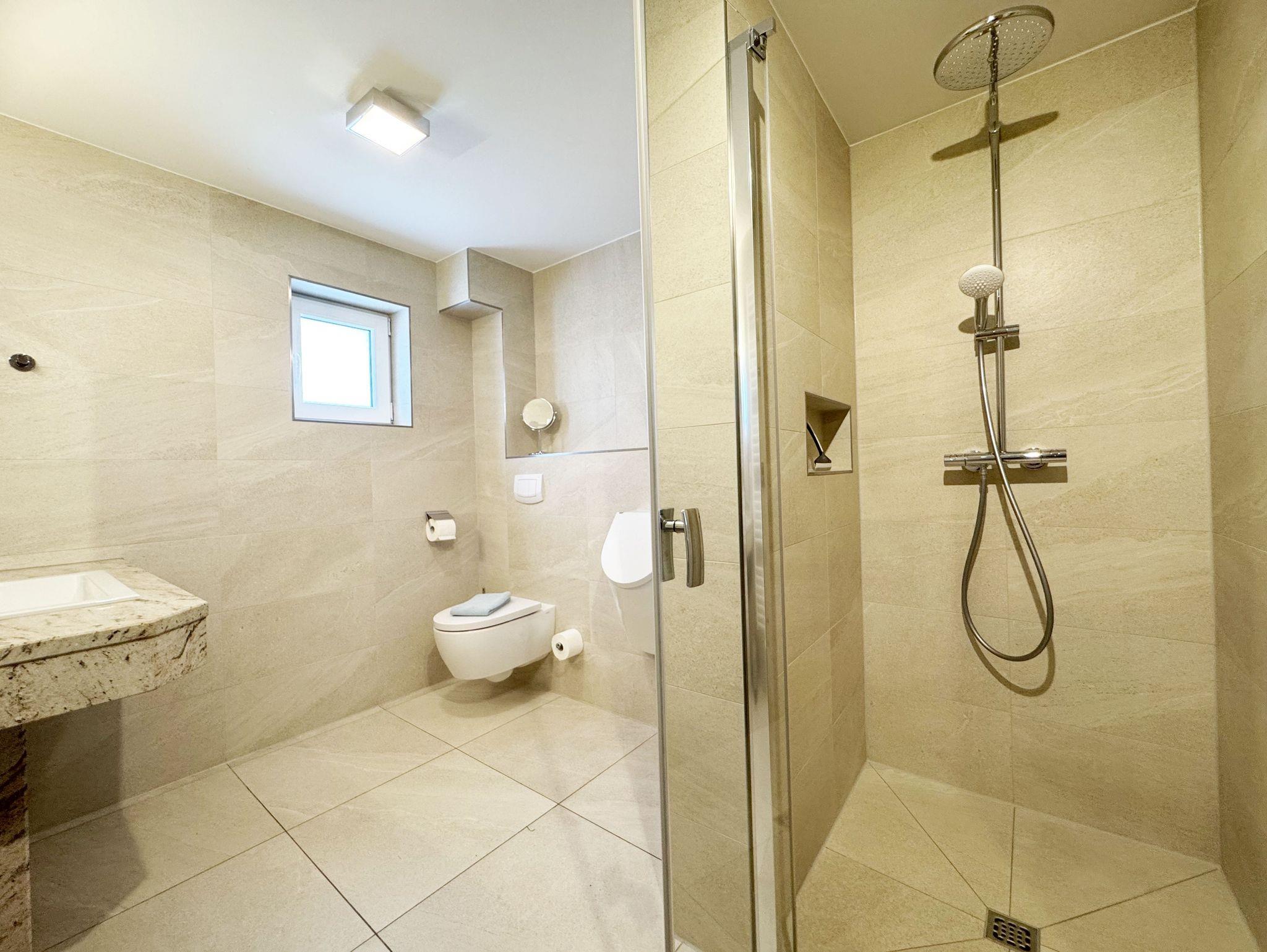 Die hier angebotene Nichtraucherwohnung mit 55 m² für 2 bis 4 Personen, befindet sich in einem Doppelhaus. Die Wohnung verfügt im Erdgeschoss über einen Eingangsbereich, ein luxuriöses Bad mit Granitwaschtisch, Echtglasdusche, Handtuchheizkörper, Fön und Fußbodenheizung sowie ein Schlafzimmer mit Doppelbett in der Größe 180 x 200 cm. Die Matratzen haben einen Härtegrad von 2 und 3. Die Möbel sind cremefarbig. Verdunklungsvorhänge in Sand- und Blautönen runden das Bild ab. Ein Einzelbett (0,90m x 2,00m) befindet sich zusätzlich im Schlafzimmer. Das Erdgeschoss ist mit hochwertigen italienischen Lake-Stone-Fliesen ausgestattet. Über eine massive Eichenholztreppe gelangt man in die obere Etage. Hier erwartet Sie der gemütliche Wohnbereich (ca. 25m²) mit Eichen-Parkettfußboden, einer offenen, modernen Küche mit Cerankochfeld, Backofen, Geschirrspülmaschine und einem Kühlschrank mit Gefrierfach. Die Küchenausstattung enthält an Kleinelektrogeräten einen Toaster, eine Kaffeemaschine, einen Handmixer sowie einen Wasser- und Eierkocher. Komfortable blau/beige Polstermöbel mit einer ausziehbaren Schlafcouch (1,60m x 2,00m), einem Esstisch aus massiver, geölter Wildeiche, Edelstahl-Schwingstühlen mit Lederbezügen in der Farbe mocca, Flachbildfernseher und Mini-Stereoanlage sowie WLAN (inklusive) runden das Bild ab. Große Giebelfenster ausgestattet mit Insektenschutz und Plissees, erlauben einen wunderbaren Blick auf die Ostsee. Eine original finnische Sauna mit moderner Dusche und Ruheliegen steht allen Gästen gegen Gebühr zur Verfügung. Die Parkplätze und ein überdachter Fahrradunterstand stehen kostenlos zur Verfügung. Ein ca. 3.000 qm großes Rasengrundstück, nahe am Haus und unmittelbar vor der Ostseeküste gelegen, steht zur Urlaubsgestaltung mit Strandkorb und bequemer Sonnenliege zur Verfügung. Ebenfalls kann ein Kinderspielplatz und ein mit bequemen Sitzgelegenheiten ausgestatteter Grillplatz genutzt werden. Für unsere kleinen Gäste steht 1x Kinderreisebett (ohne Zusatzmatratze, ohne Bettinlett) und 1x Hochstuhl inklusive bereit. Haustiere sind nicht erlaubt. Die Erstausstattung eines Wäschepaketes (komplette Bettwäsche, 1 Duschhandtuch, 2 kleine Handtücher, 2 Geschirrhandtücher) können Sie bis 14 Tage vor Anreise gegen einen Aufpreis dazu buchen oder durch eigene ergänzen.
