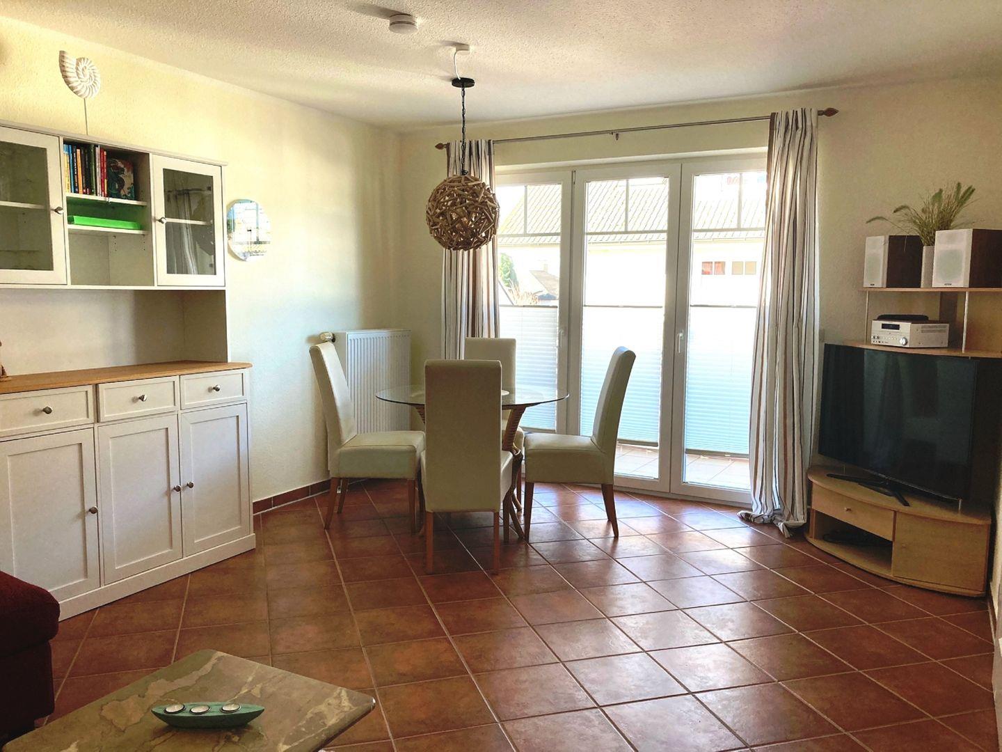 WOHNEN // Wohnraum mit Essbereich, Sitzgarnitur mit bequemer Schlafcouch, Flachbild-TV, Radio, CD-Player ++