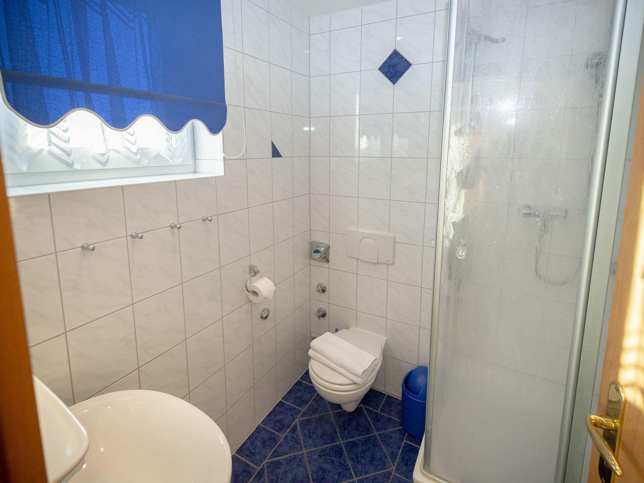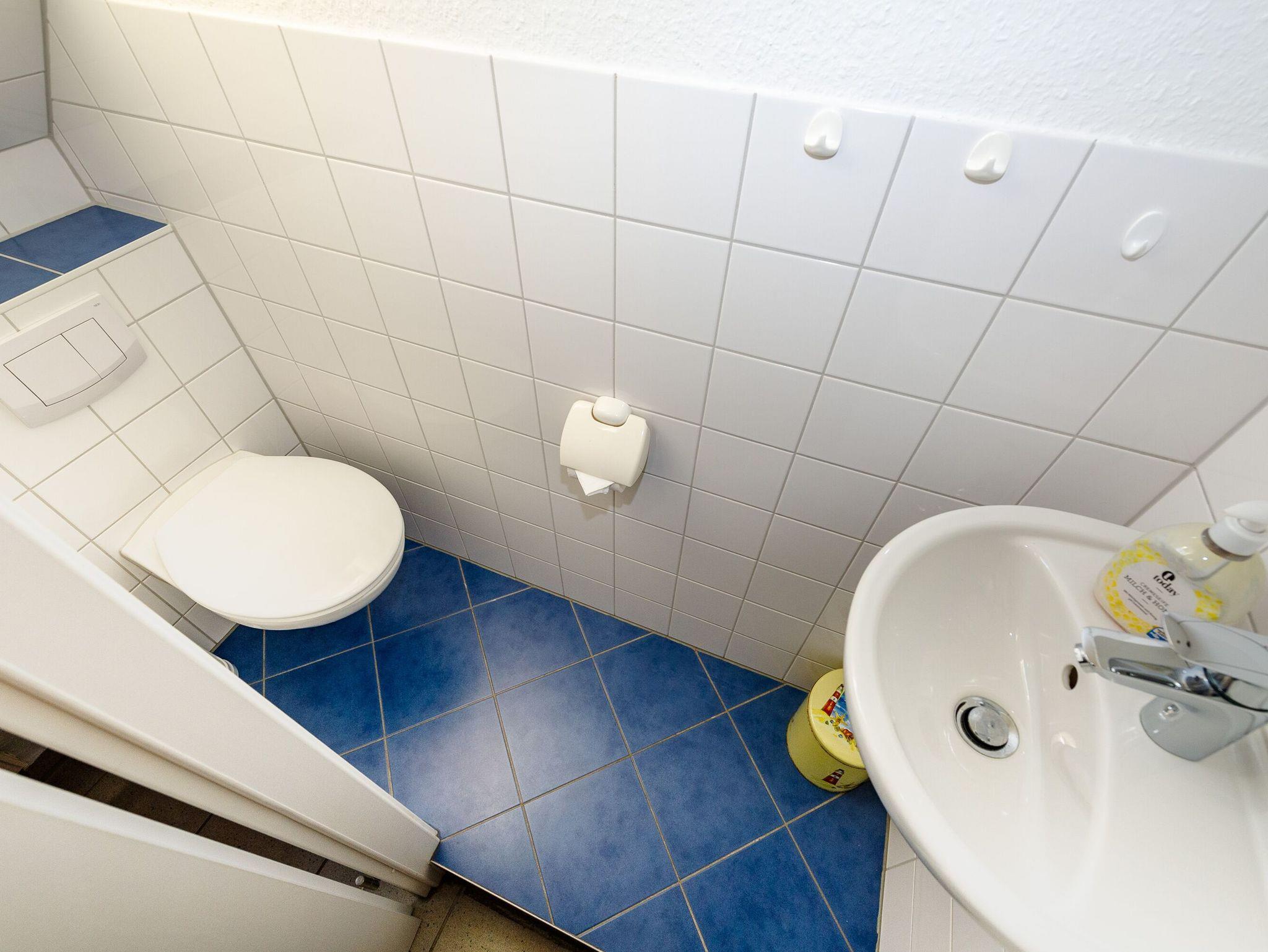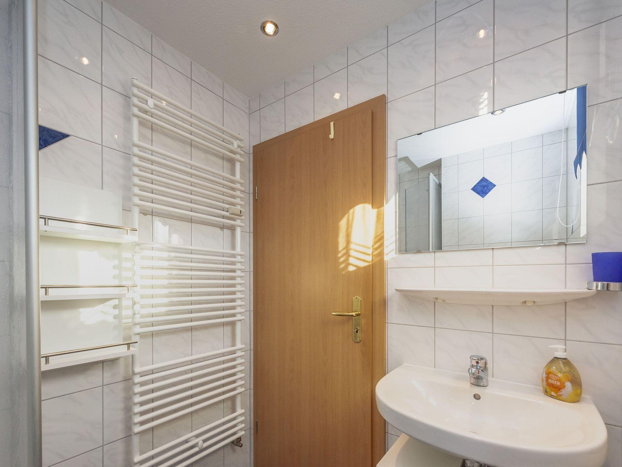 Das Badezimmer im Erdgeschoss ist mit Dusche/WC und einem beleuchteten Waschtisch mit Spiegel und Fön ausgestattet. Ein zusätzliches Waschbecken mit Spiegel bietet das Gäste-WC im Obergeschoss.