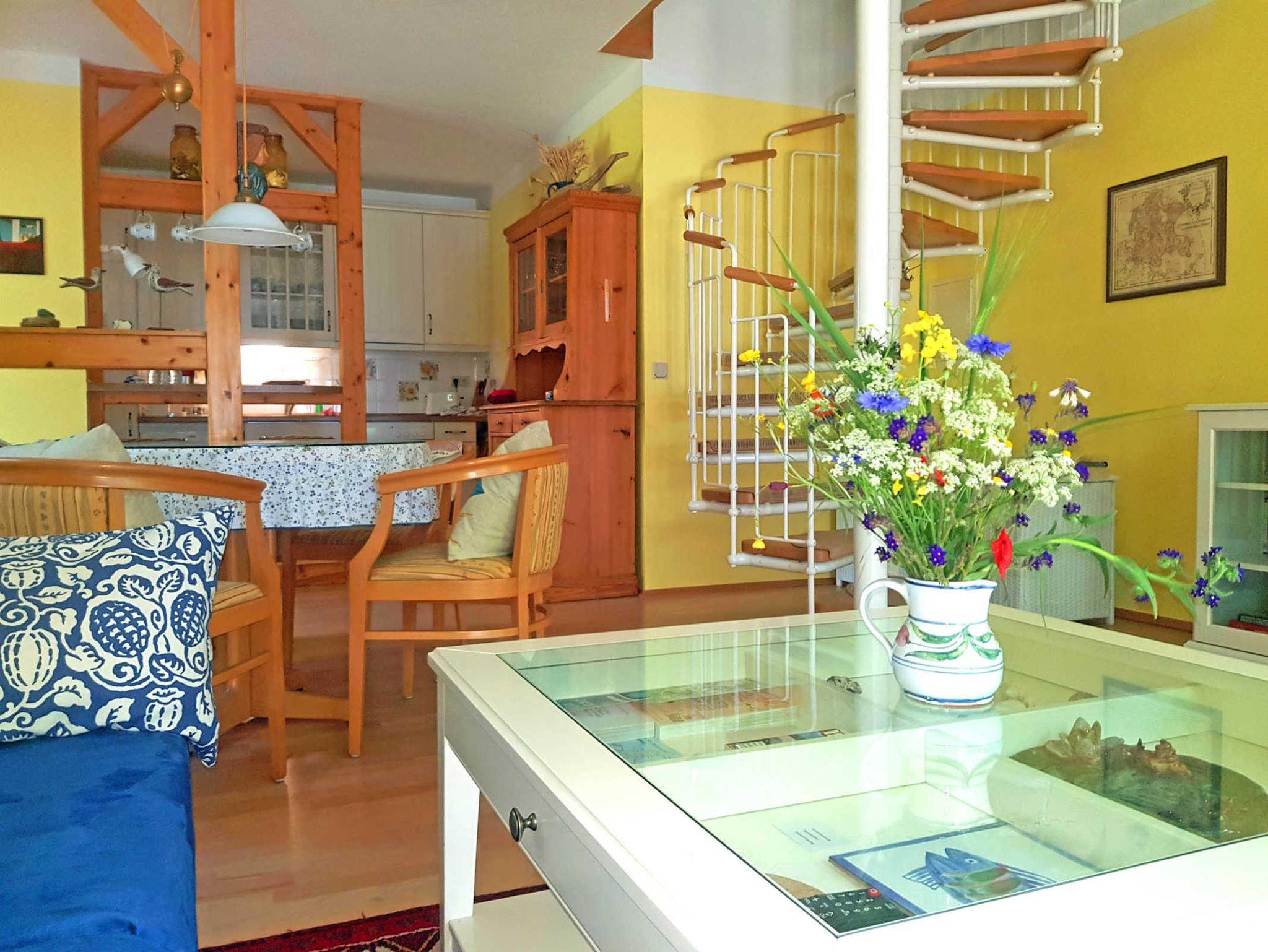 Sie liegt an der östlichen Giebelseite des Hauptgebäudes mit separatem Eingang und Zugang zum Meer auf kürzestem Weg. Die Wohnung misst über zwei Etagen großzügige 68 qm. Der stilvoll eingerichtete Wohn-Essbereich mit Flatscreen-TV, Radio, Telefon einer komplett ausgestatteten Küche (Wasch- und Spülmaschine, Backofen mit 4-Zonen-Ceranfeld etc.) mit Küchentresen befindet sich im Erdgeschoss.