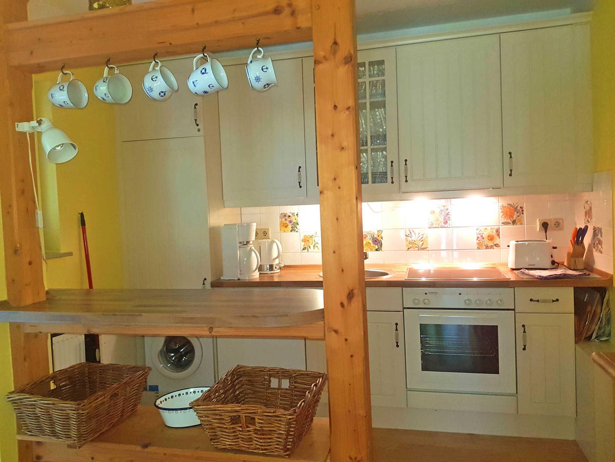 Die Wohnung misst über zwei Etagen großzügige 68 qm. Der stilvoll und individuell eingerichtete Wohn-Essbereich hat WLAN, Radio einen großen Flatscreen-TV mit DVD/Blueray-Player. Die Küche ist umfangreich ausgestattet mit Spülmaschine, Waschmaschine, Backofen, 4-Zonen-Cerankochfeld und einem praktischen Tresen.