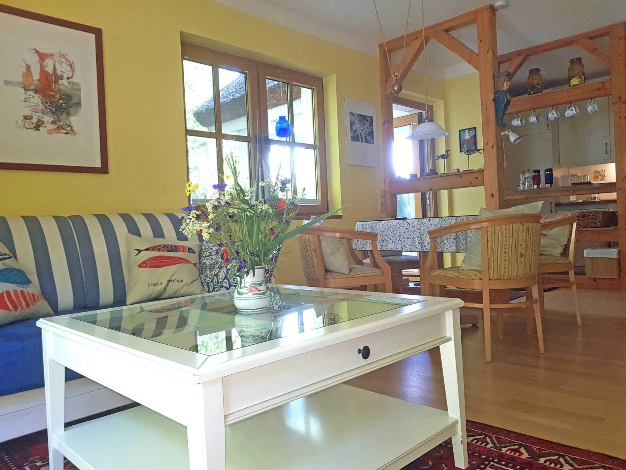 Das Wohnzimmer führt direkt auf die geschützt gelegene möblierte Terrasse mit Boddenblick.