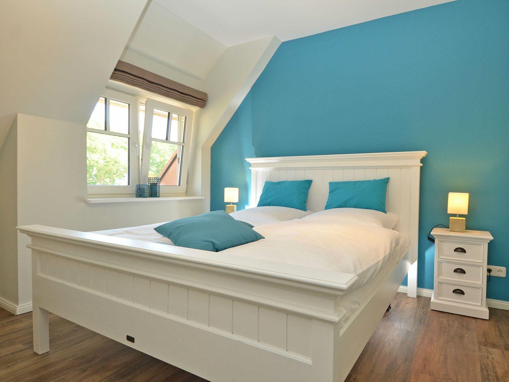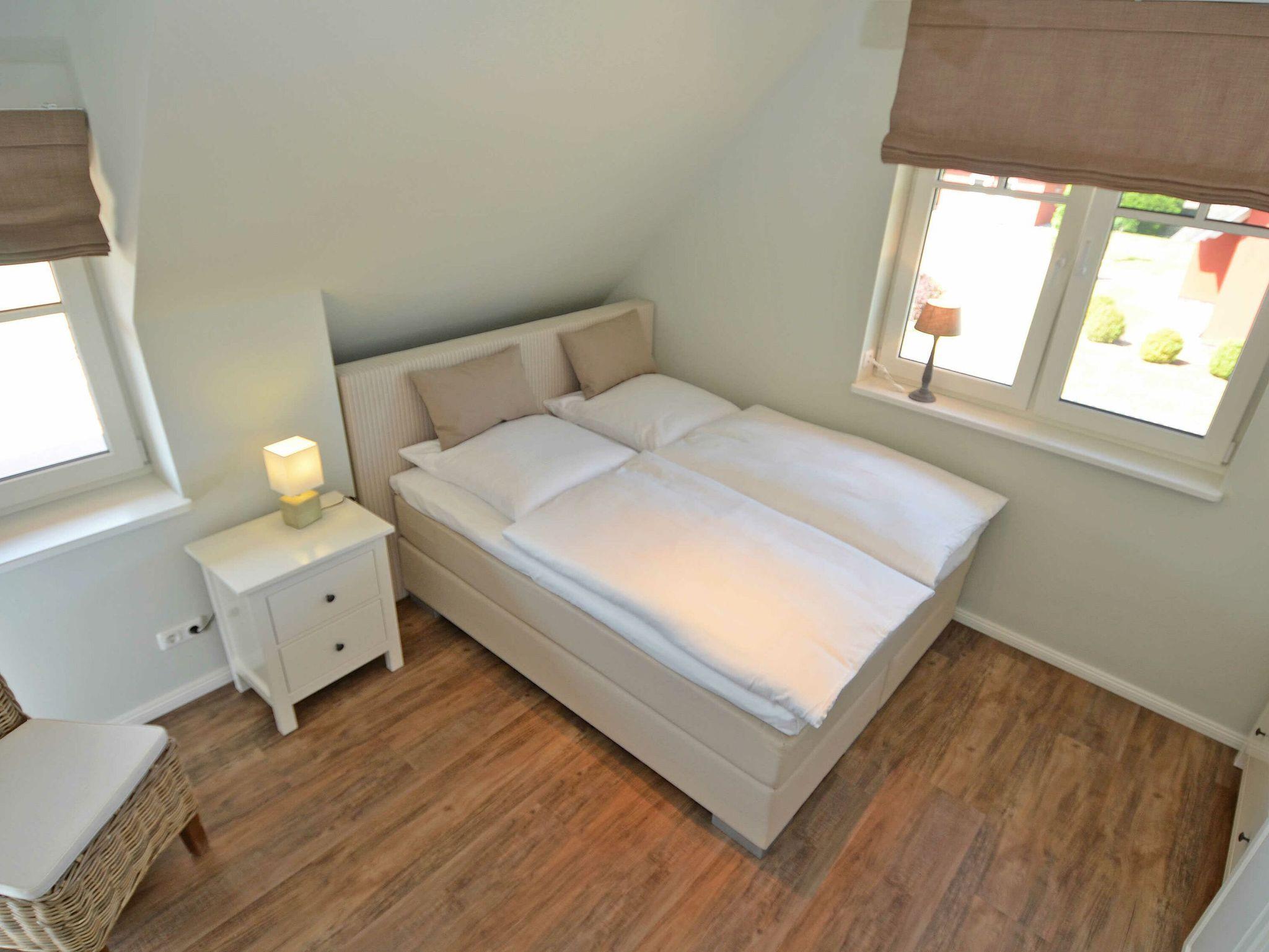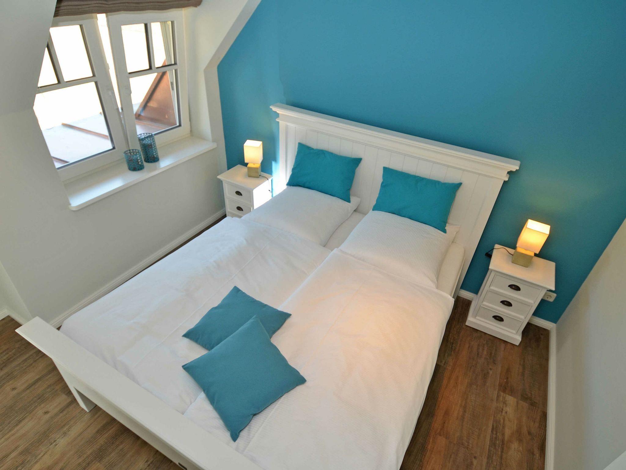 Über eine Treppe gelangen Sie in das Obergeschoß. Pro Haushälfte erwarten Sie hier 3 Schlafzimmer - 2 davon mit einem Doppelbett (Box-Spring-Betten) der Größe 180x200 cm/160x200cm und einem eigenem TV. Das dritte Schlafzimmer ist mit einem Landhaus-Doppelbett Größe 160x200 cm ausgestattet. Ein Kinderreisebett steht ebenfalls zur Verfügung.