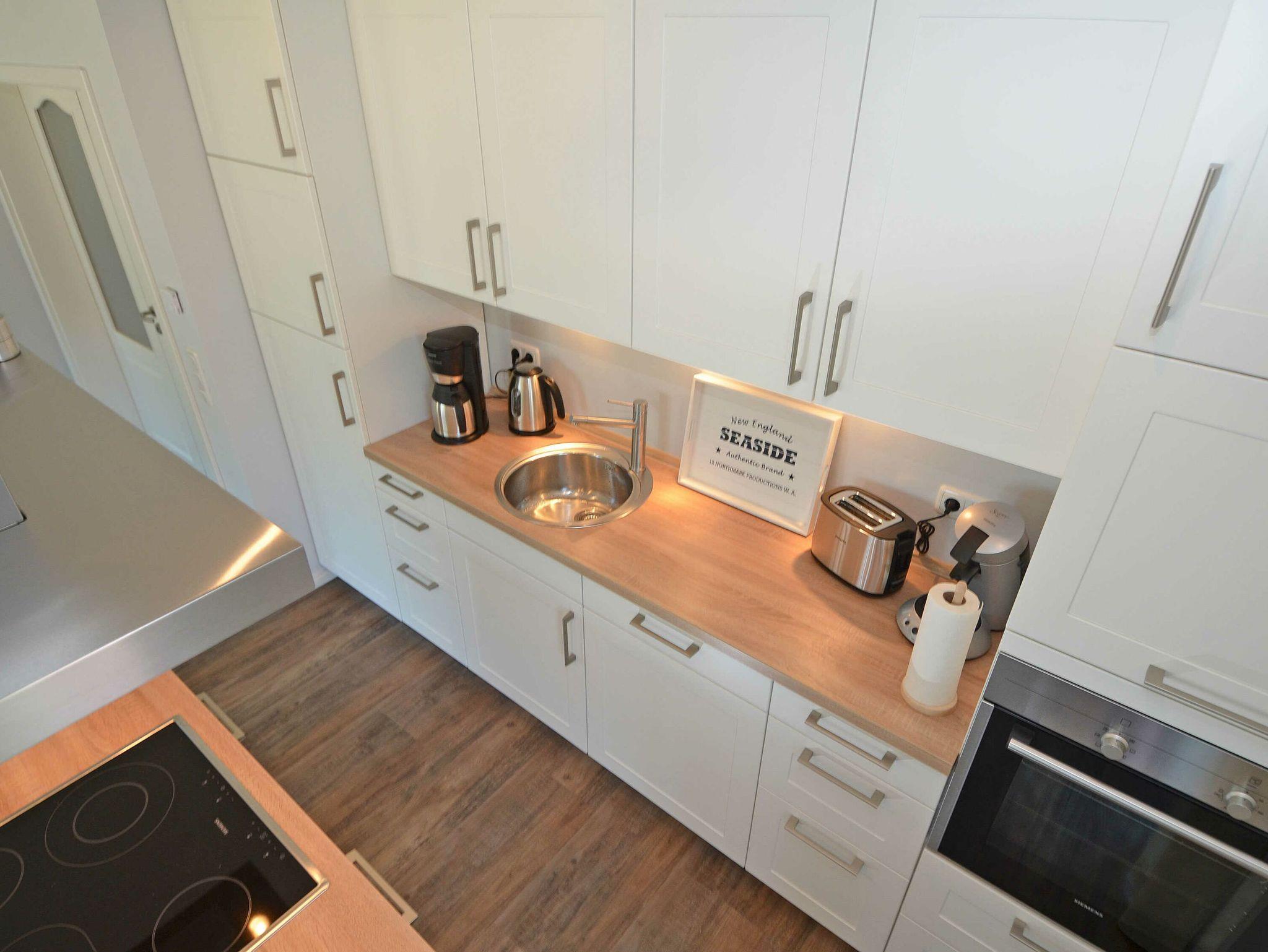 Die harmonisch im Wohnbereich integrierte Küchenzeile mit einem Backofen, einer Mikrowelle, einem Geschirrspüler, einem großen Kühlschrank mit Gefrierfach, einer Kaffeemaschine, einer Krups-Nespressomaschine für Kaffeespezialitäten, Toaster, Wasserkocher und diversem Kleininventar lässt das Herz jeden Hobbykochs höher schlagen. Selbst an der freistehenden Kochinsel haben Sie Blick aufs Meer.