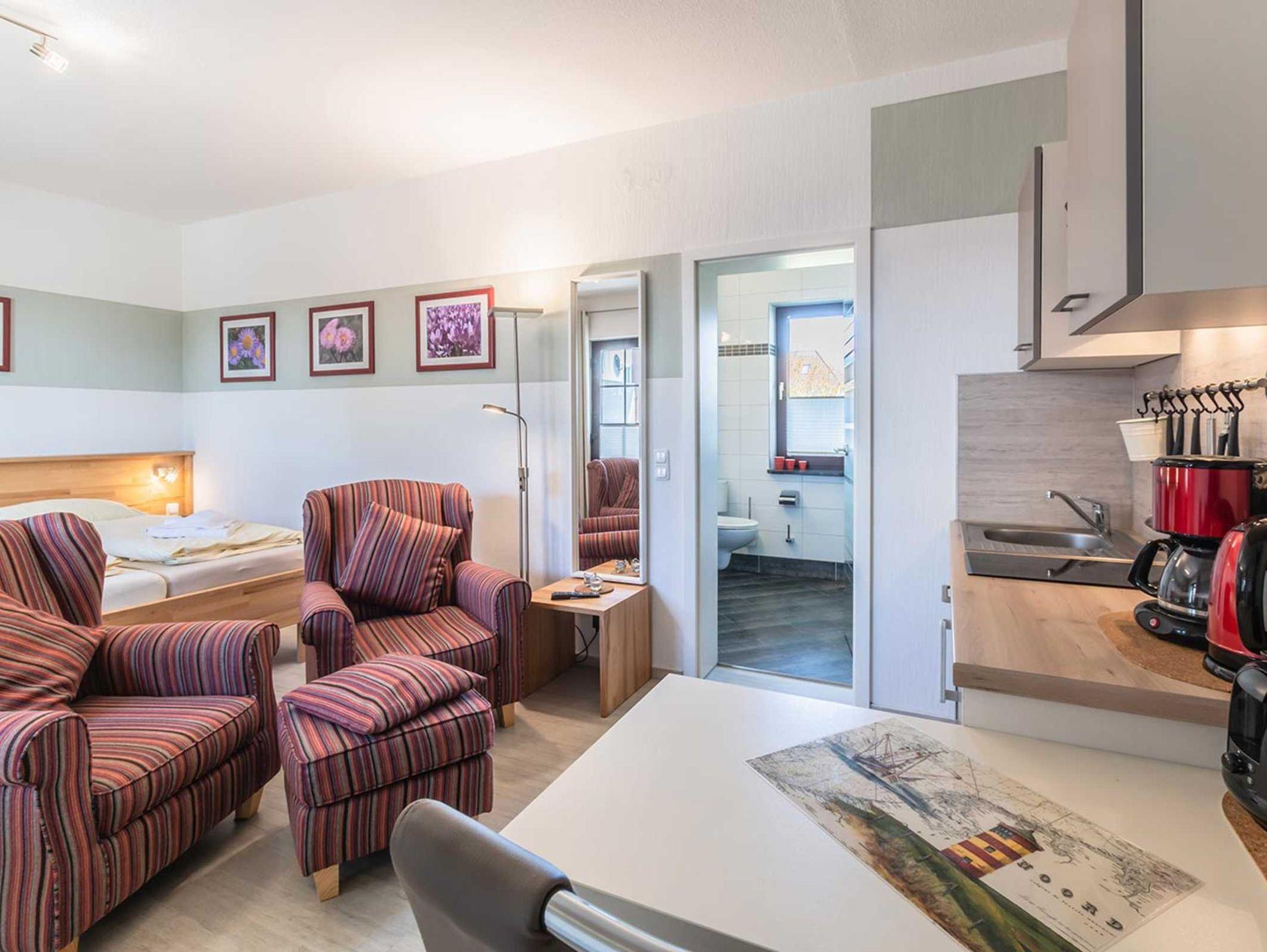 Diese schön eingerichtete 1-Raum Ferienwohnung (Nichtraucher) für bis zu 2 Personen ist ca. 26 m² groß und befindet sich in der linken Haushälfte im Erdgeschoss. Sie wurde komplett neu renoviert und ist hochwertig eingerichtet.