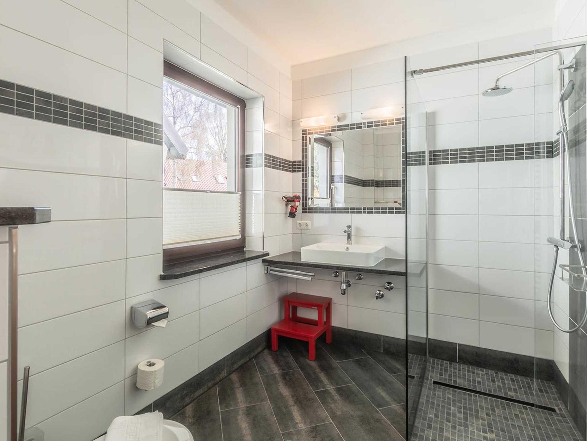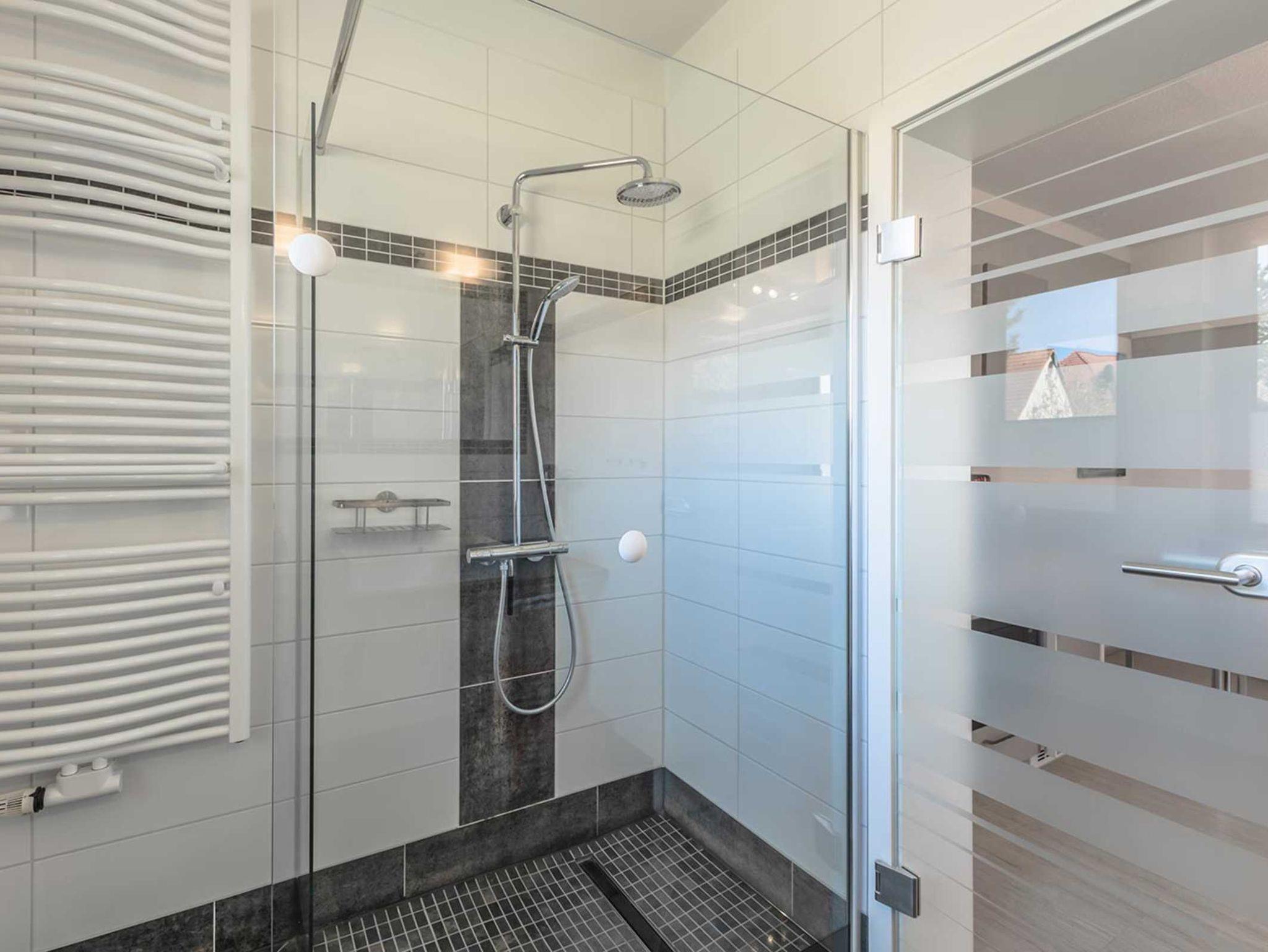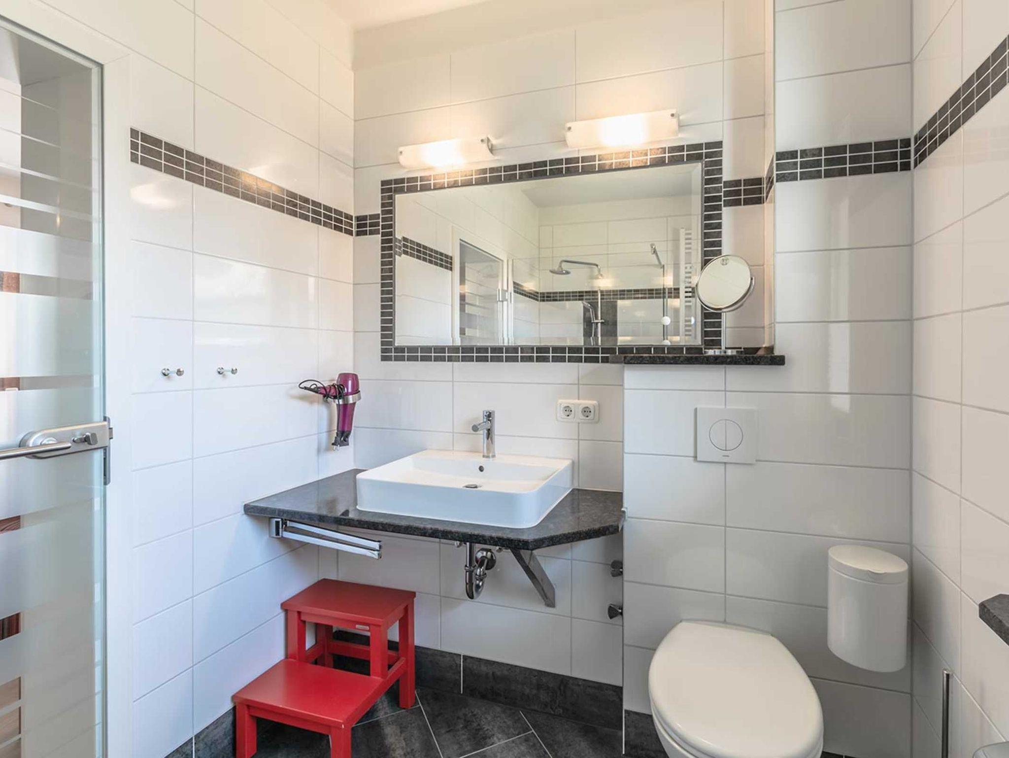 Das Badezimmer (mit Fenster) verfügt über eine Dusche, Waschtisch, WC, Handtuchtrockner und einen Fön.