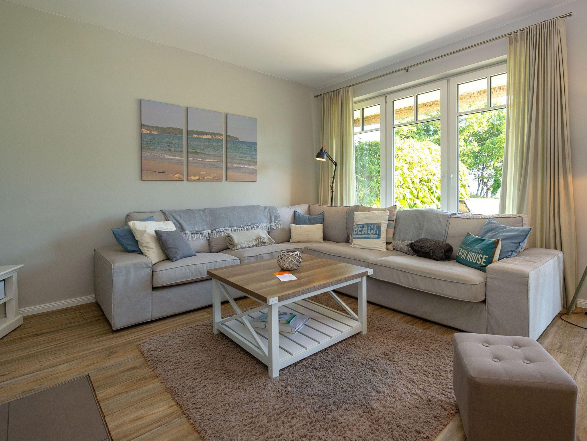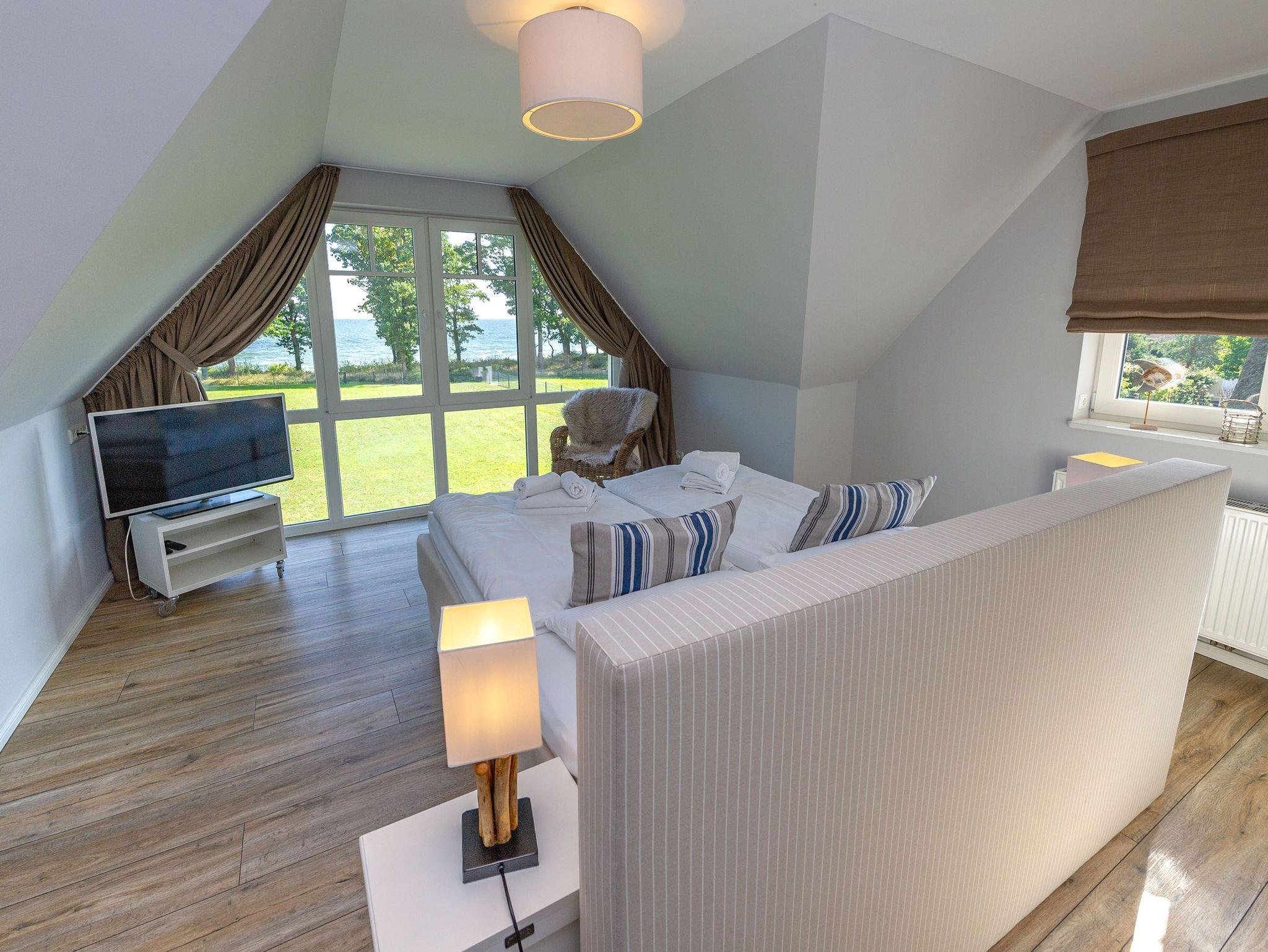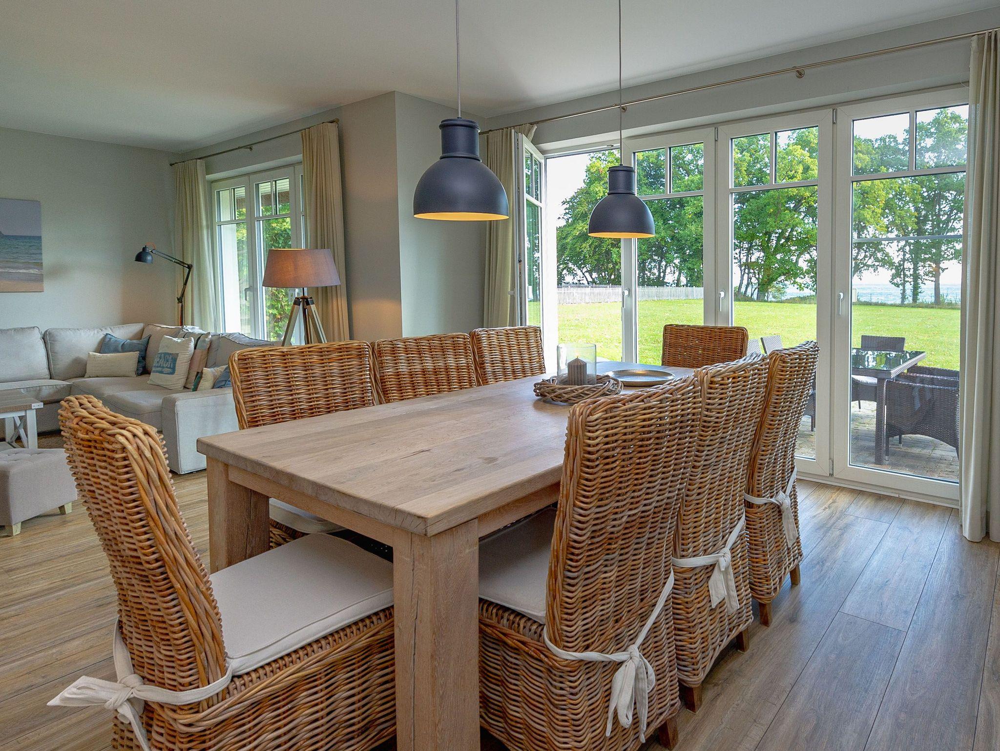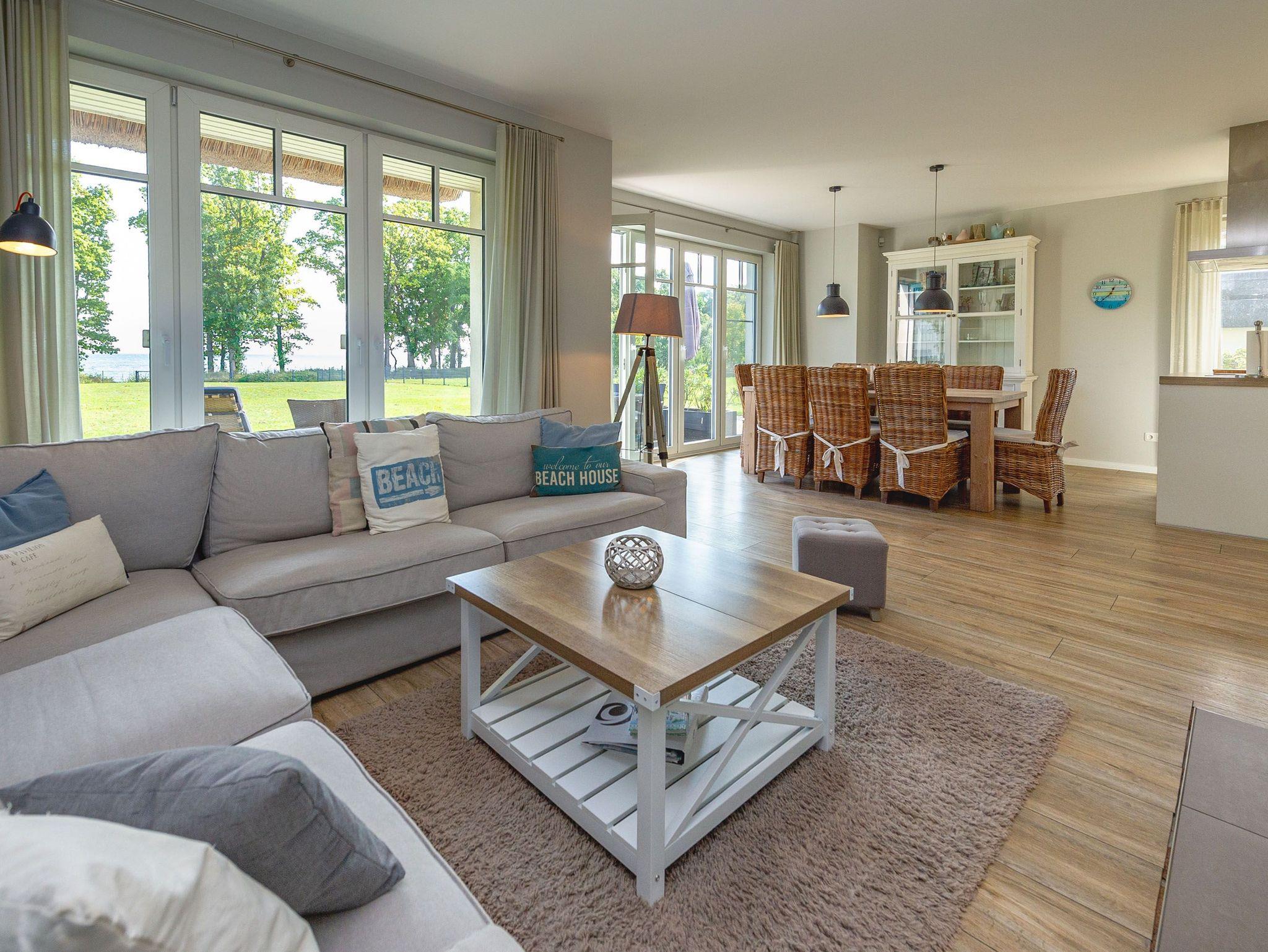 Das großzügige Wohnzimmer mit direktem Meerblick befindet sich jeweils im Erdgeschoss und ist komfortabel ausgestattet mit einer gemütlichen Sitzecke, einem Flachbild-TV mit DVD-Player, einer Stereoanlage mit CD-Player/Radio/I-pod-Dockingstation. Der zweiseitig verglaste Kamin verspricht kuschelige Stunden vor dem prasselnden Kaminfeuer. Die großen Glasfronten durchfluten den Raum mit Licht und eröffnen den ungehinderten Blick auf die endlose Weite der Ostsee.
