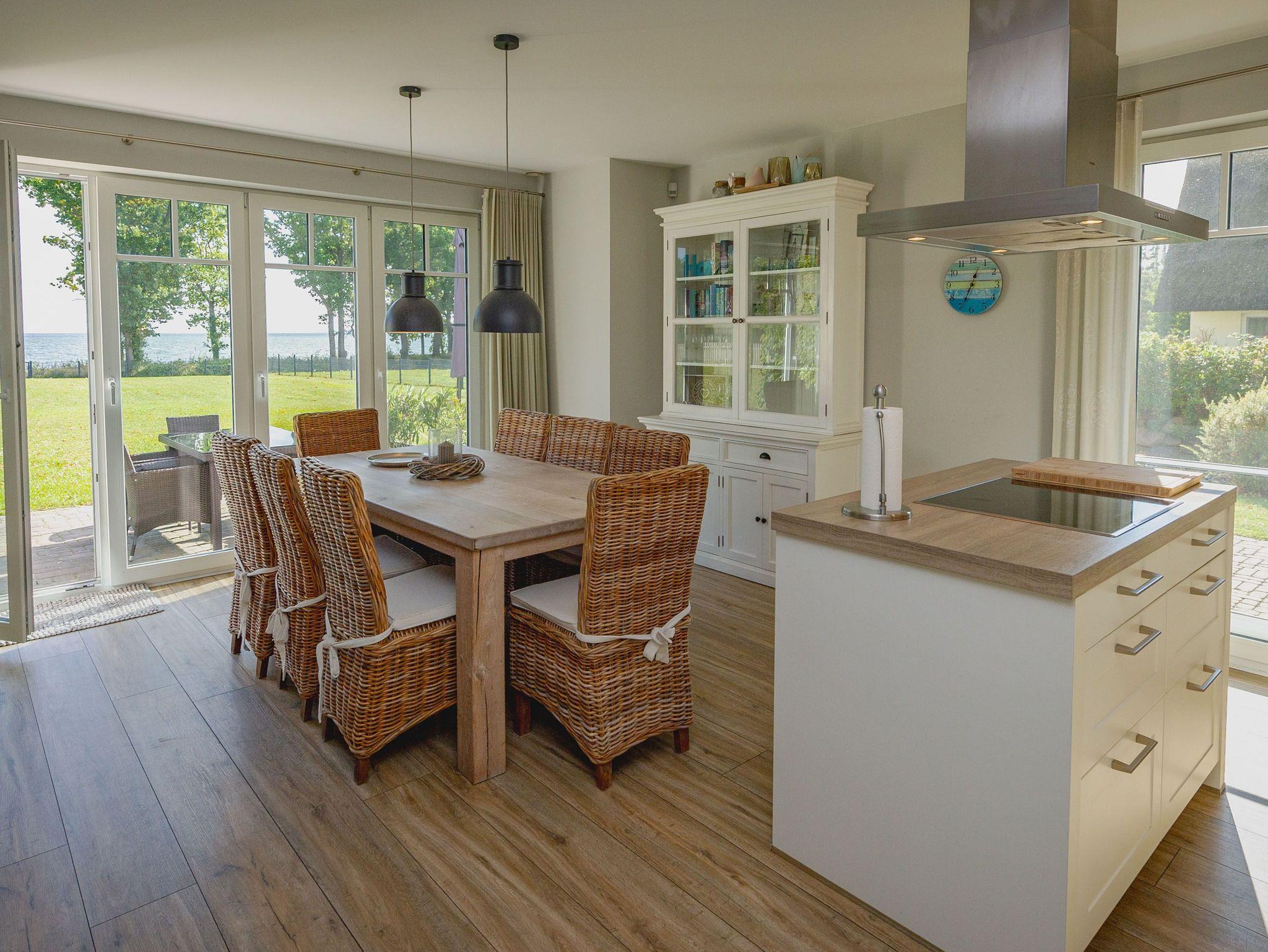 Die harmonisch im Wohnbereich integrierte Küchenzeile mit einem Backofen, einer Mikrowelle, einem Geschirrspüler, einem großen Kühlschrank mit Gefrierfach, einer Kaffeemaschine, einer Krups-Nespressomaschine für Kaffeespezialitäten, Toaster, Wasserkocher und diversem Kleininventar lässt das Herz jeden Hobbykochs höher schlagen. Selbst an der freistehenden Kochinsel haben Sie Blick aufs Meer. Ein großer Esstisch aus Holz mit markanter Oberfläche ermöglicht bis zu 6 Personen ein anregendes Mahl.