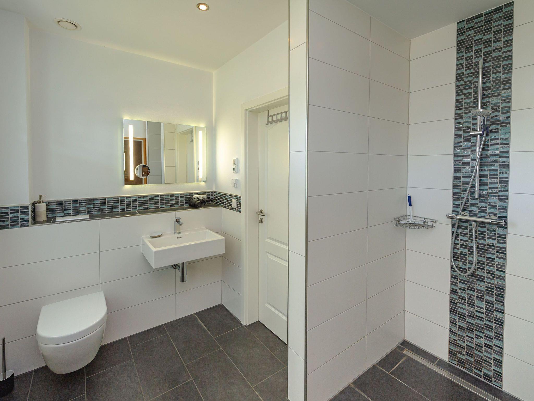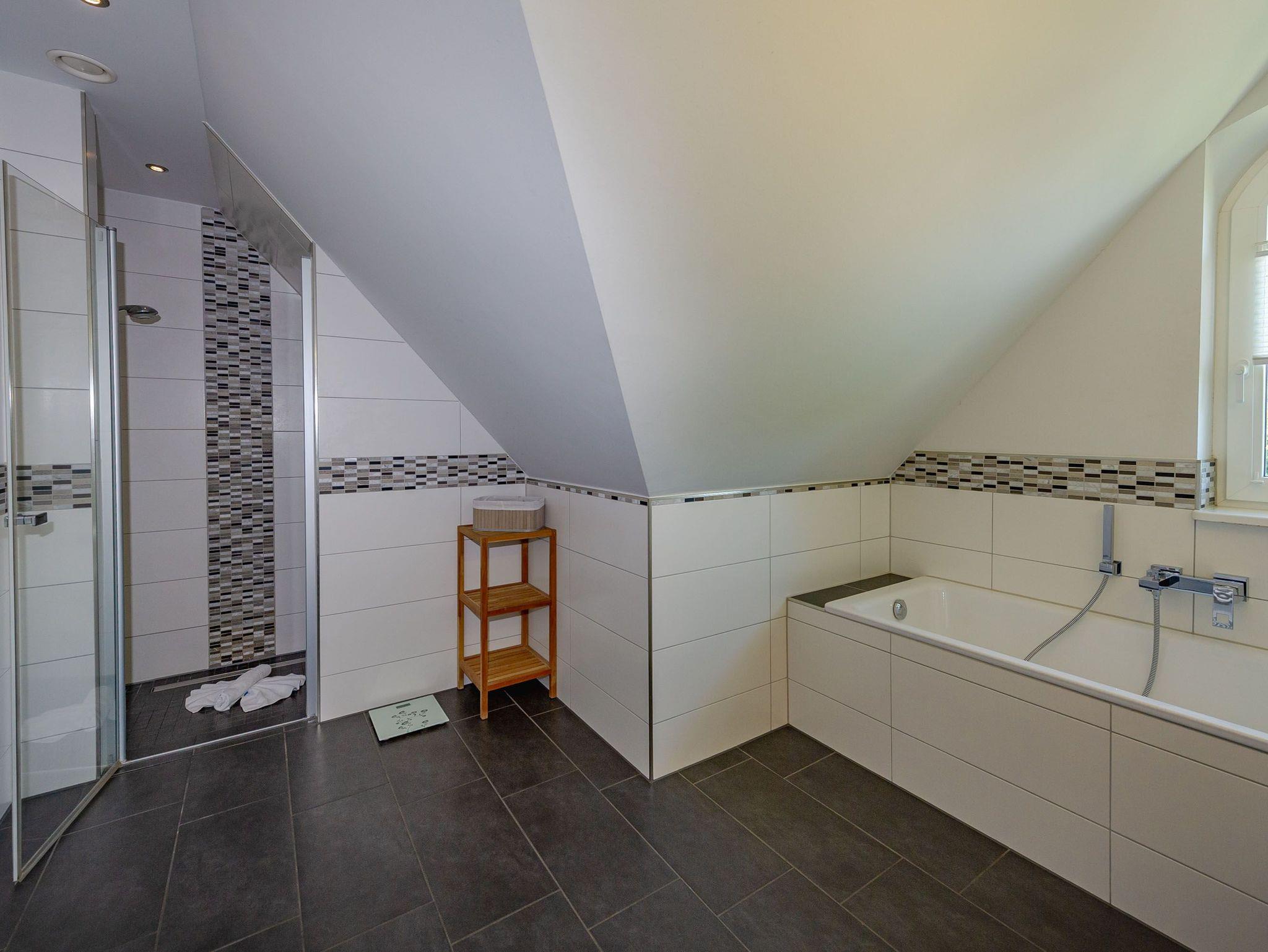 Auf dieser Ebene befindet sich auch das zweite Duschbad mit Dusche, WC, Handtuchtrockner und Fön. Dieses verfügt zusätzlich über eine Badewanne, damit auch im Urlaub das Wellnessgefühl nicht zu kurz kommt.