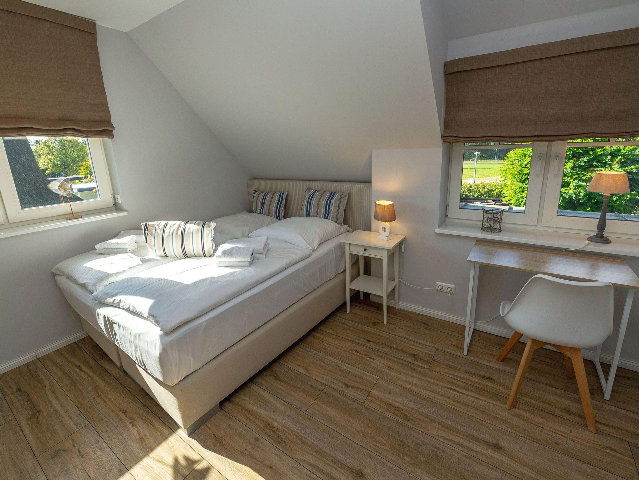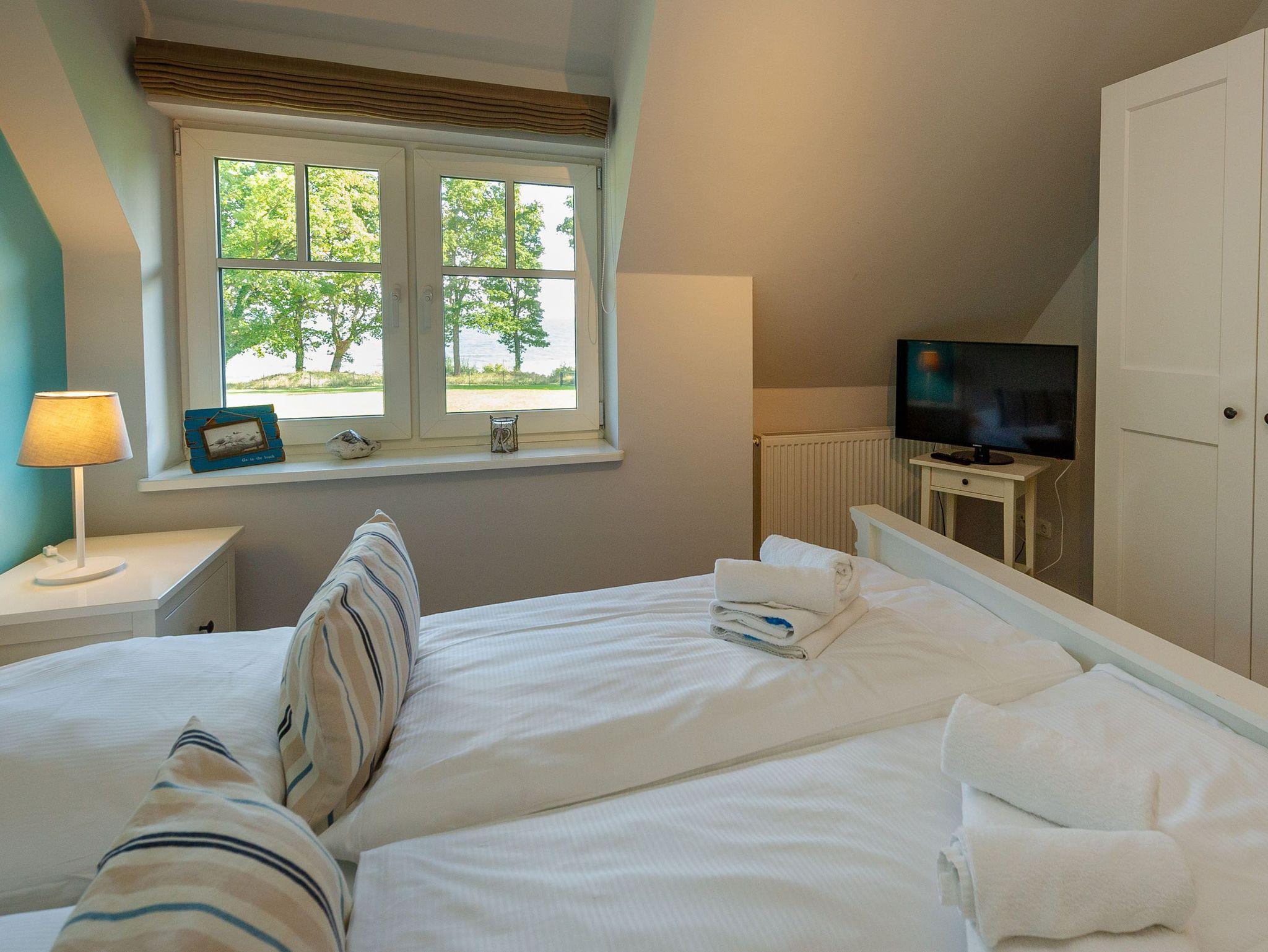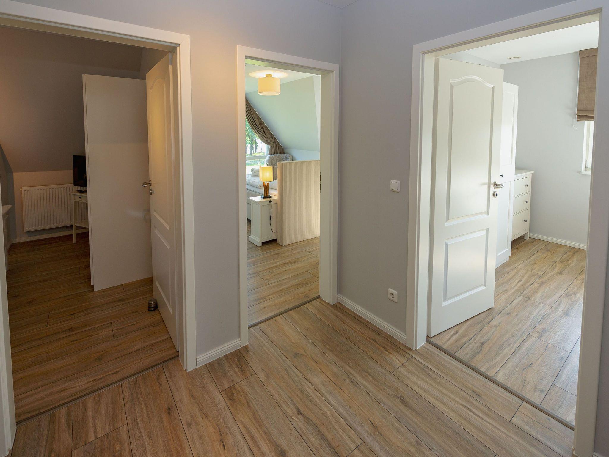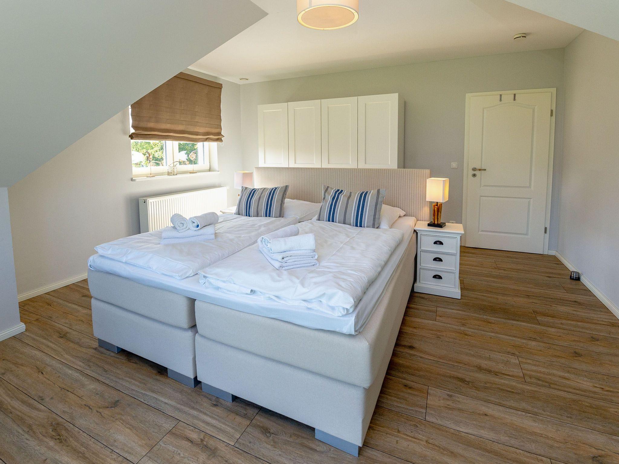 Über eine Treppe gelangen Sie in das Obergeschoss. Dort erwarten Sie Ihre drei Schlafzimmer - zwei davon mit Boxspring-Doppelbetten (180x200 cm/160x200cm) und einem eigenem TV. Das dritte Schlafzimmer ist mit einem Landhaus-Doppelbett Größe (160x200) cm ausgestattet. Ein Kinderreisebett steht ebenfalls zur Verfügung.