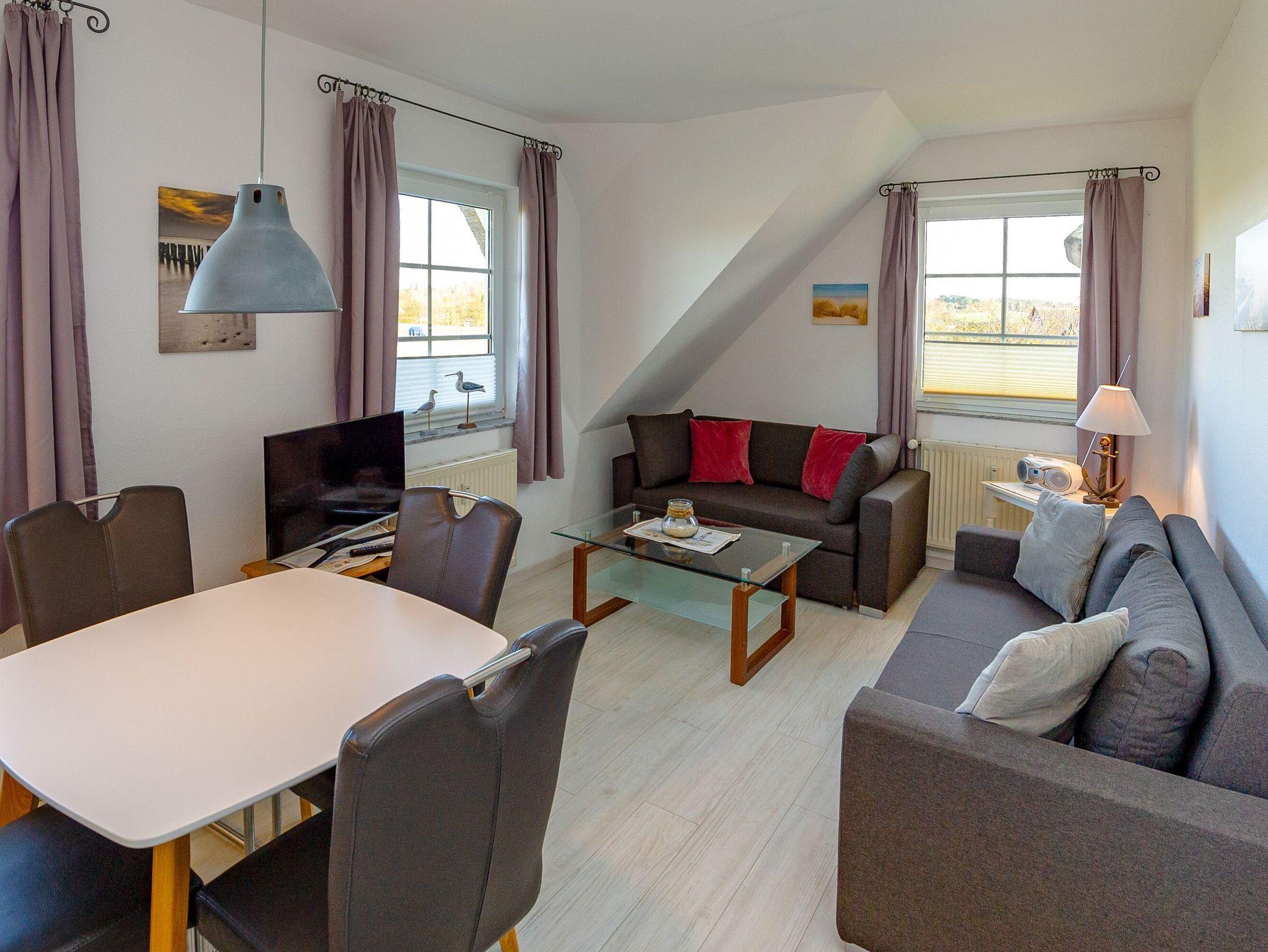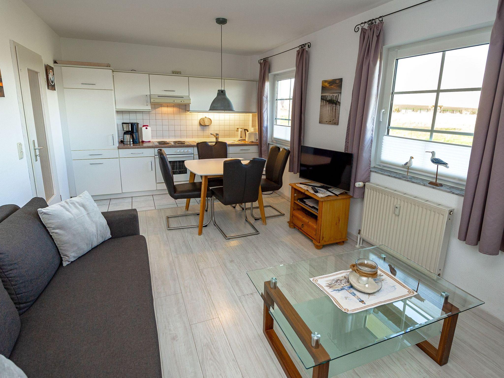 Das kombinierte Wohn- und Esszimmer mit integrierter Küche ist das Herzstück Ihres Zuhauses auf Zeit. Zwei Couchen - eine davon als Aufbettungsmöglichkeit für zwei Personen nutzbar - laden zum Platz nehmen ein. Ein Fernseher, ein Radio und kostenfrei verfügbares W-LAN sorgen für mediale Unterhaltung. Schmökern Sie Ihr Lieblingsbuch, schmieden Sie Pläne für den nächsten Urlaubstag oder lassen Sie einfach nur so die Seele baumeln.