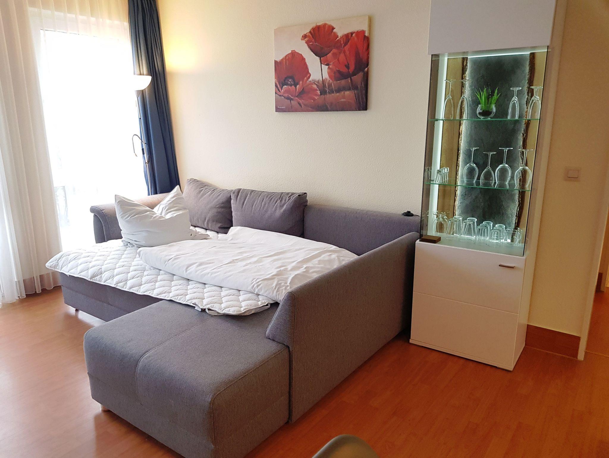 • Wohnzimmer mit ausziehbarer Couch und Esstisch für 4 Personen