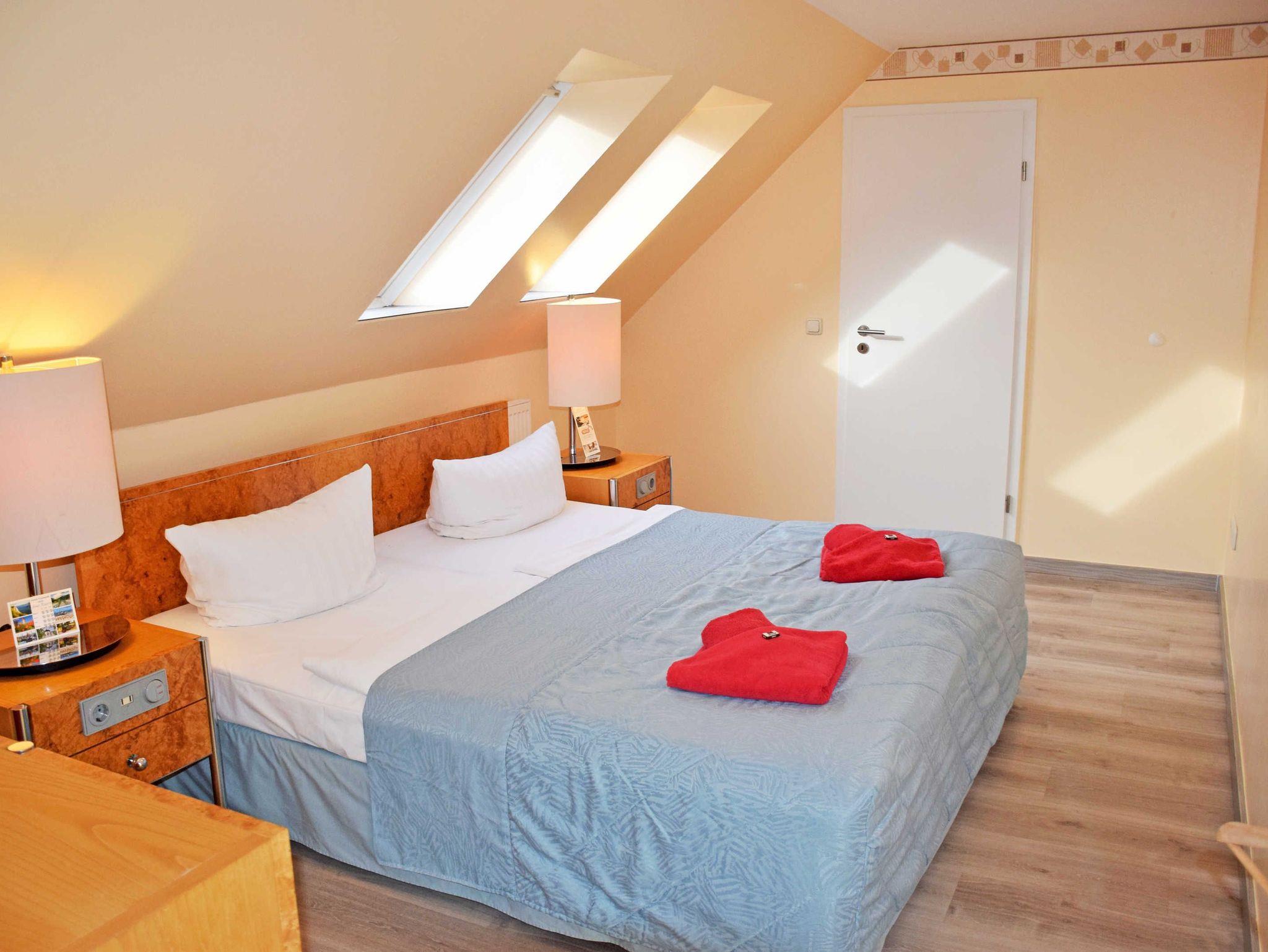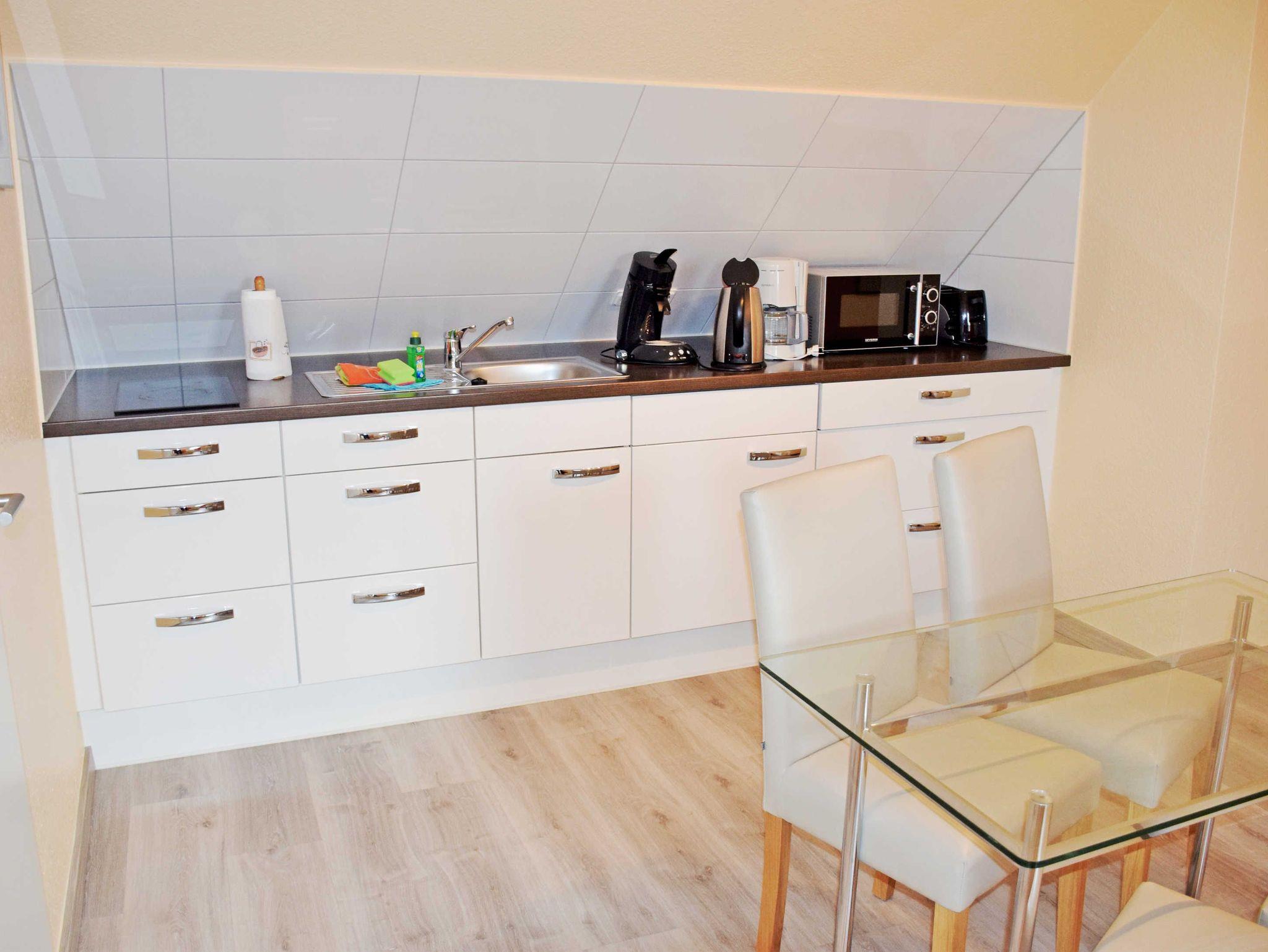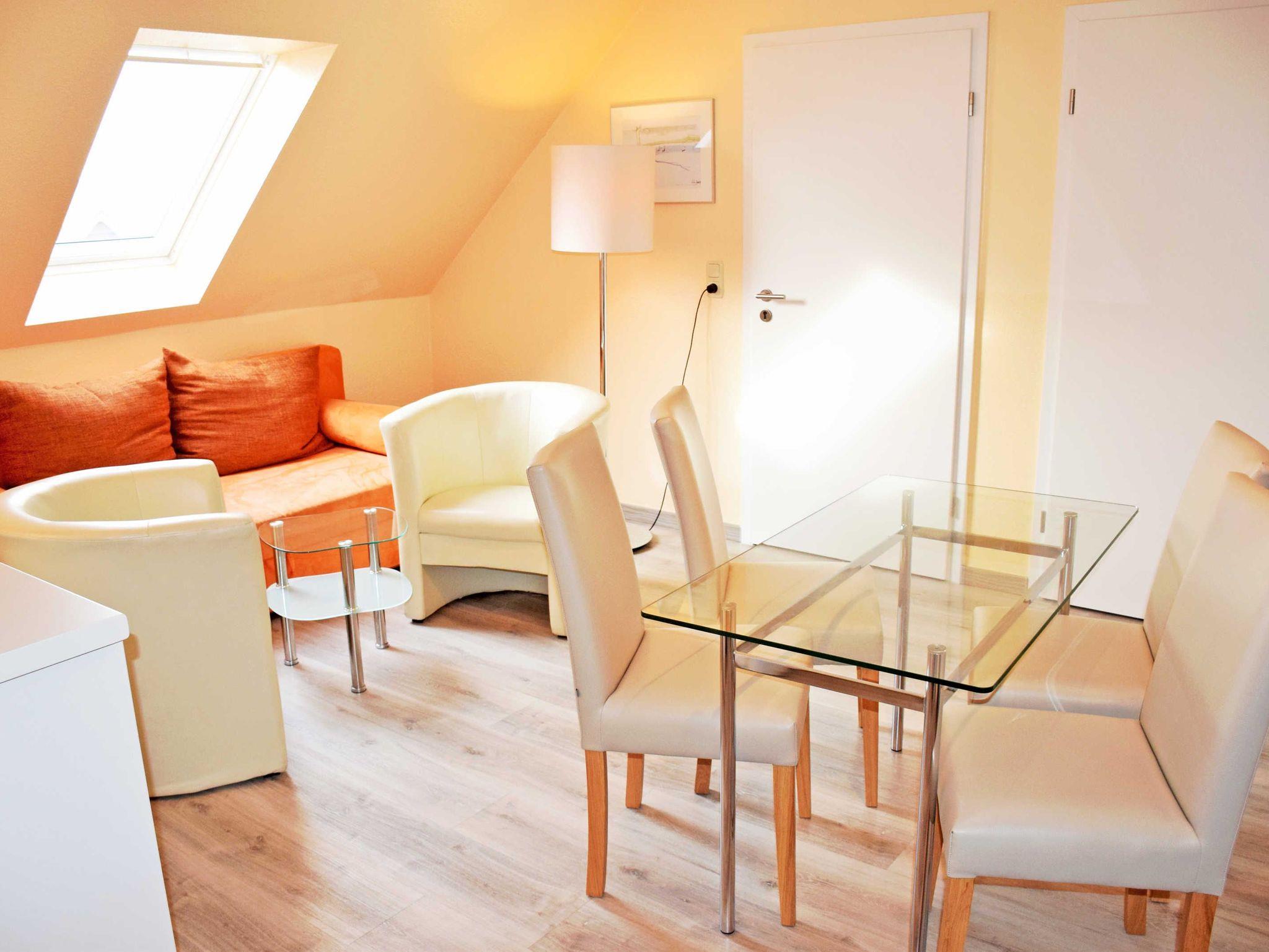Die Ferienwohnung liegt im Hotelgebäude und ist ca. 51 qm groß. Sie hat Platz für maximal 4 Erwachsene und wurde modern und hochwertig eingerichtet. Im Wohnraum befinden sich eine bequeme Sitzcouch mit Tisch und ein modernes Flachbild-TV-Gerät. Hier steht auch ein Esstisch mit Stühlen. Die moderne Küchenzeile ist mit einem Herd, Mikrowelle, Wasserkocher, Kaffeemaschine, Toaster und Kühlschrank komplett ausgestattet.