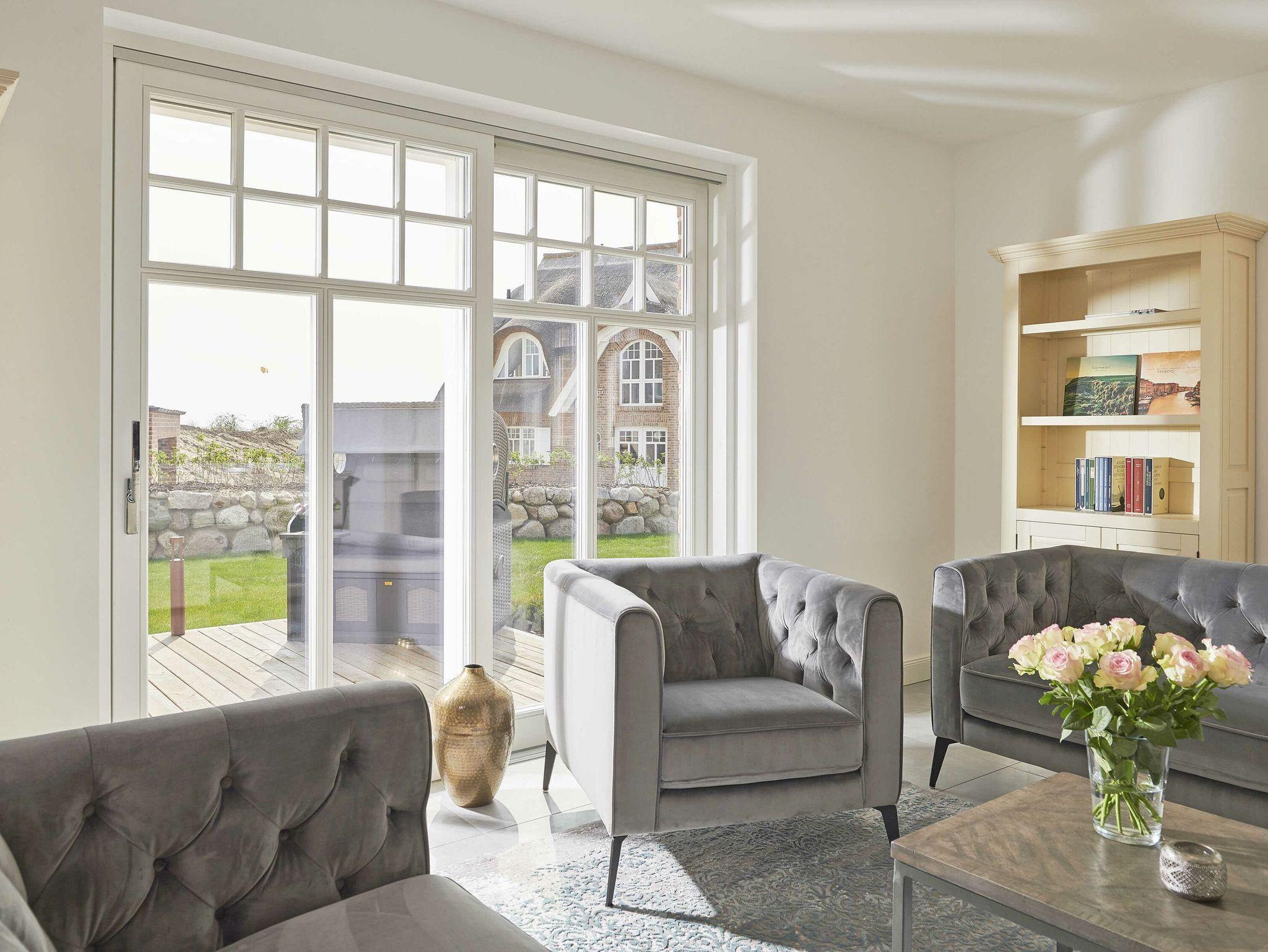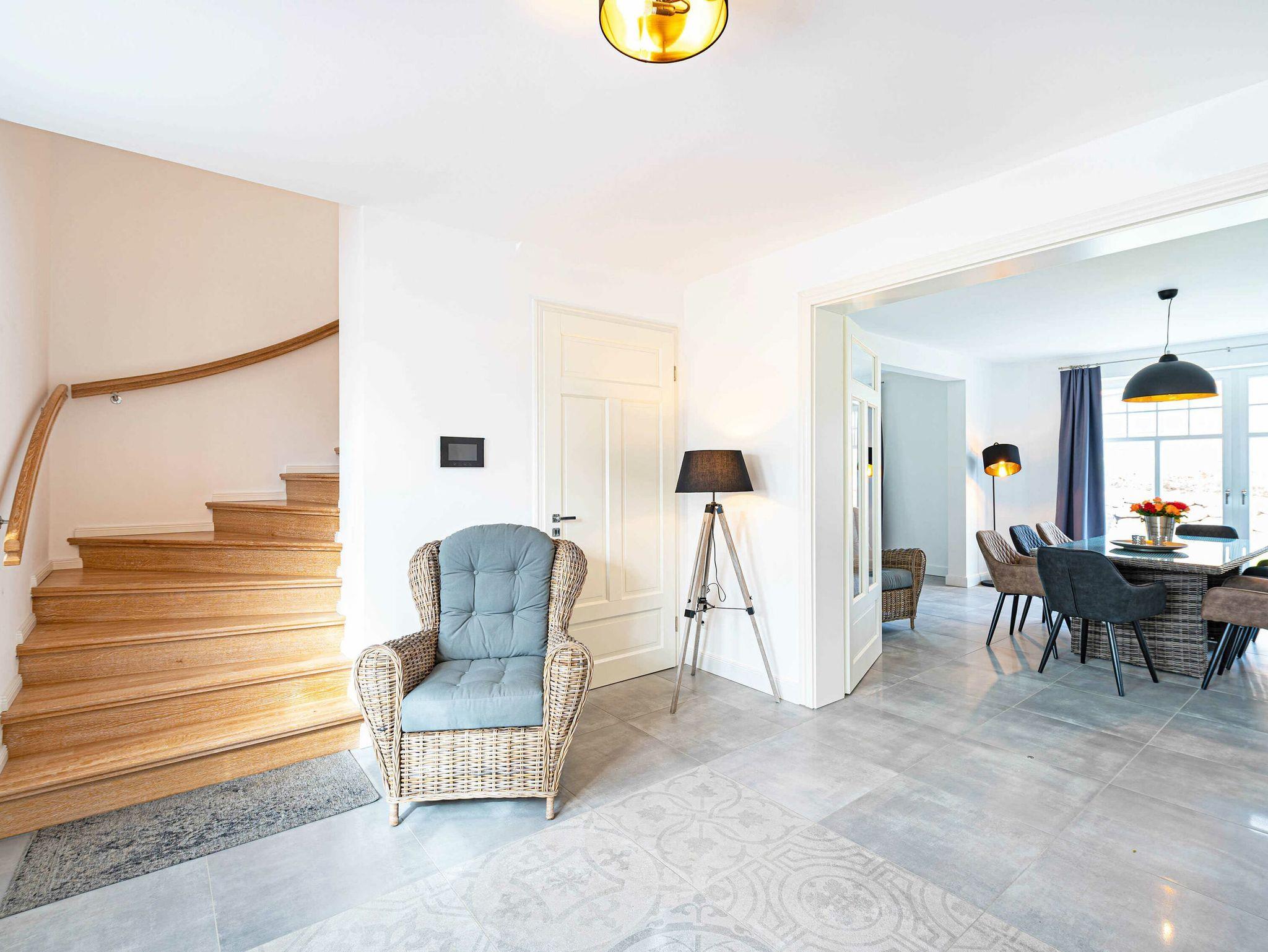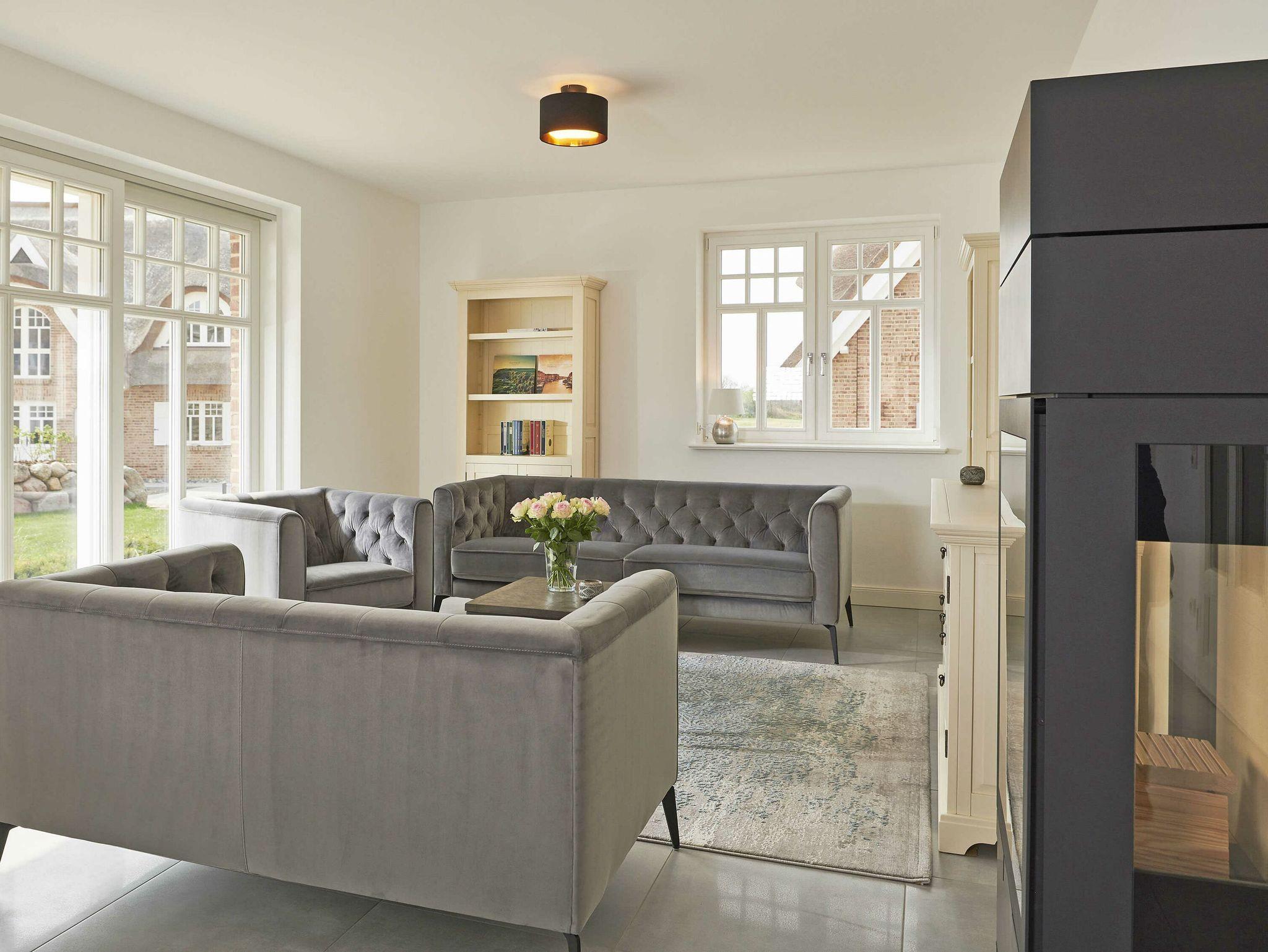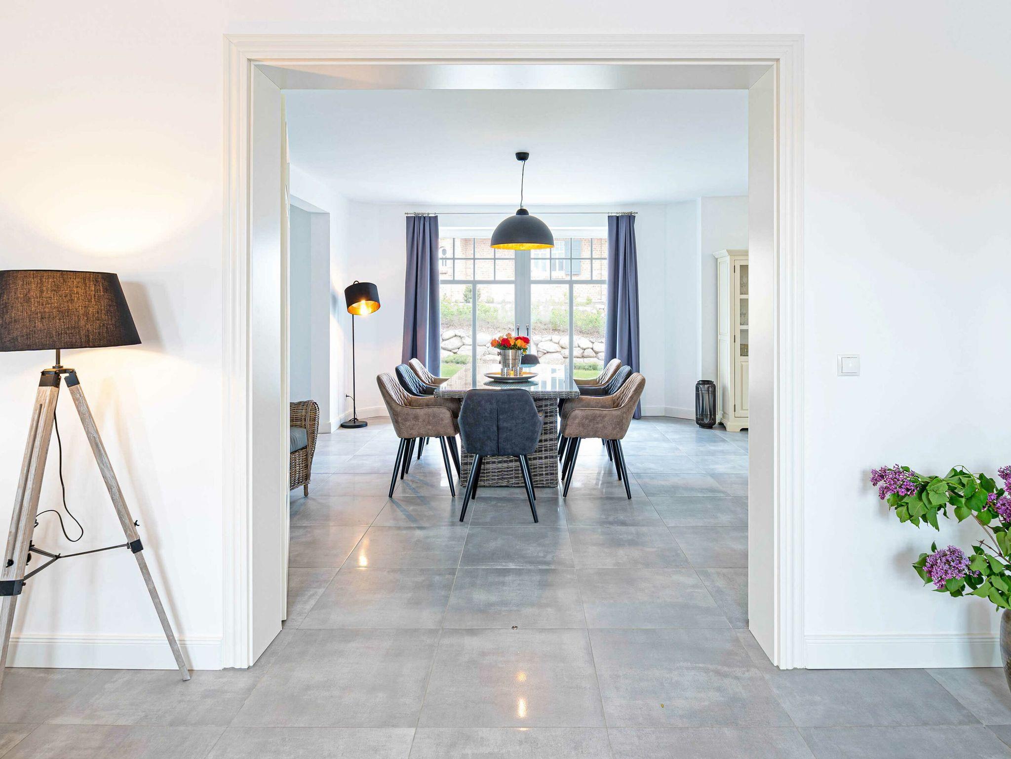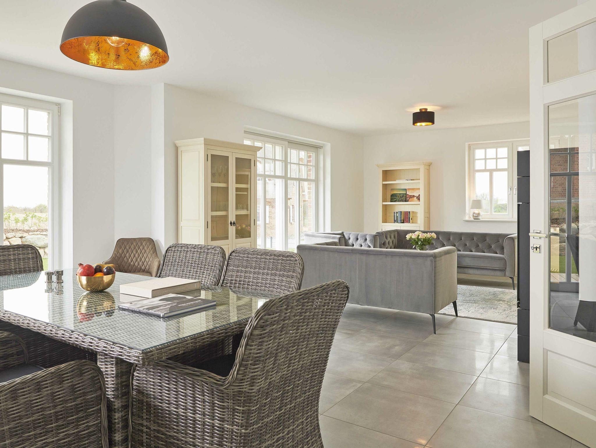 Der Wohn- und Essbereich Ihres Urlaubsdomizils mit dem Meer vor der Tür befindet sich im Erdgeschoss und ist mit eleganten Sofas, hochwertigen Echtholzmöbeln, einem großenformatigen UHD-Smart-TV sowie einem großen Esstisch ausgestattet, an dem die ganze Familie bequem Platz findet. Für Romantik und behagliche Stunden nicht nur in der kühleren Jahreszeit sorgt der Kamin.