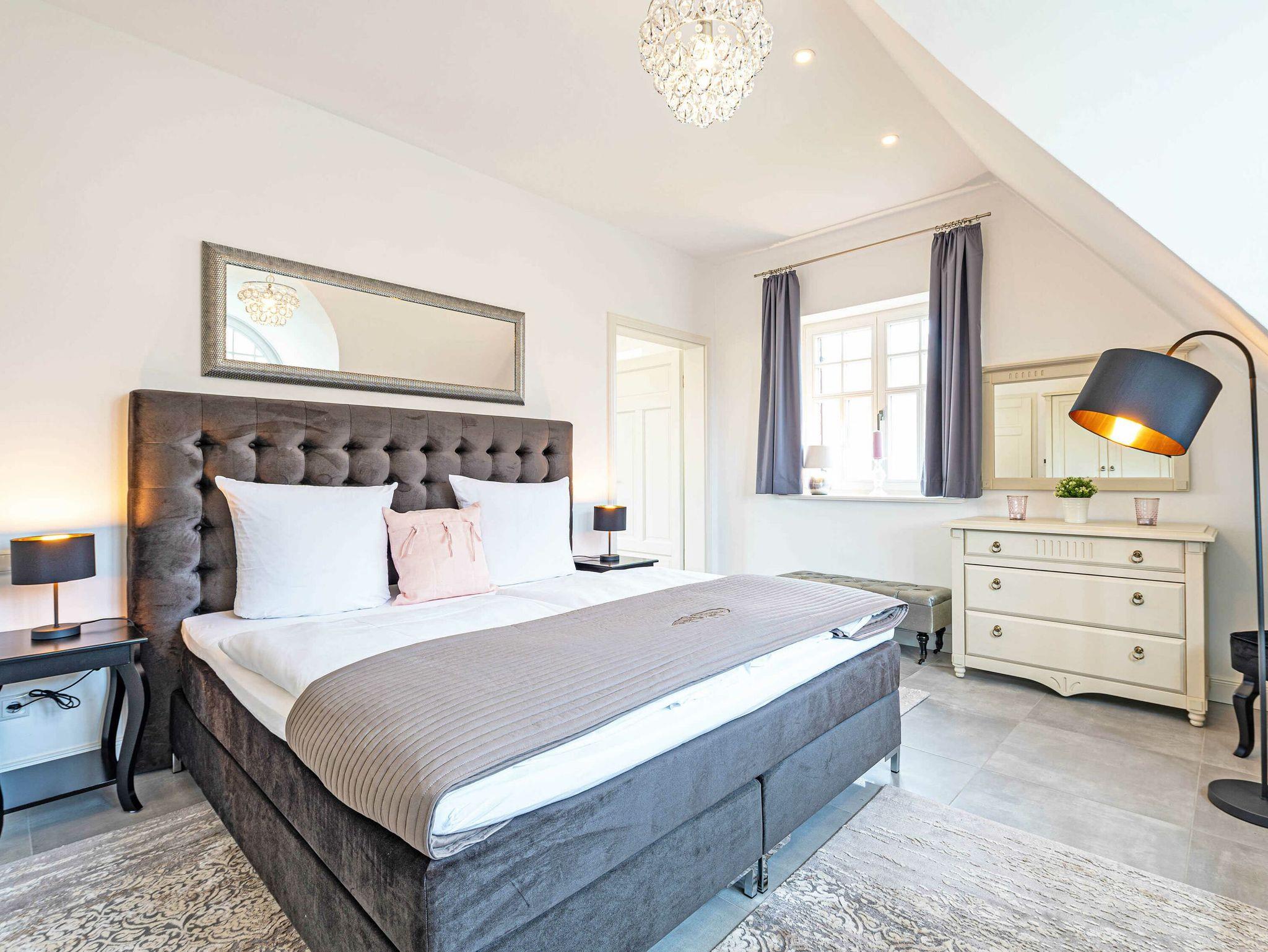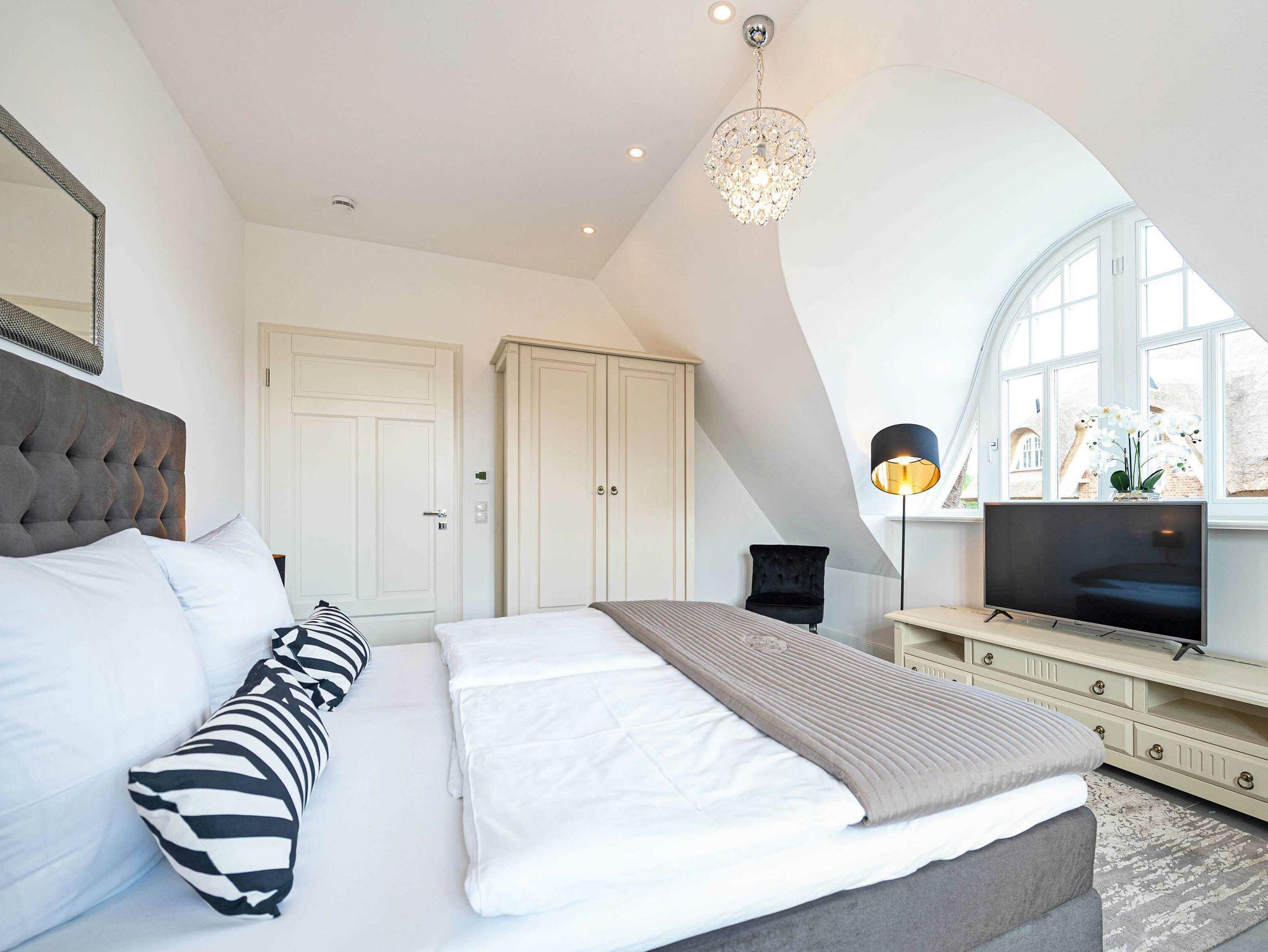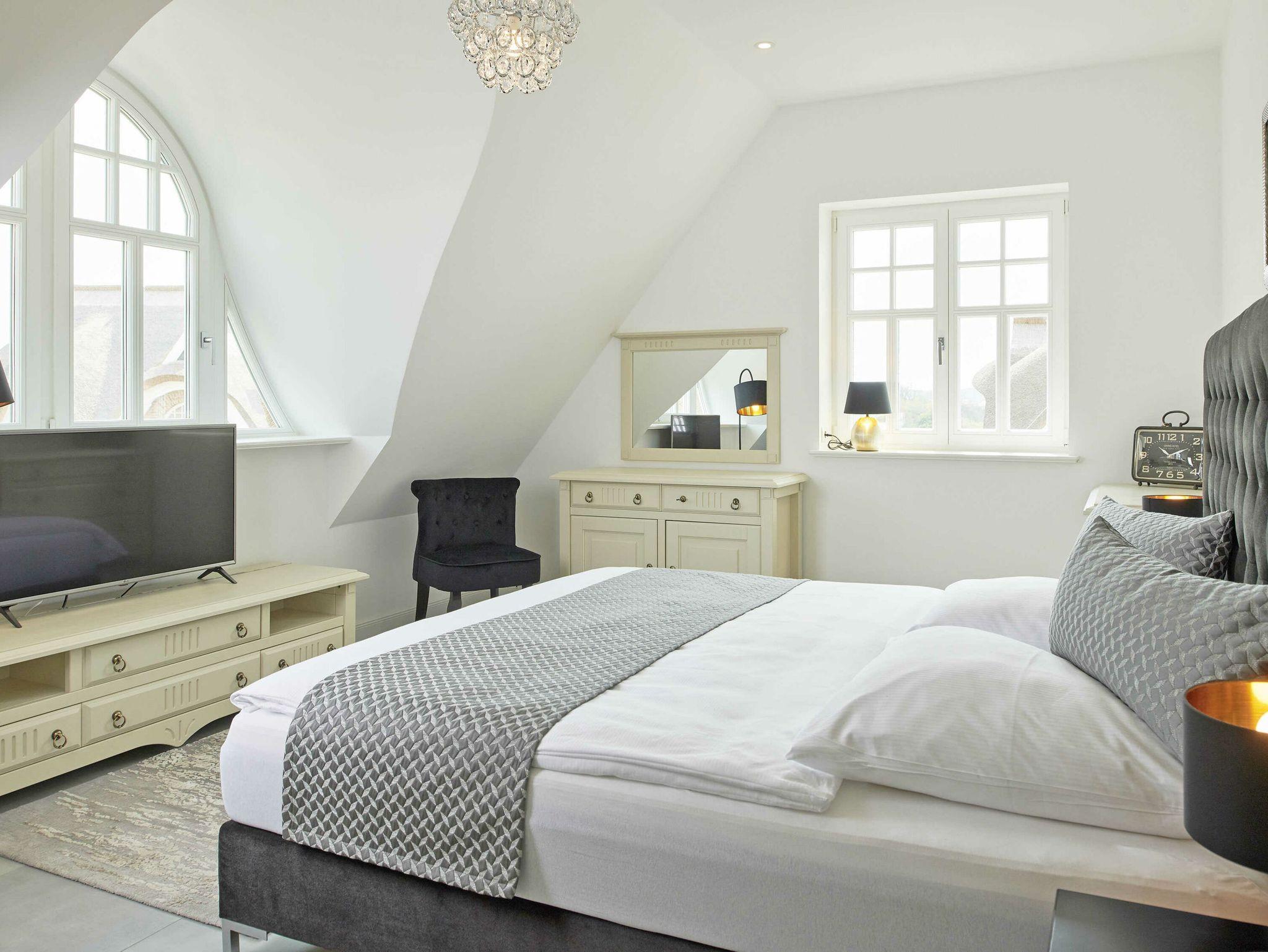 Eine Treppe höher erwarten Sie Ihre drei eleganten Schlafzimmer, jeweils mit eigenem TV und genügend Stauraum für Ihre Urlaubsgarderobe. Zwei der Schlafzimmer sind mit exklusiven Boxspring-Doppelbetten (1,80 x 2,00 m) mit durchgehendem Topper ausgestattet, das dritte mit zwei Boxspring-Einzelbetten (0,90 x 2,00 m).
