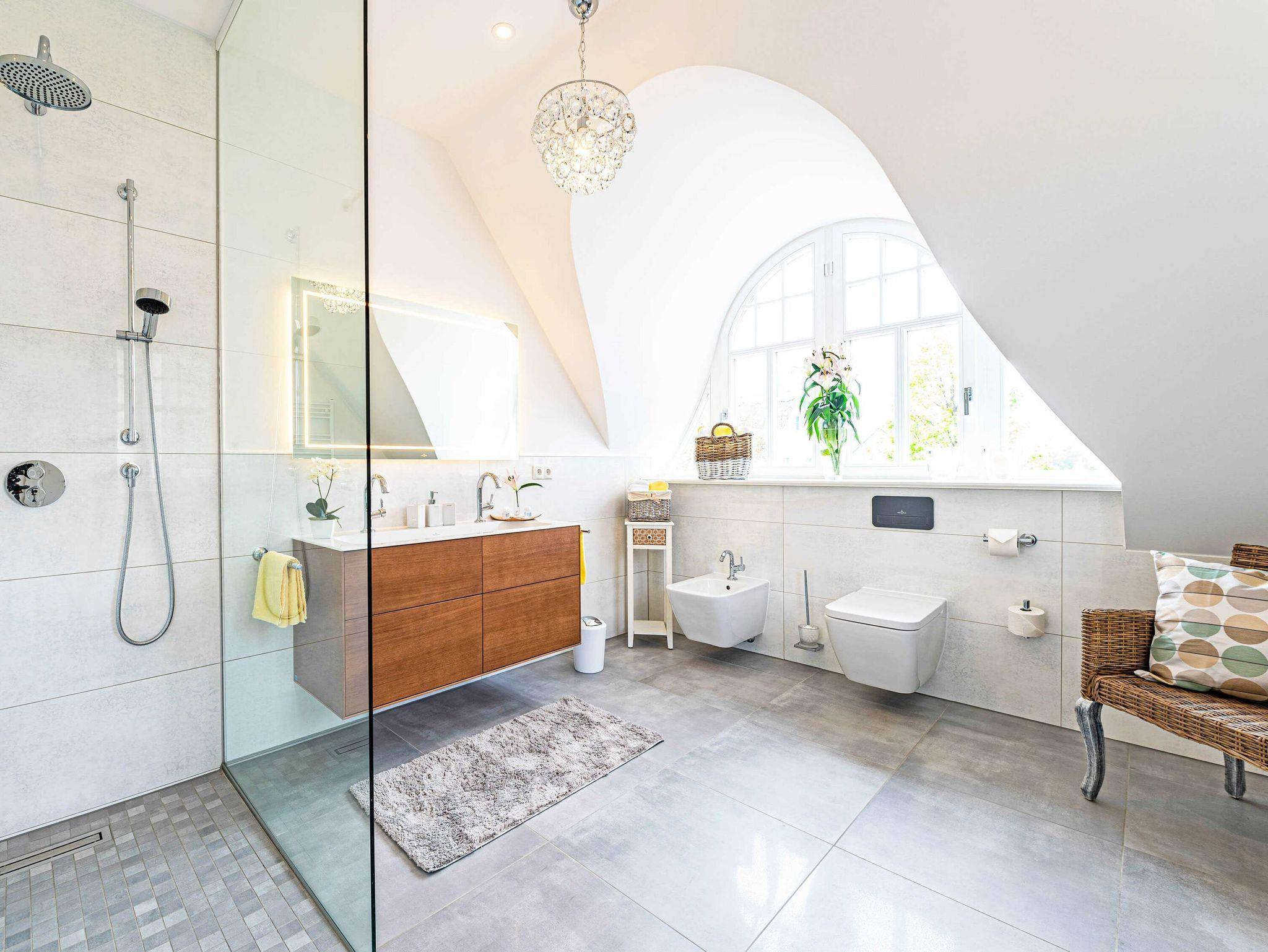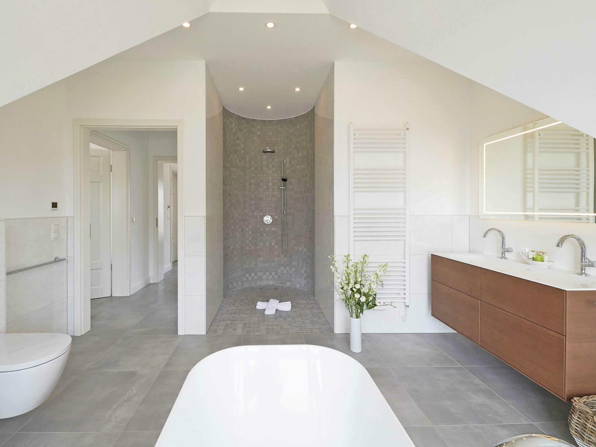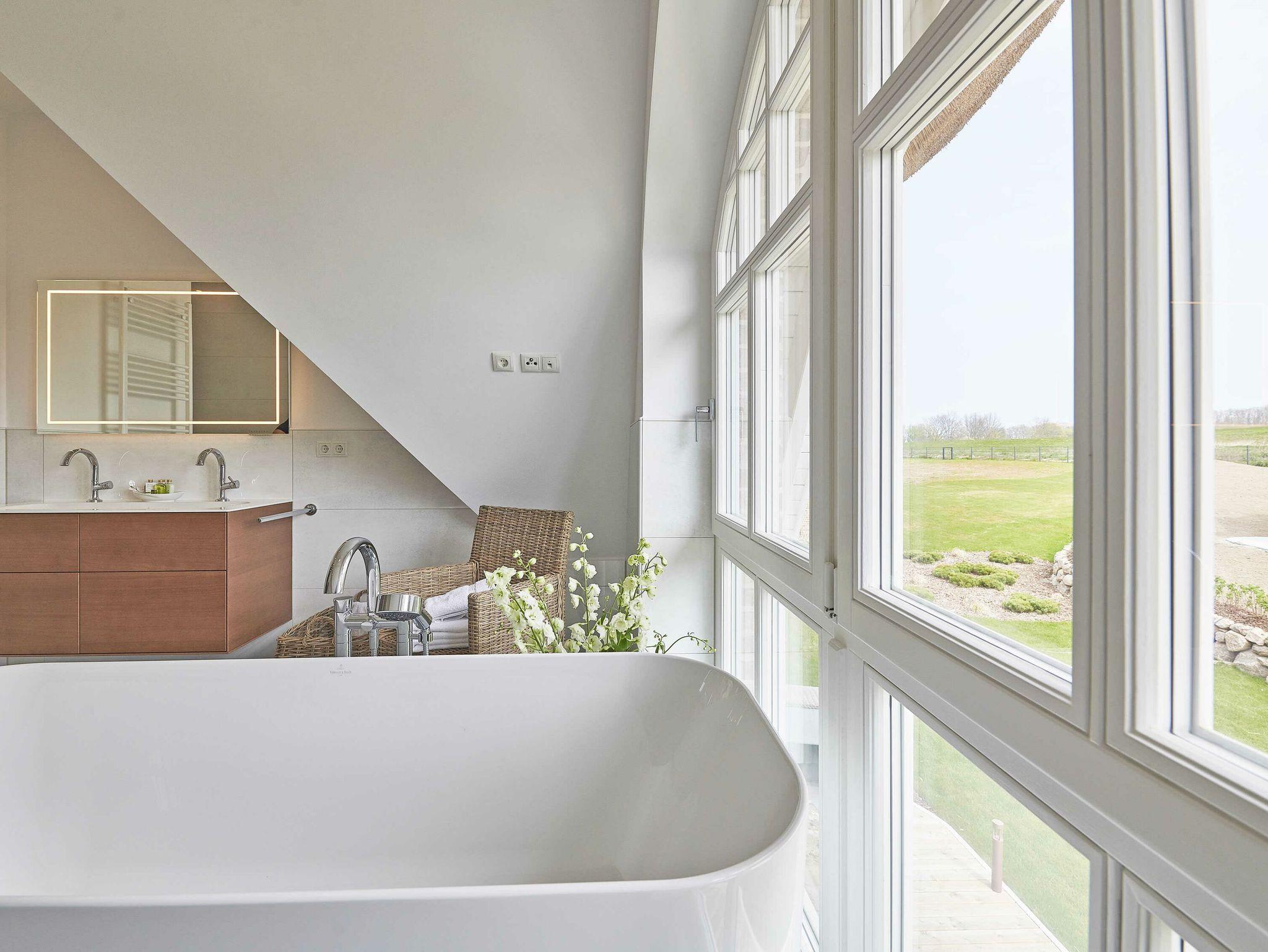 Die beiden Schlafzimmer mit den Doppelbetten haben jeweils ein exklusiven Bad en suite. Genießen Sie den Luxus, aus der Bad heraus aufs Meer zu schauen! Eines der Bäder ist mit einer großen Dusche, einem Doppelwaschtisch sowie einer freistehenden Badewanne mit Meerblick ausgestattet. Das andere Badezimmer verfügt über eine Dusche und natürlich ebenfalls einen Doppelwaschtisch. Die Bäder sind mit hochwertigem Sanitär von Villeroy [&] Boch eingerichtet.