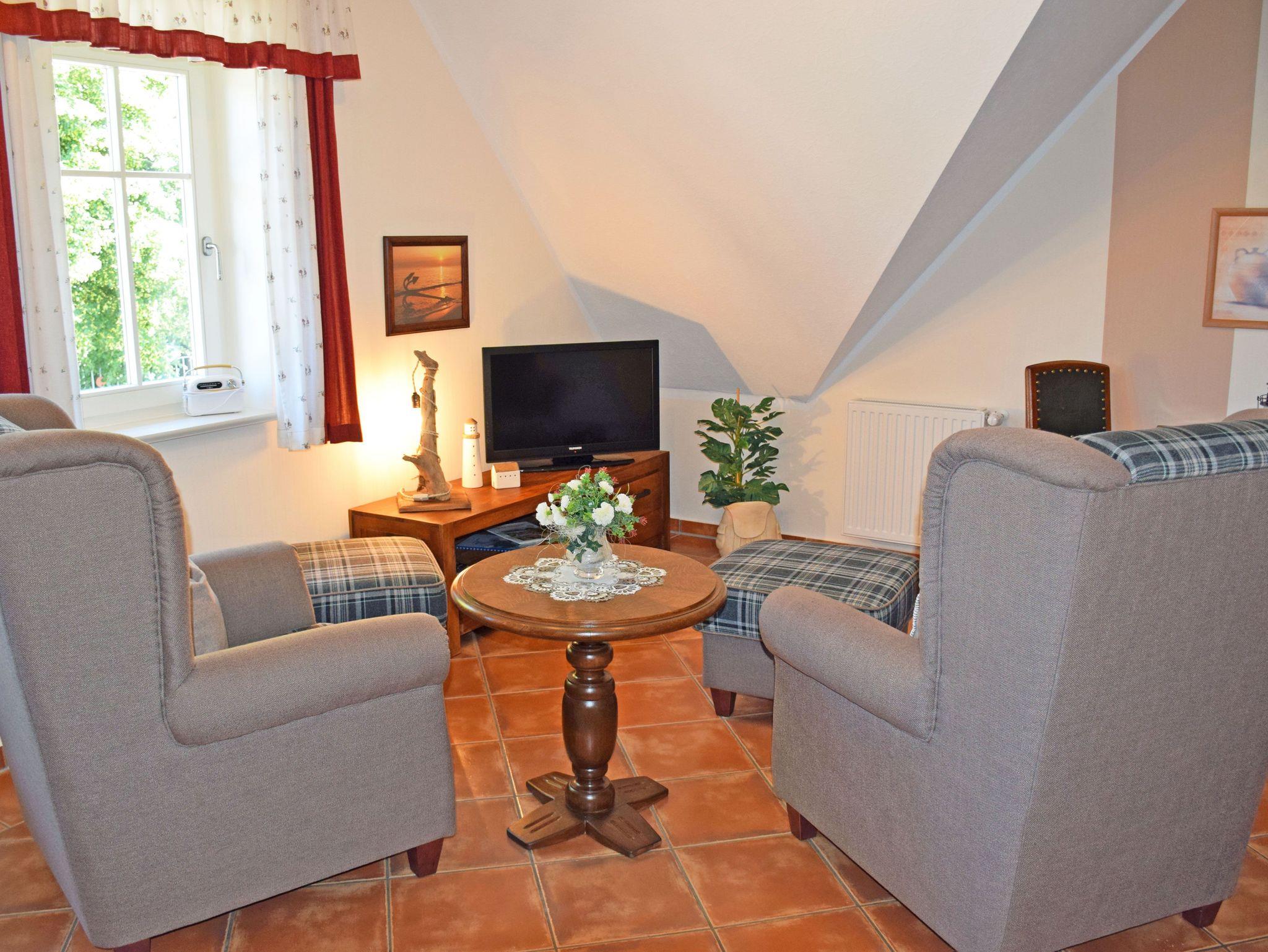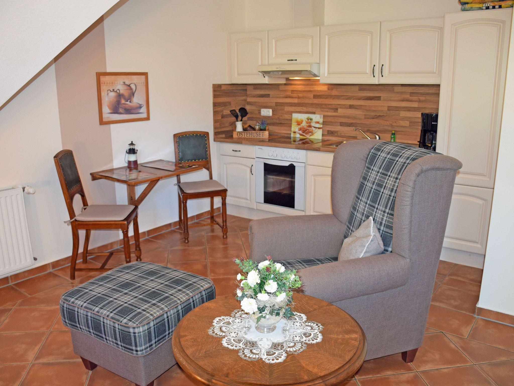 Dieses sehr liebevoll eingerichtete Maisonette Appartement verfügt über ein Wohnzimmer mit Küche und ein Schlafzimmer sowie Bad/WC und Flur. Die Wohnung liegt im Obergeschoss des Landhus, das Schlafzimmer ist über eine Treppe bequem zu erreichen. Im Schlafzimmer stehen zwei Einzelbetten. Im Wohnraum gibt es eine Sitzgruppe. Das Bad ist mit einer Dusche ausgestattet. Die komplette Einbauküche mit 4-Platten-Ceranherd, Backofen, Mikrowelle, Kaffeemaschine, Toaster, Wasser- und Eierkocher, Kühlschrank usw. lässt keine Wünsche offen.