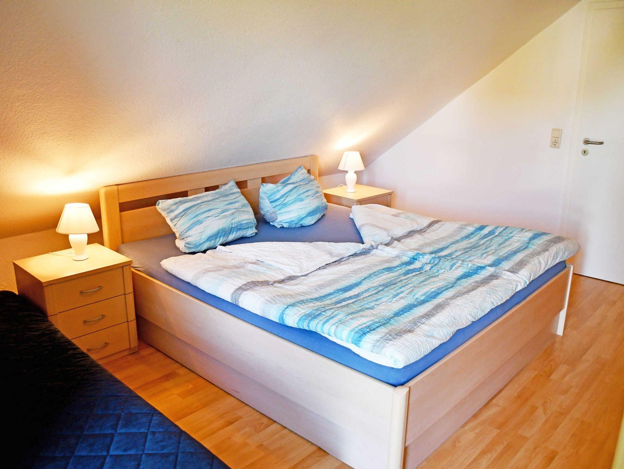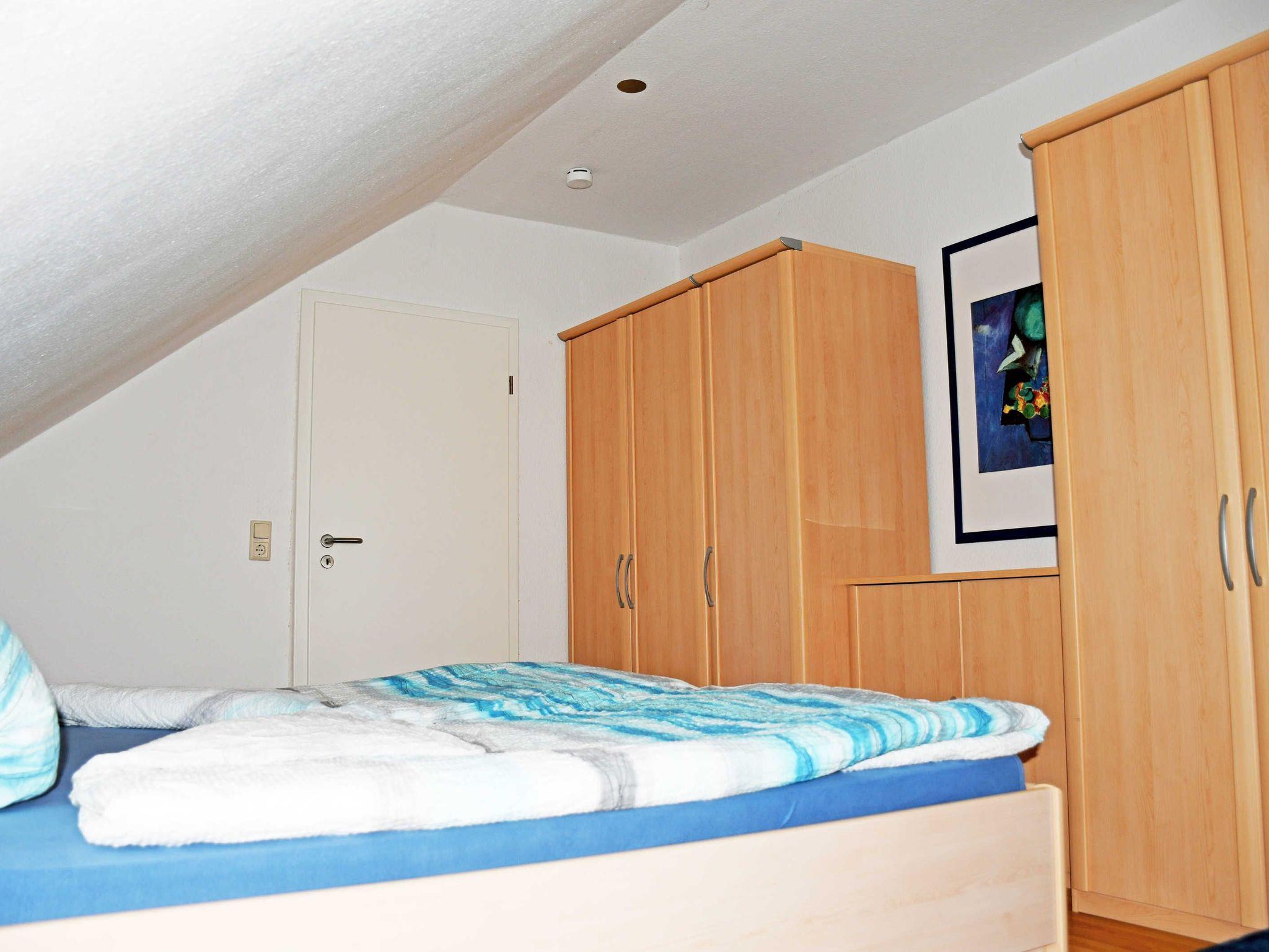 Die Komfortable Ferienwohnung verfügt über 1 separates Schlafzimmer mit Doppelbett (.cm x .cm), Einzelbett (.cm x .cm), Nachttischen mit Beleuchtung sowie einem großzügigen Kleiderschrank. Die Bodentiefen Fenster sind mit Vorhängen verdunkelbar. Bei Ihrer Anreise liegen frische Handtücher bereit und die Betten sind bereits mit Bettwäsche bezogen.