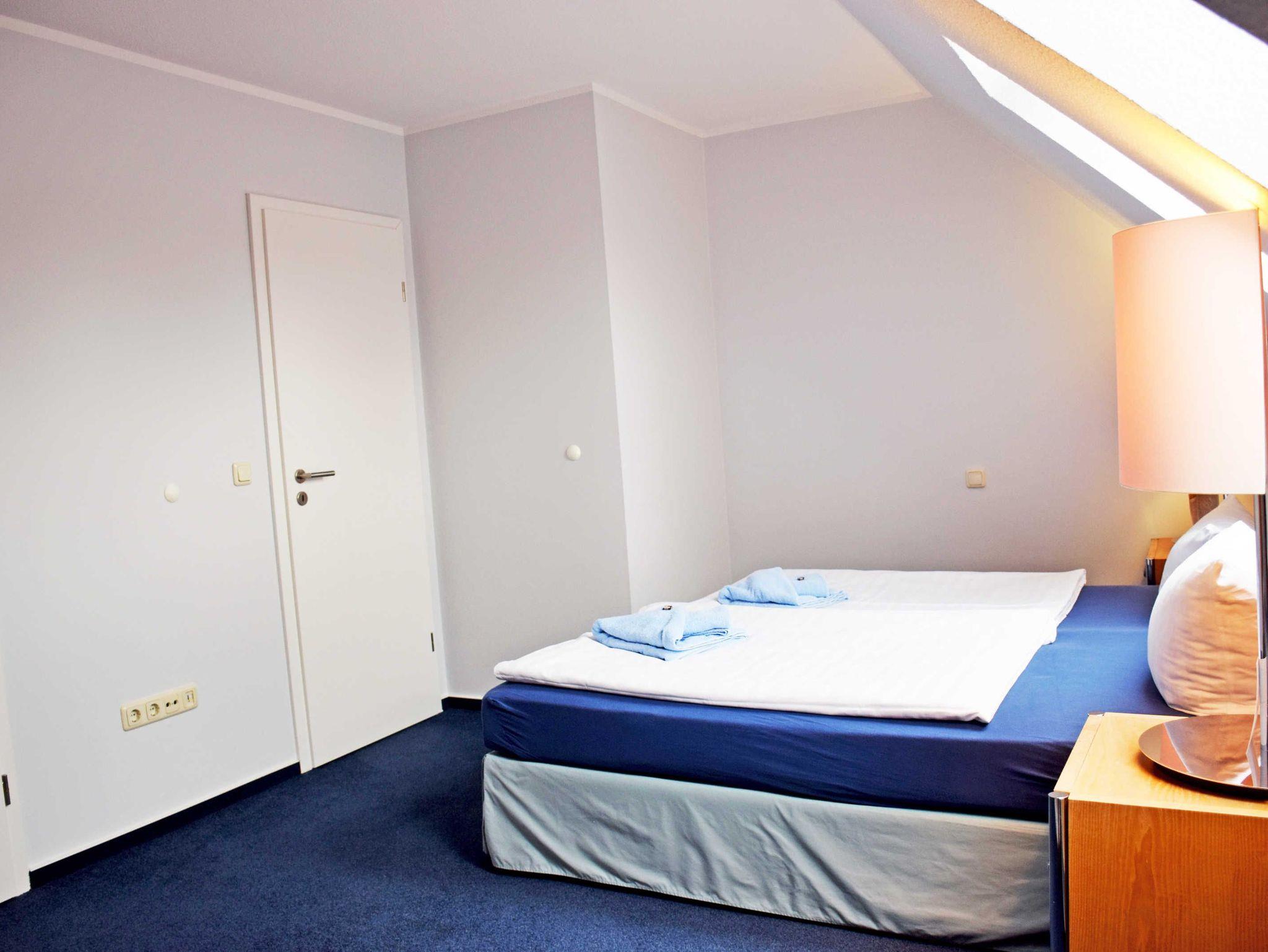 Die Ferienwohnung liegt im Hotelgebäude und ist ca. 36 qm groß. Sie hat Platz für maximal 3 Erwachsene und wurde modern und hochwertig eingerichtet. Im Wohnraum befinden sich eine bequeme Sitzcouch mit Tisch und ein modernes Flachbild-TV-Gerät. Hier steht auch ein Esstisch mit Stühlen. Die moderne Küchenzeile ist mit einem Herd, Mikrowelle, Wasserkocher, Kaffeemaschine, Toaster und Kühlschrank komplett ausgestattet. Das großzügige Schlafzimmer ist mit einem bequemen Doppelbett mit Nachttischen und Leselampen sowie einem Kleiderschrank ausgestattet.