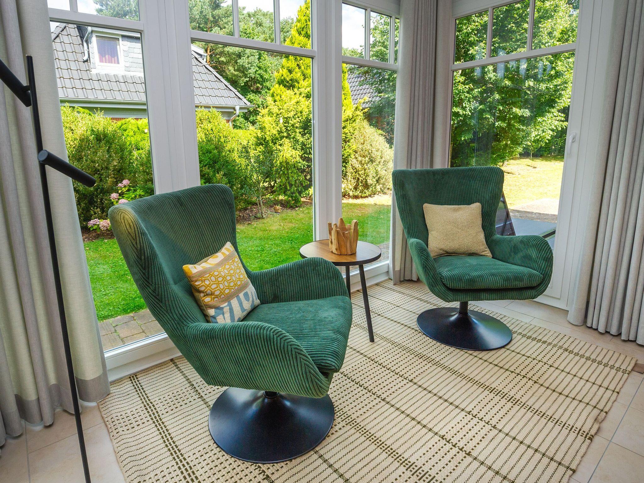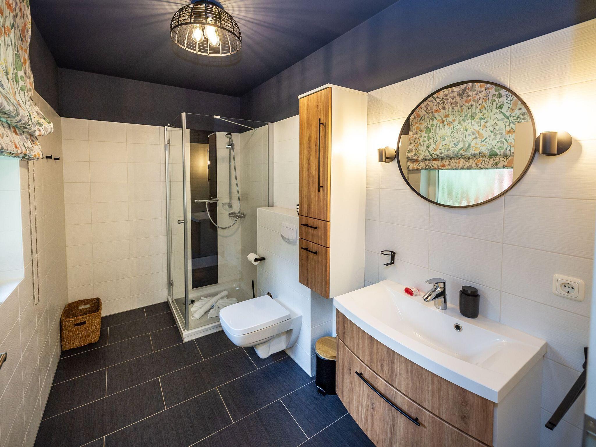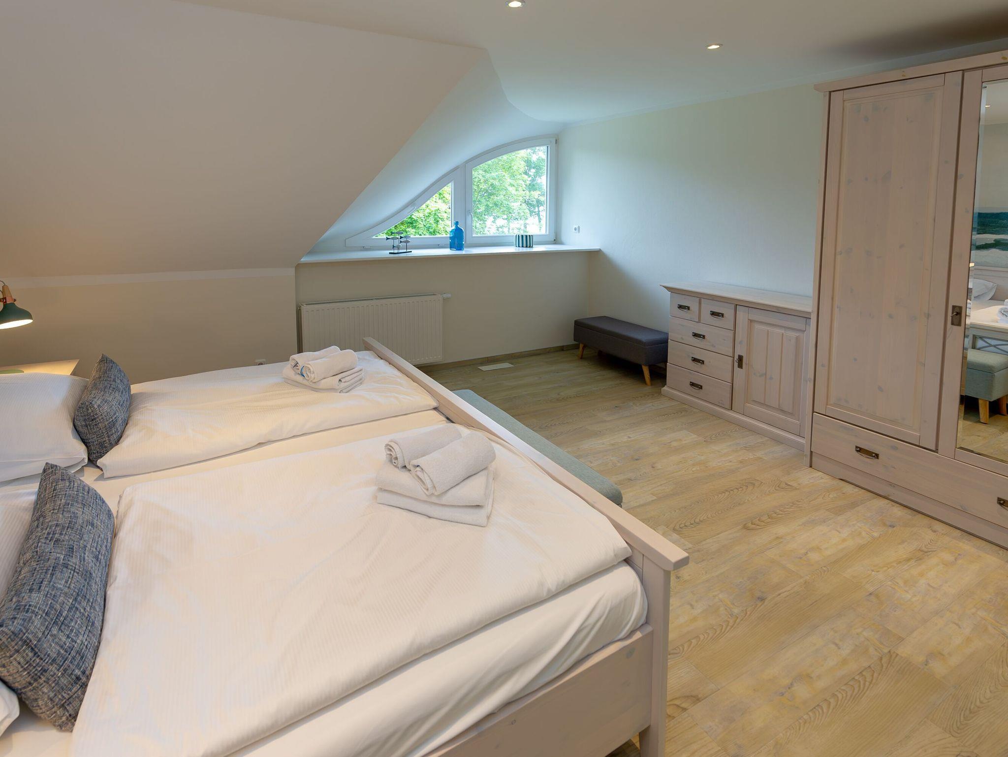 Ein paar Treppenstufen höher warten im Obergeschoss drei Schlafzimmer mit bequemen Doppelbetten sowie ein großes Badezimmer mit Waschbecken, ebenerdiger Dusche, WC, Badewanne und privater Sauna auf Sie.