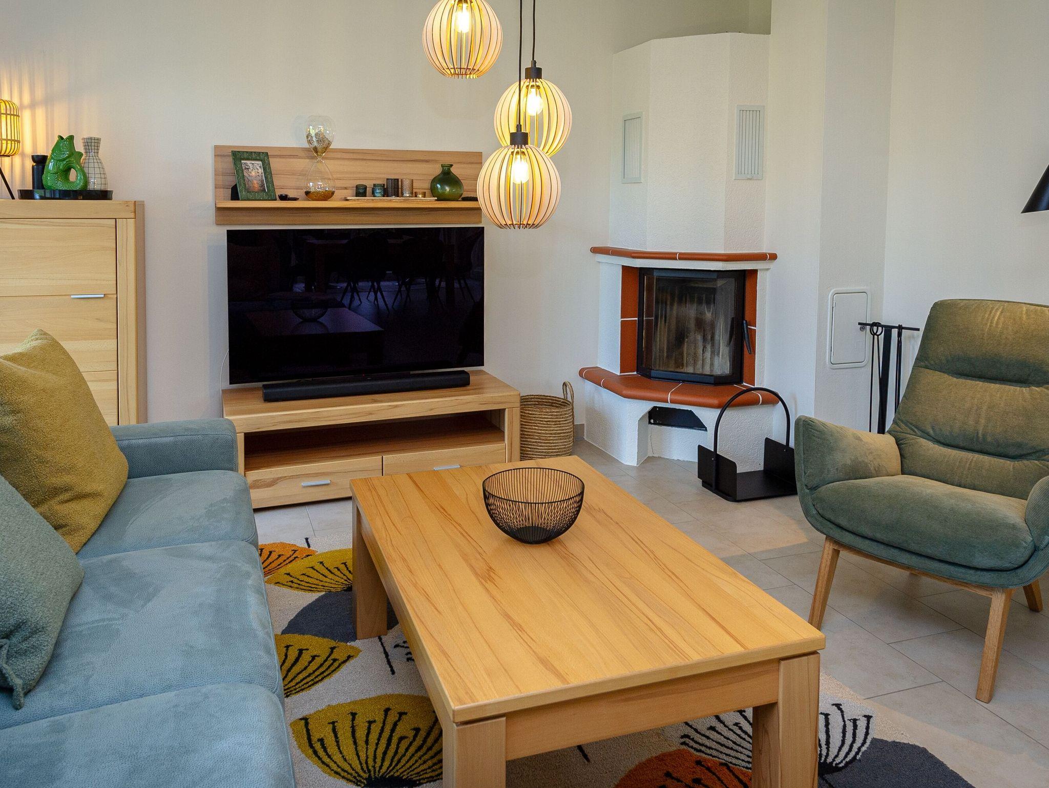 Im Erdgeschoss finden Sie Ihren überaus großzügigen und angenehm lichtdurchfluteten Wohnbereich mit Kaminofen, die voll ausgestattete Ku?che mit Esstisch, ein Badezimmer mit WC und ebenerdiger Dusche sowie einen Hauswirtschaftsraum mit Waschmaschine.