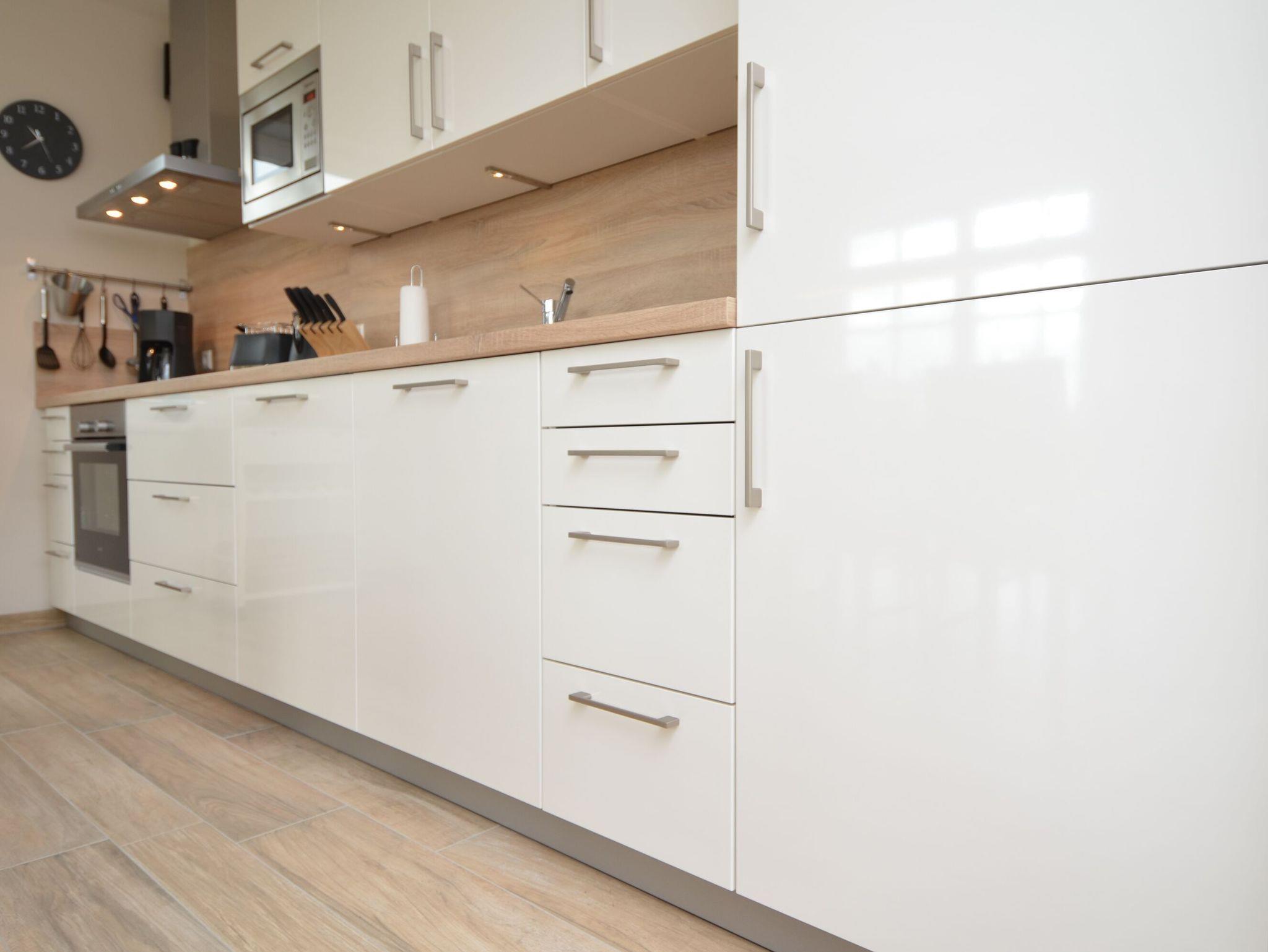Die harmonisch im Wohnbereich integrierte hochwertig ausgestattete Küchenzeile verfügt über eine Spülmaschine, einen Backofen, ein 4-Zonen-Induktionskochfeld, eine Kühl-/Gefrierkombination, eine Mikrowelle, Kaffeemaschine, Toaster, Wasserkocher, Mixer, Waffeleisen sowie diverses Kleininventar, das die Küchenausstattung komplettiert.