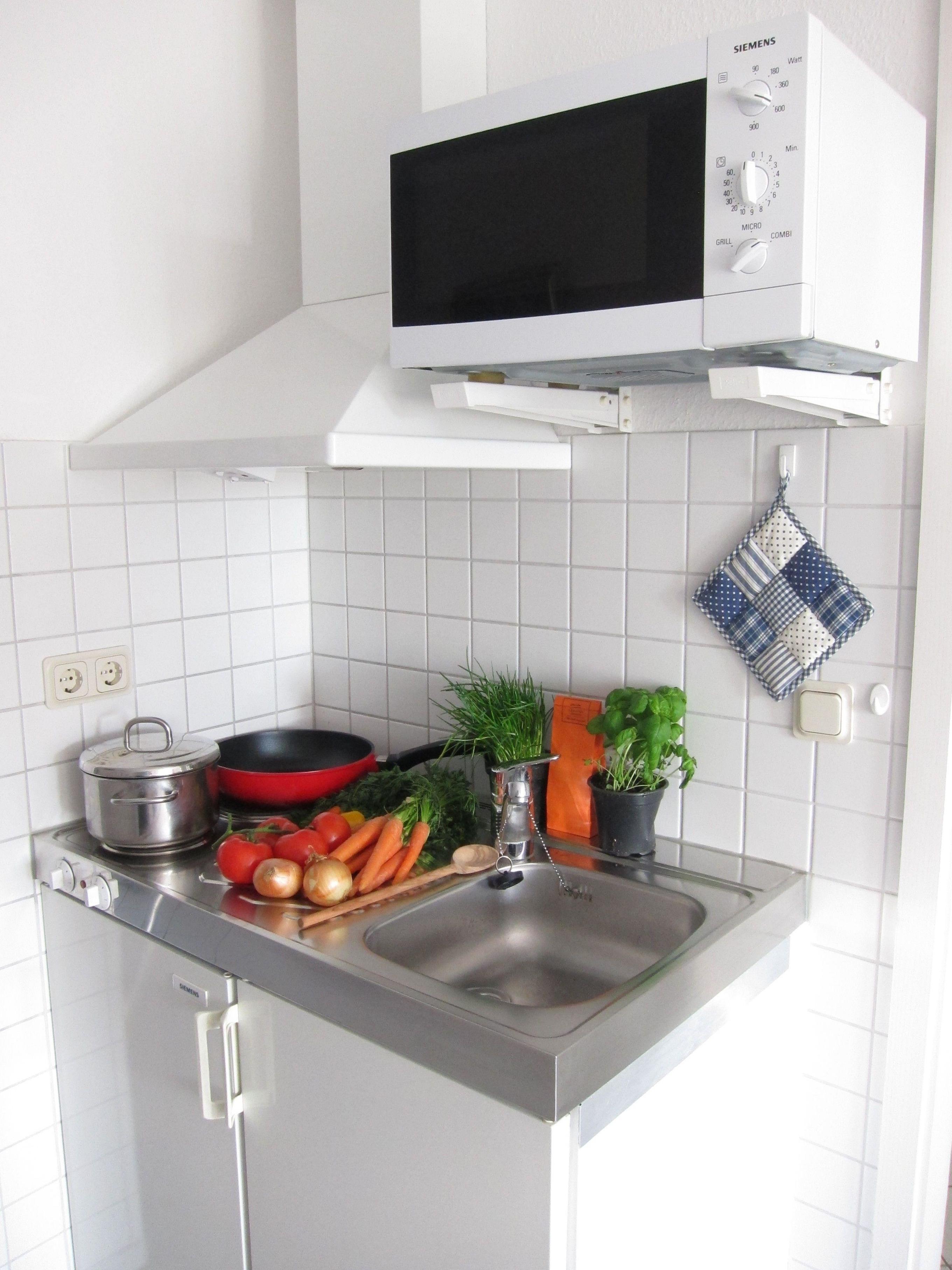 Küchenzeile mit Geschirrspüler, kleinem Ofen, Mikrowelle, Wasserkocher, Kaffeemaschine, Toster.