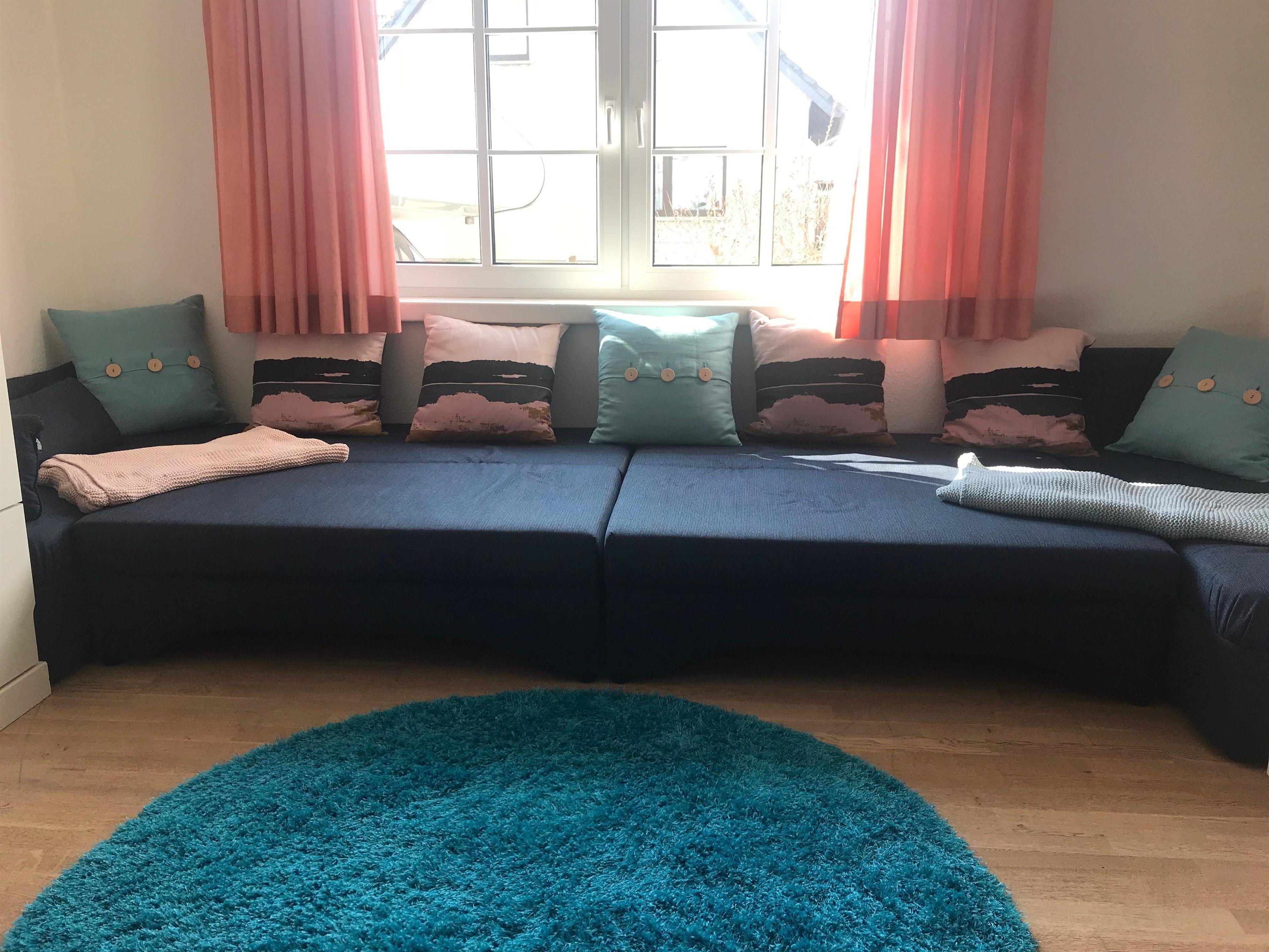 Wohnzimmer mit Essbereich, Sofa und Doppelbett (140x200 - Schrankbett).