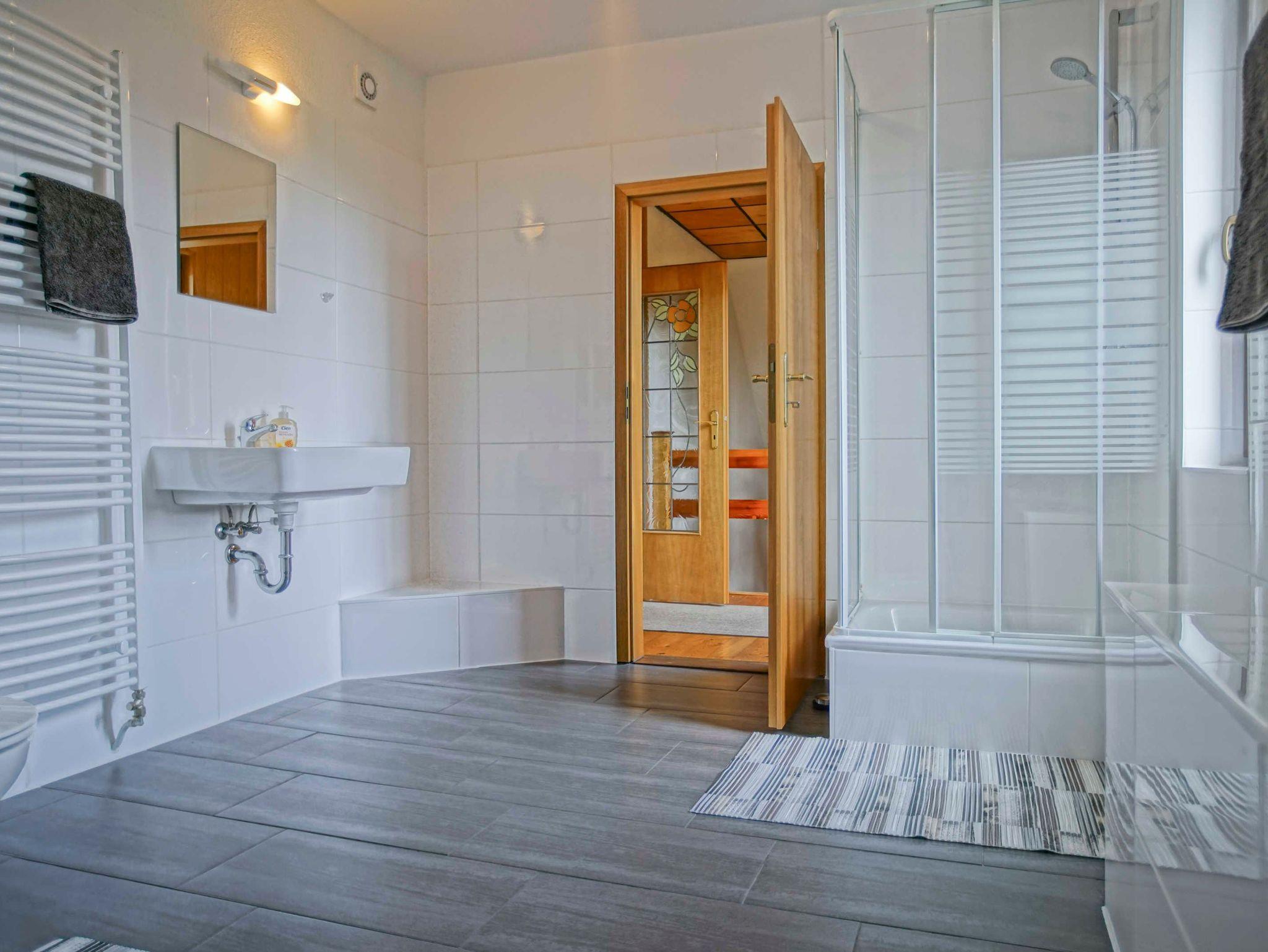 komfortablen Stühlen. Im Badezimmer ist, eine Duschkabine, ein Handwaschbecken