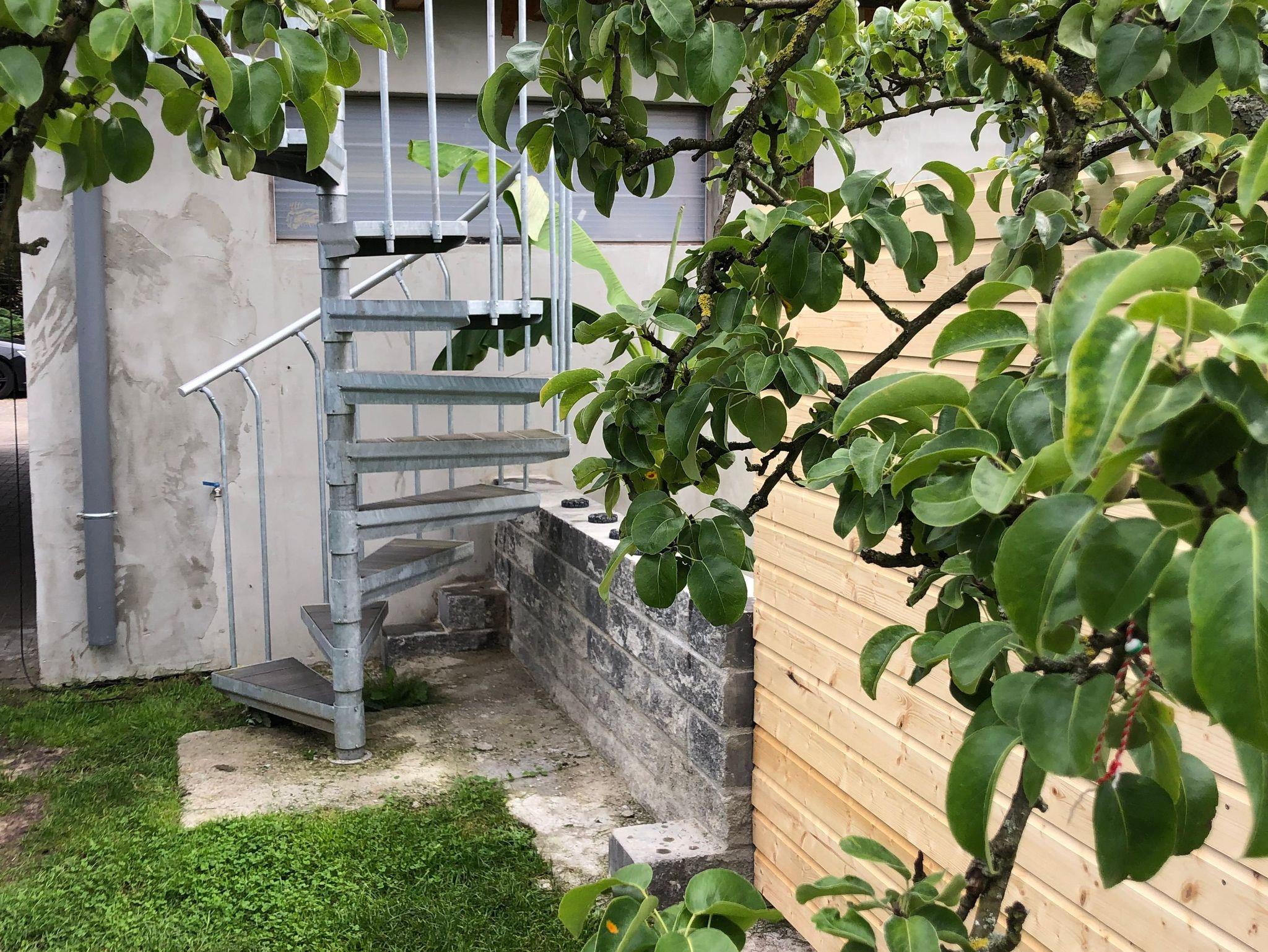 sowie zahlreicher Kleinelektrogeräte, von einem Toaster, Wasserkocher bis zur Kaffeemaschine. Die Wendetreppe führt