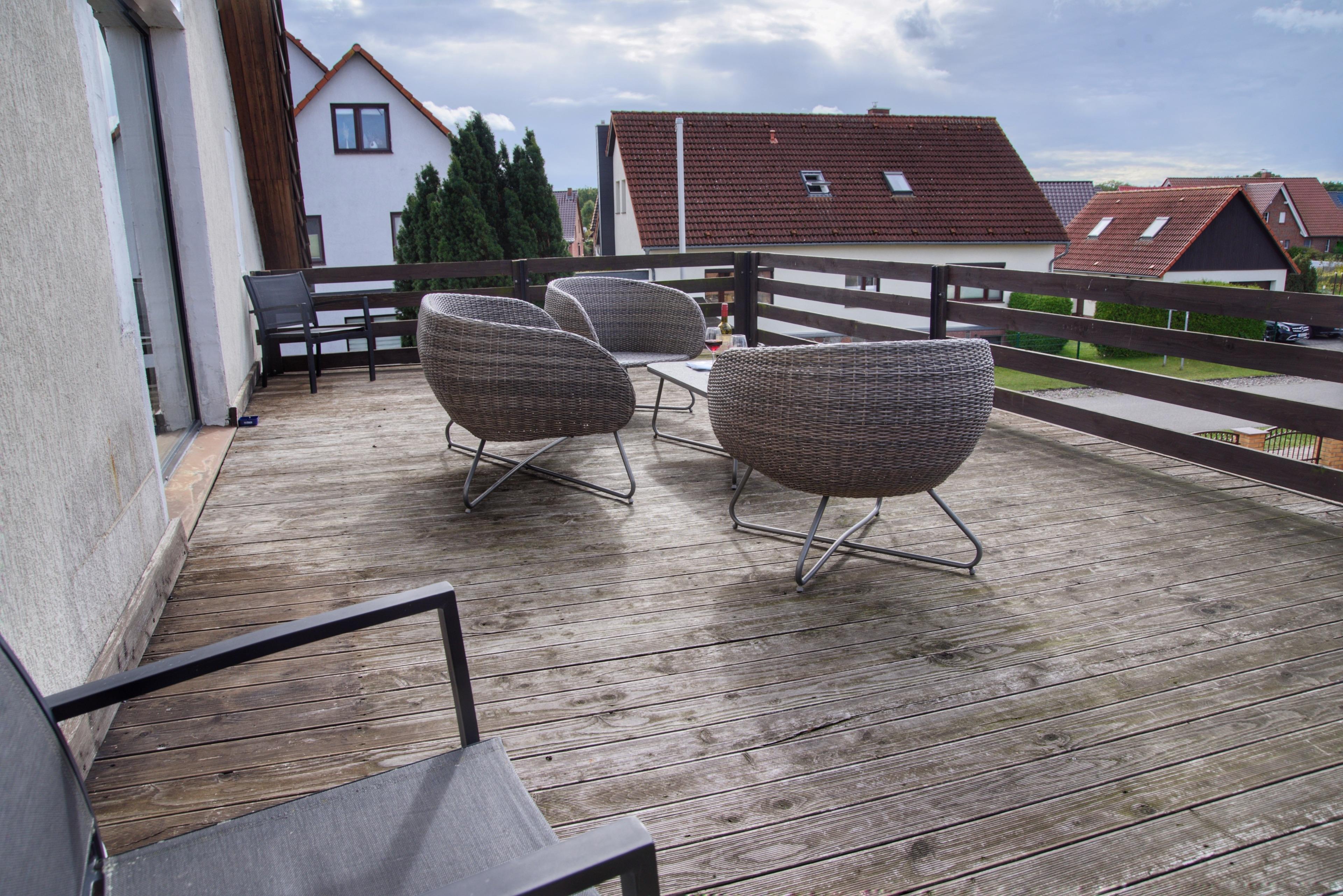 Lassen Sie es sich auf Ihrer möblierten Dachterrasse gut gehen und genießen dabei den Blick auf die umliegende Natur mit Ihren Sonnenuntergängen! Wir stellen kostenlose Sonnenliegen zur Verfügung, um die Sonne einfach mal zu genießen.