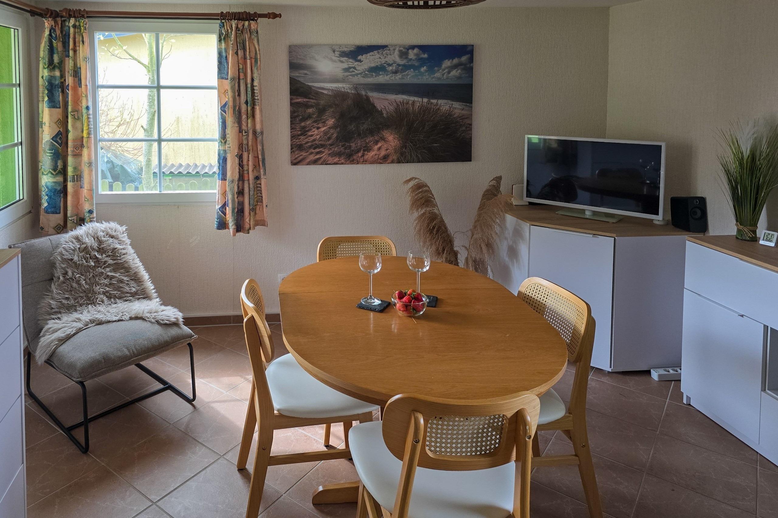 Der Bungalow selbst bietet Platz für bis zu vier Personen. Auch Ihr treuer Vierbeiner ist hier herzlich willkommen. Das offene Esszimmer, das sich zur Küche hin öffnet, erwartet Sie mit einem Esstisch und vier Stühlen. Hier stehen Ihnen Unterhaltungselemente wie ein Fernseher und eine Musikanlage zur Verfügung. Die kleine Einbauküche bietet Ihnen alles was Sie für Ihren Aufenthalt benötigen. Mit zwei Kochfeldern, einer Kaffeemaschine, einem Mikrowellenbackofen, Toaster, Eierkocher und einer Auswahl an Geschirr und Kochutensilien haben Sie alles zur Hand, um Ihre Lieblingsgerichte zuzubereiten. Der Kühlschrank mit einem kleinen Gefrierfach ermöglicht es Ihnen, frische Zutaten zu lagern und kühle Getränke zu genießen. Das Badezimmer ist mit einem Waschbecken, Duschkabine, Toilette, Ablageflächen und einen Fön ausgestattet.