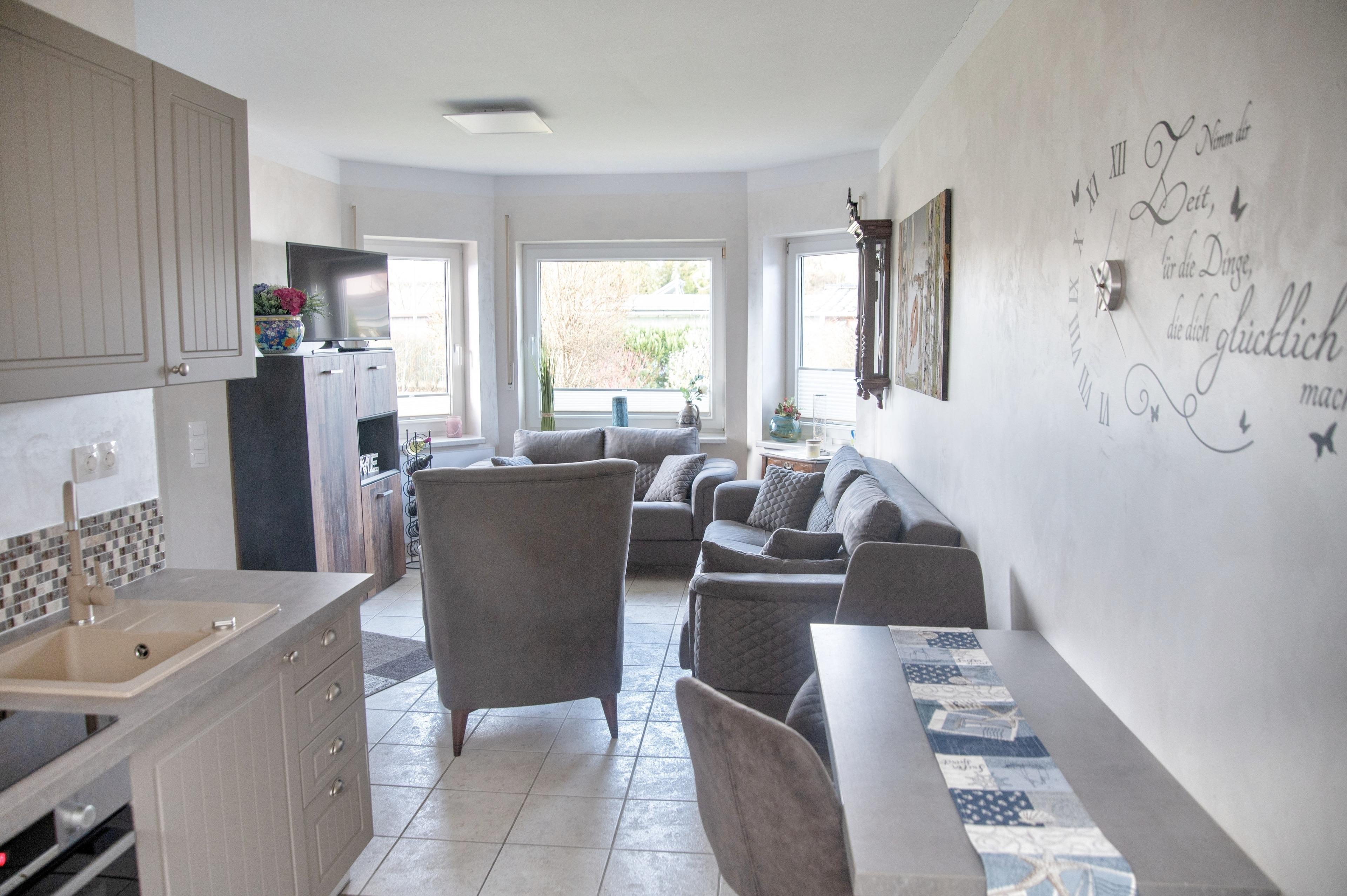Ihr zur Küche hin offenes Wohnzimmer verfügt über eine sehr gemütliche Sitzecke mit fünf Sitzgelegenheiten. Multimedial warten hier ein Flachbildfernseher und eine Musikanlage auf Sie. Auch einige Gesellschaftsspiele dürfen im Bestand nicht fehlen.