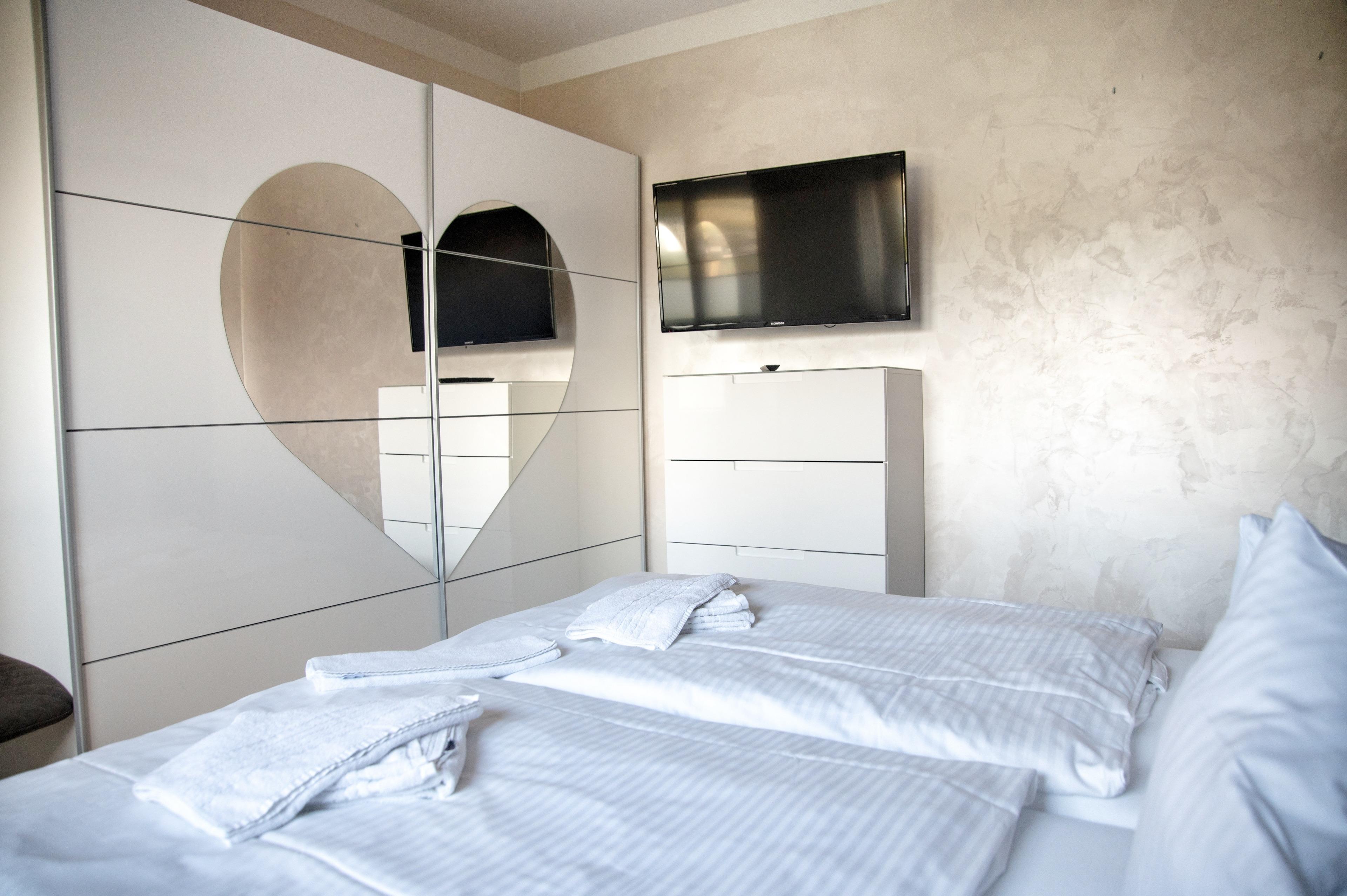 Im großen Schlafzimmer befindet sich ein Doppelbett. Nachttische, Leselampen und Garderoben möchten hier von Ihnen genutzt werden. Der geräumige Kleiderschrank wird Ihnen gute Dienste leisten. Ein Flachbildfernseher ist in diesem Raum ebenfalls für Sie vorhanden. Ein Babybett und ein Kinderhochstuhl sind für Sie kostenfrei verfügbar.