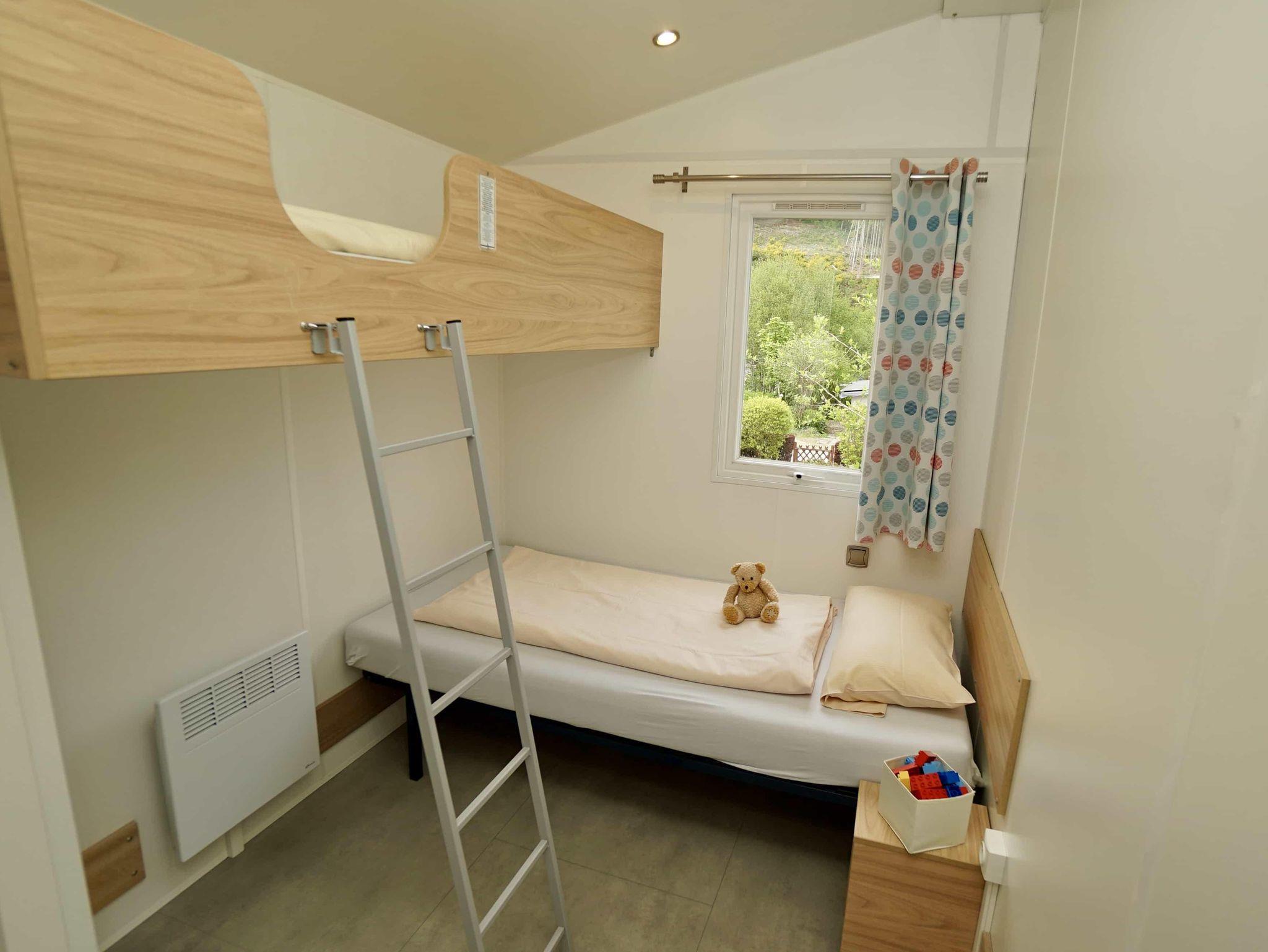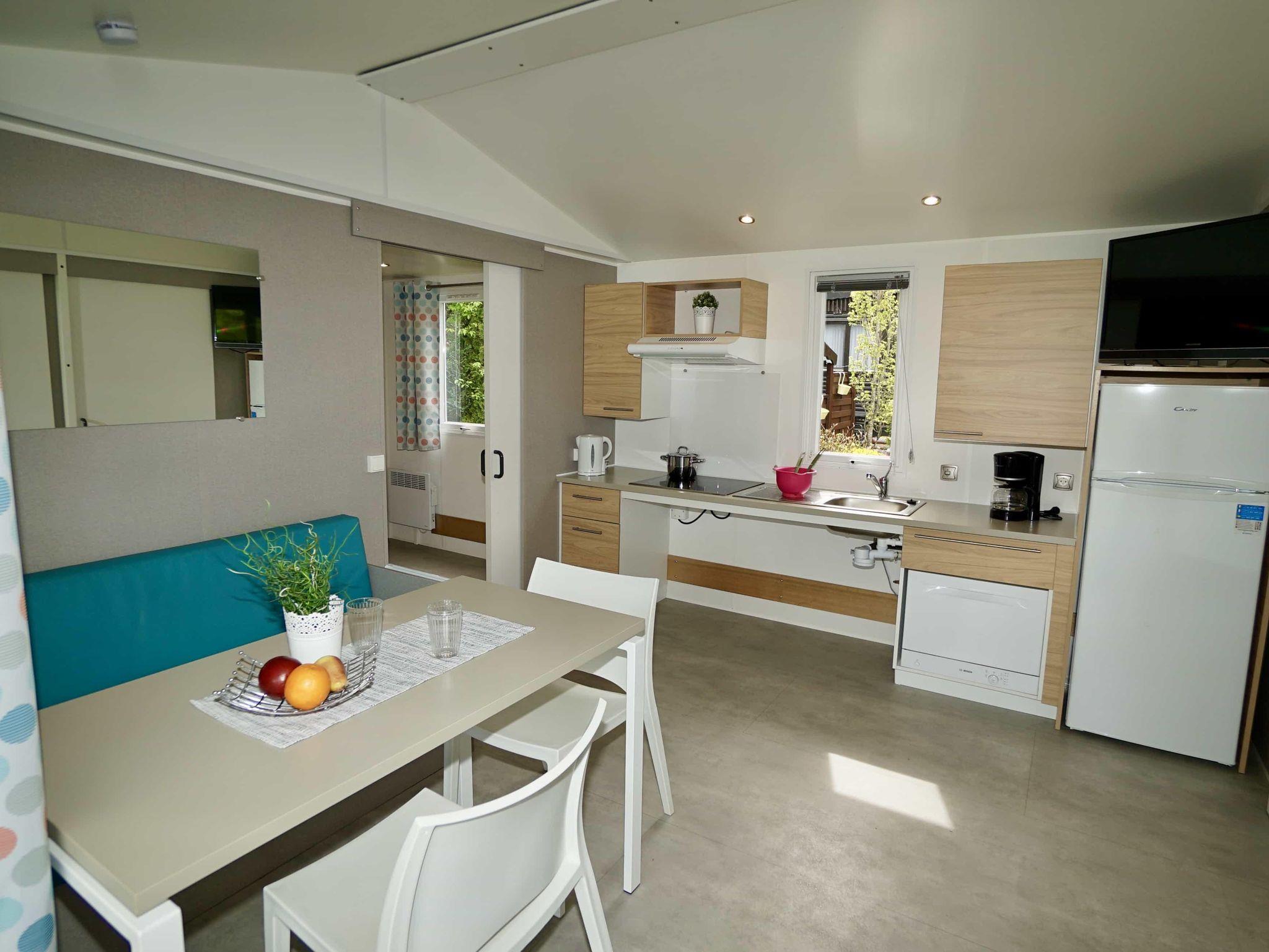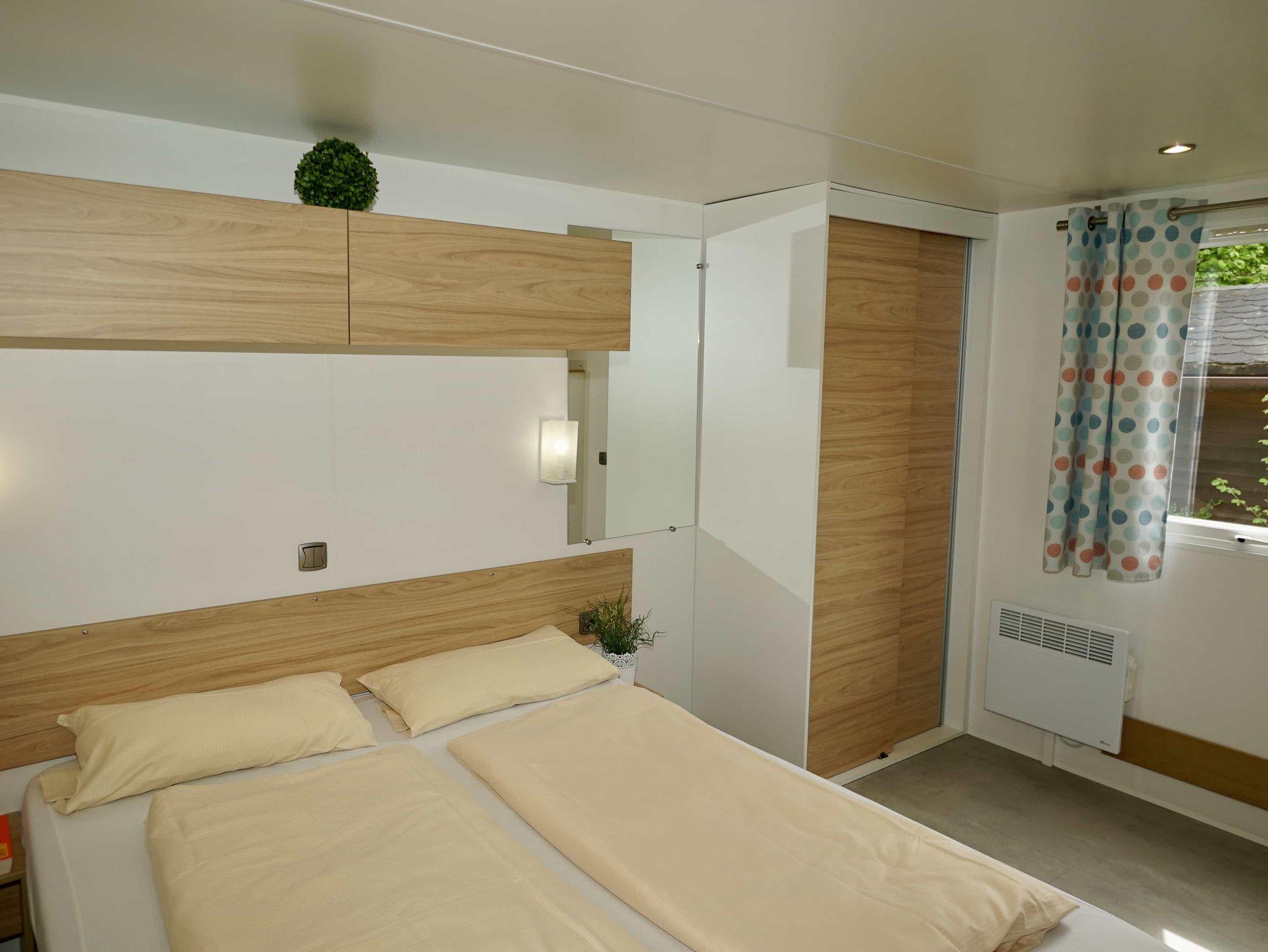 Das 30 qm große Mobilheim ist komplett barrierefrei und eignet sich für vier Personen. Die Unterkunft verfügt über zwei Schlafzimmer (Elternzimmer mit Doppelbett 160 x 200 cm und Kinderzimmer mit Einzelbett 90 x 190 cm und Hochbett 70 x 190 cm). Die Unterkunft bietet einen freundlich eingerichteten Wohnraum mit offener Küche, gemütlicher Sitzecke und TV-Gerät. Außerdem gibt es ein barrierefreies Badezimmer mit Dusche und WC. Im Außenbereich ist eine überdachte Terrasse mit Rollstuhl- Rampe und Gartenmöbeln.