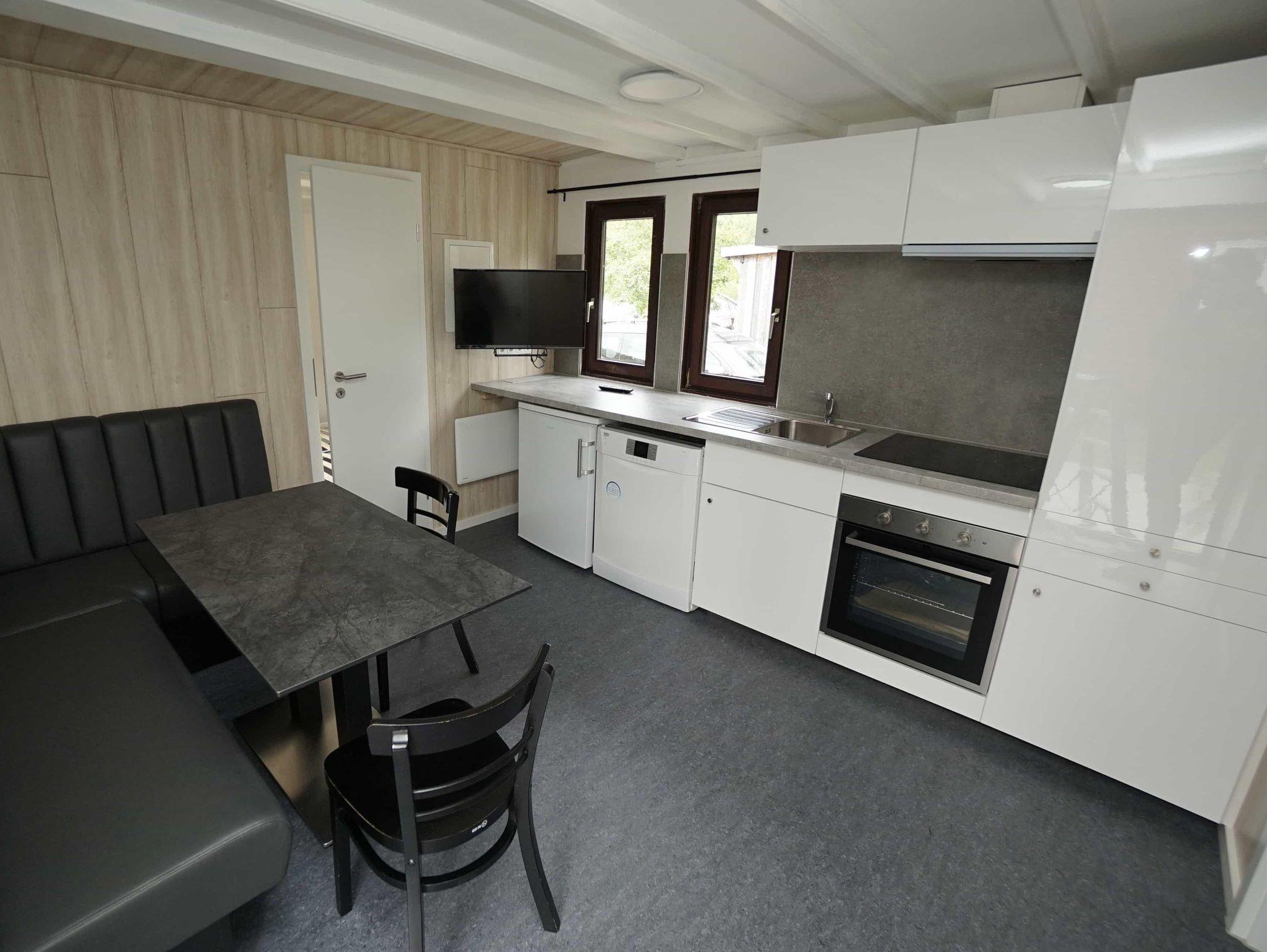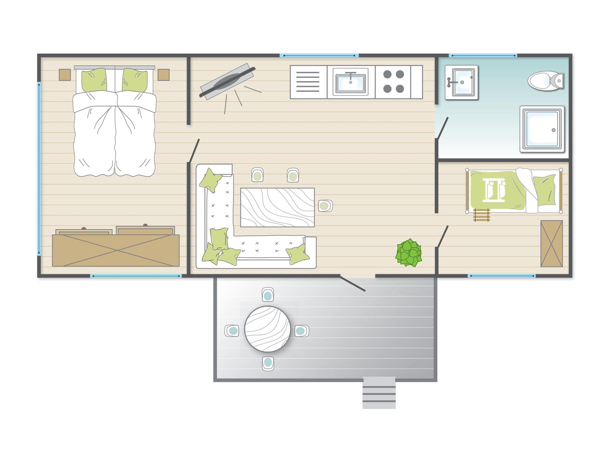 Das 28 qm große Chalet für vier Personen verfügt über zwei Schlafzimmer (Elternzimmer mit Doppelbett 160 x 200 cm und Kinderzimmer mit Etagenbett 80 x 190 cm). Die Unterkunft bietet ein freundlich eingerichteter Wohnraum mit gemütlicher Sitzecke und TV-Gerät. Die offene Küche voll ausgestattet mit Kühlschrank, Backofen und Herd. Außerdem gibt es ein Badezimmer mit Dusche und Toilette.