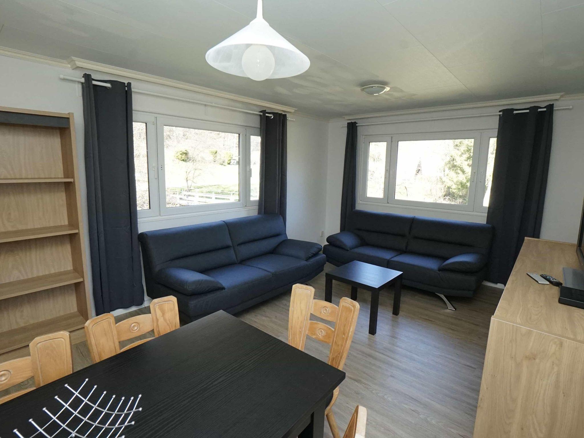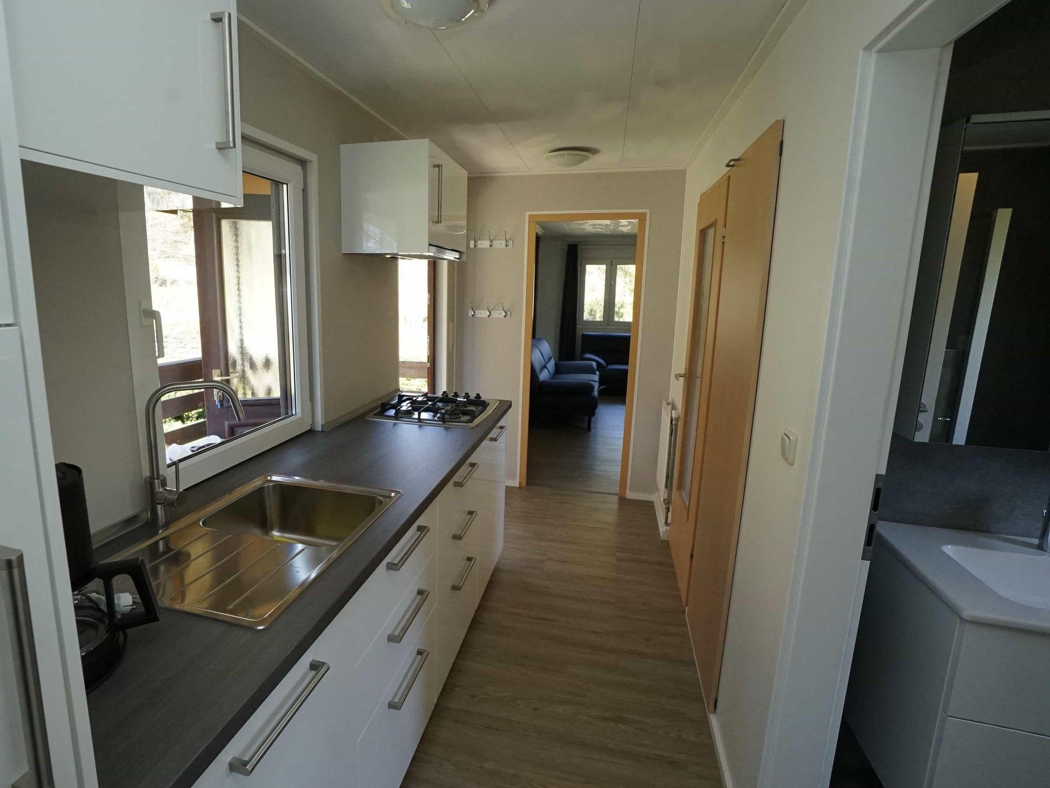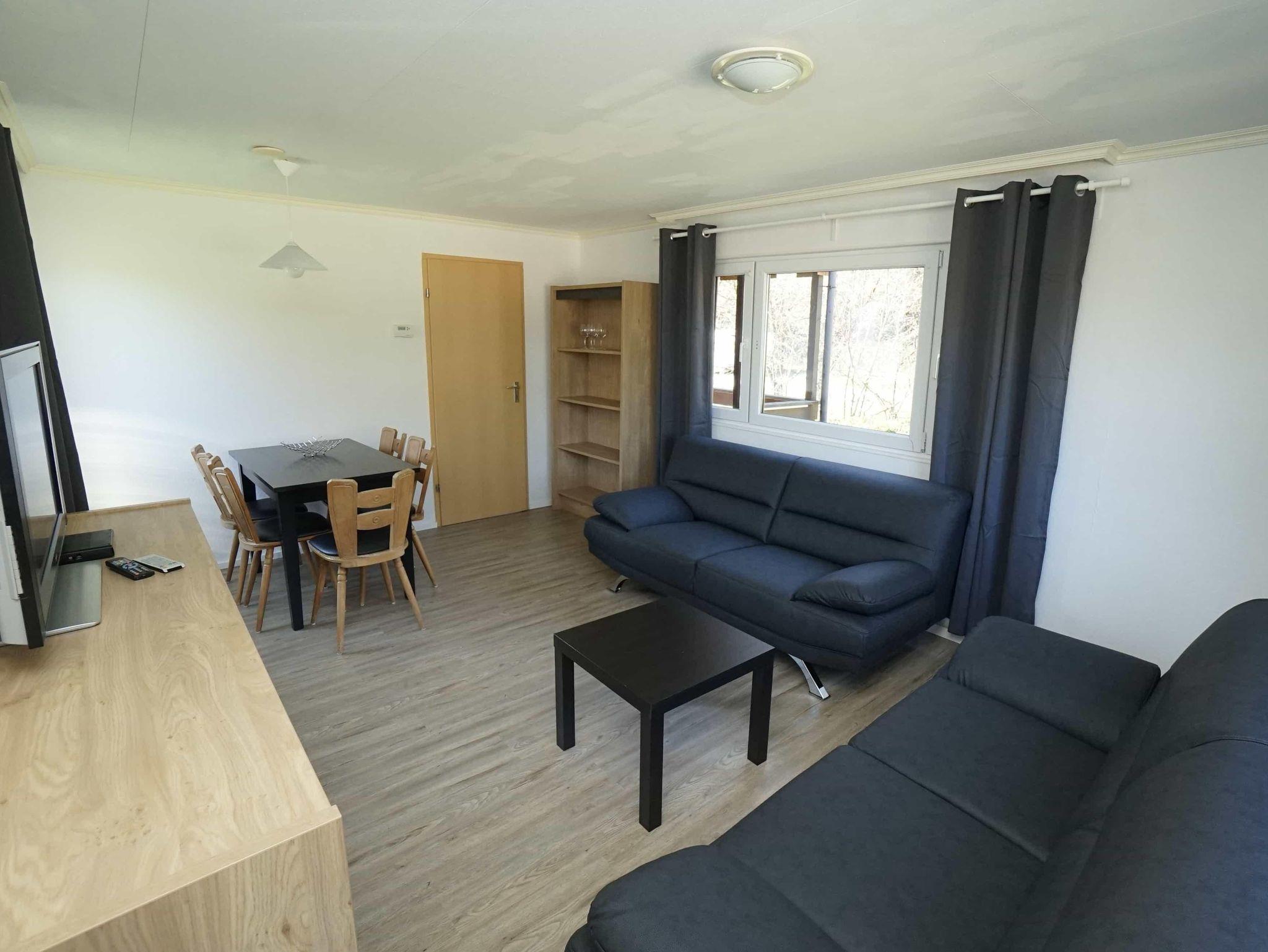 Das 42 qm große Chalet für vier Personen und Baby verfügt über zwei Schlafzimmer (Elternzimmer mit Doppelbett 160 x 200 cm und Kinderzimmer mit Etagenbett 70 x 190 cm und Babybett 70 x 130 cm). Die Unterkunft bietet einen freundlich eingerichteten Wohnraum mit gemütlicher Couch, Esstisch und TV-Gerät. Im Flur befindet sich die voll ausgestattete Küche. Außerdem gibt es ein Badezimmer mit Dusche und WC. Im Außenbereich ist eine überdachte Terrasse mit Gartenmöbeln.