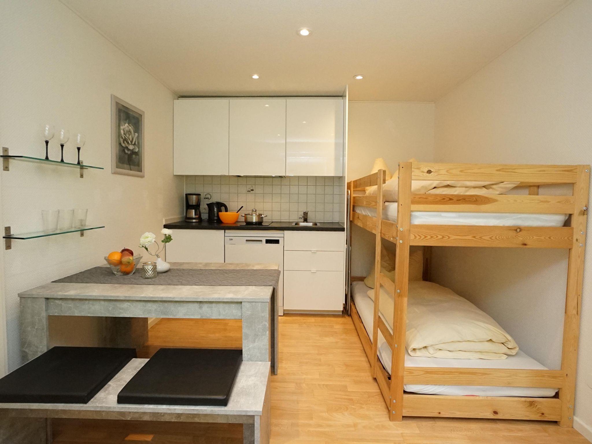 Kühlschrank, Herd, Spülmaschine, Kaffeemaschine, Wasserkocher. Ein Esstisch,