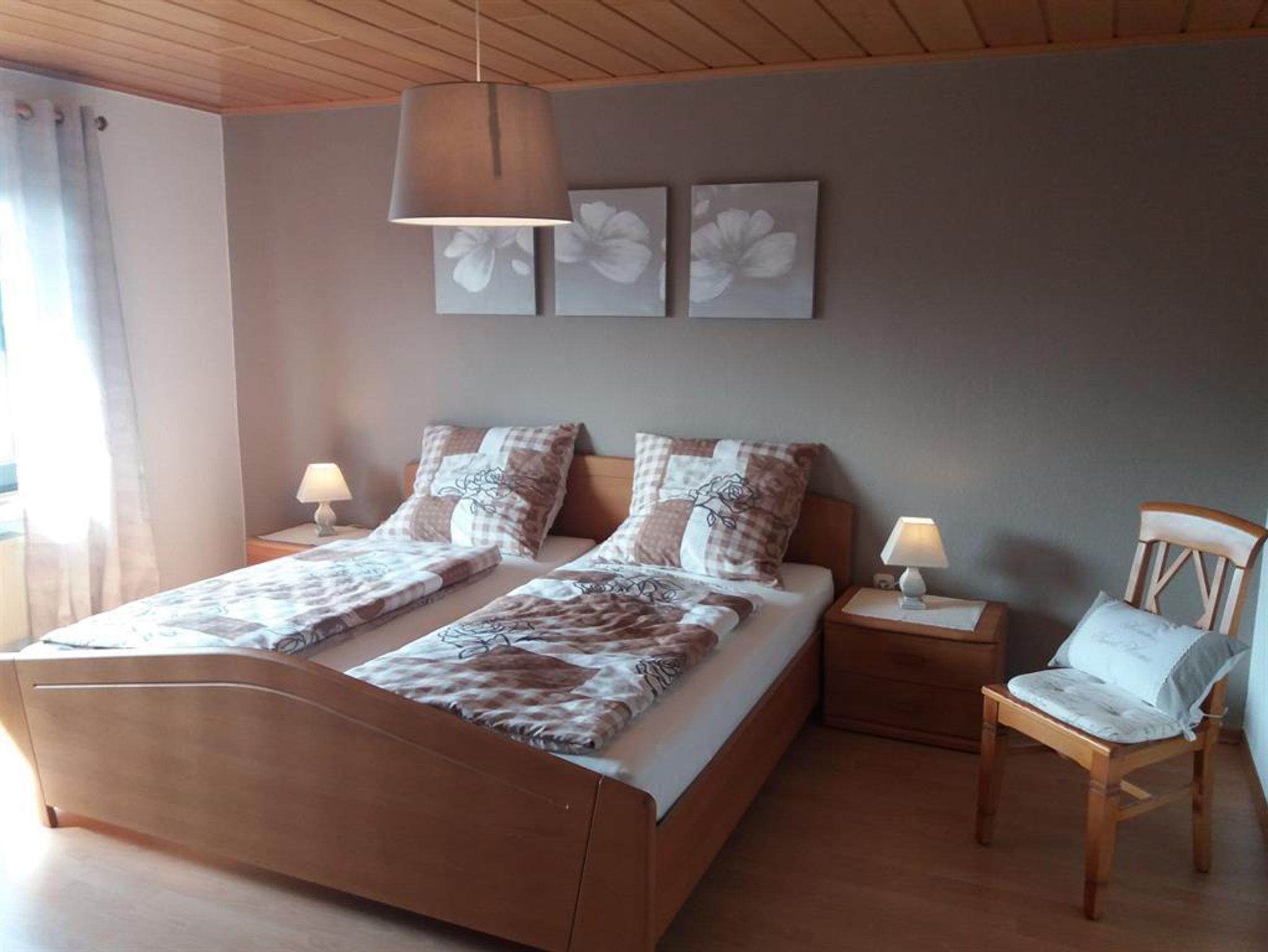Ferienwohnung Weitblick 1. Etage für 4 Personen verfügt über: - 2 Doppelschlafzimmer, beide mit SAT-TV - Badezimmer mit sehr komfortabler Dusche, Bidet sowie einen Föhn - Waschmaschiene ist vorhanden - Moderne Einbauküche mit Backofen, Ceranfeld, Geschierrspüler, Kühlschrank mit Gefrierfach, Wasser- und Eierkocher, Toaster, Kaffeemaschine, elekt. Handrührgerät und Sandwitchtoaster. - Der sehr großzügige Wohn-, Essbereich ist mit einem großen Sat-TV (Internetfähig), mit einem DVD/Bluray Gerät sowie CD/Radio Musikanlage ausgestattet. Für entspannende Abende ist ein offener Kamin die richtige Alternative. - In allen Räumen ist W-LAN zu empfangen - Ein Babybett, Hochstuhl sowie ein Safe sind vorhanden - Handtücher und Bettwäsche sind inclusive