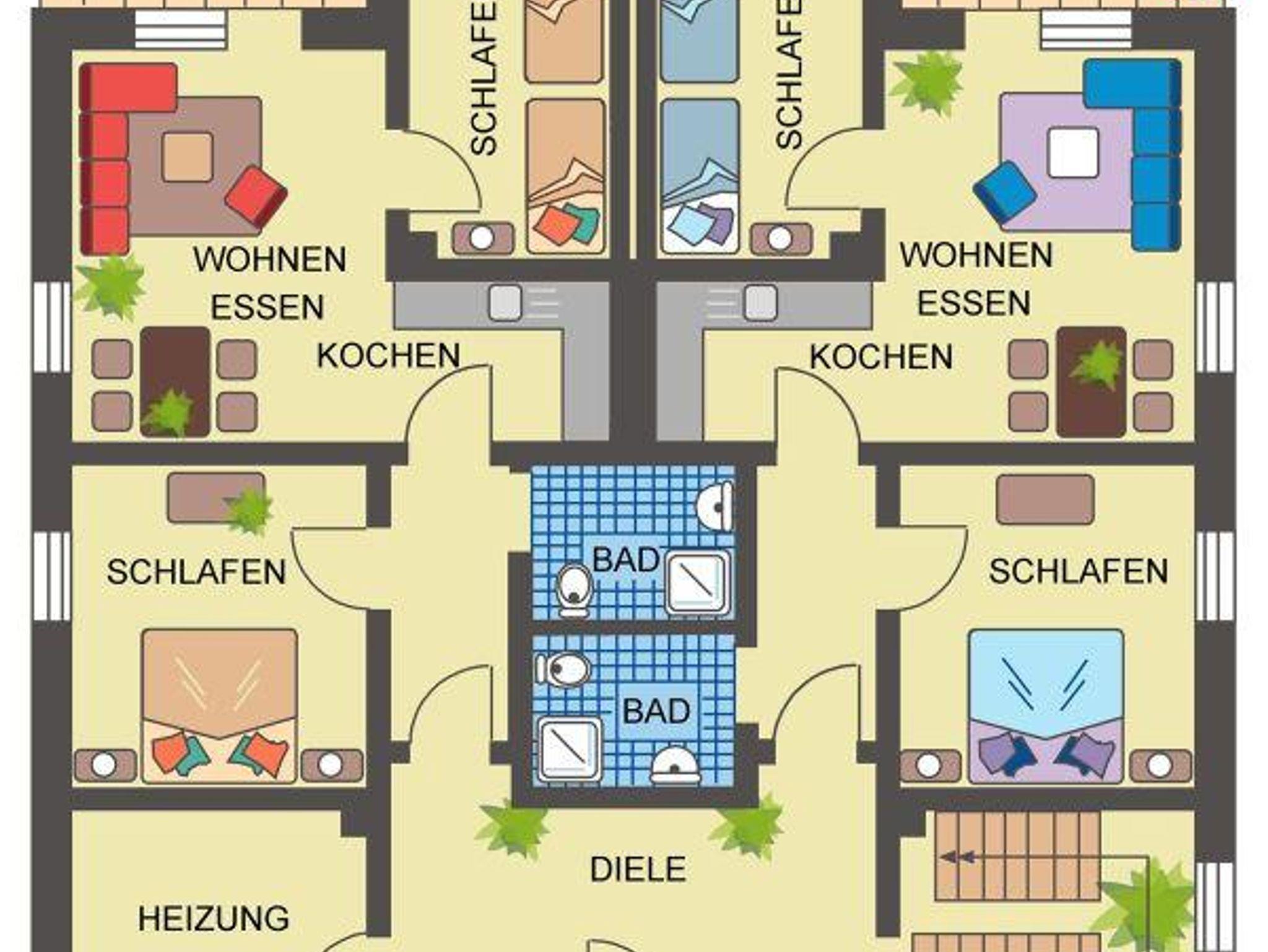 Die Ferienwohnungen für 2-4 Personen sind modern ausgestattet mit Wohn/Esszimmer, 2 Schlafzimmer, Küche, Badezimmer mit Dusche/WC, SAT-TV und Internetanschluß. Im Erdgeschoss gibt es eine Terrasse und in der 1. Etage einen Balkon.