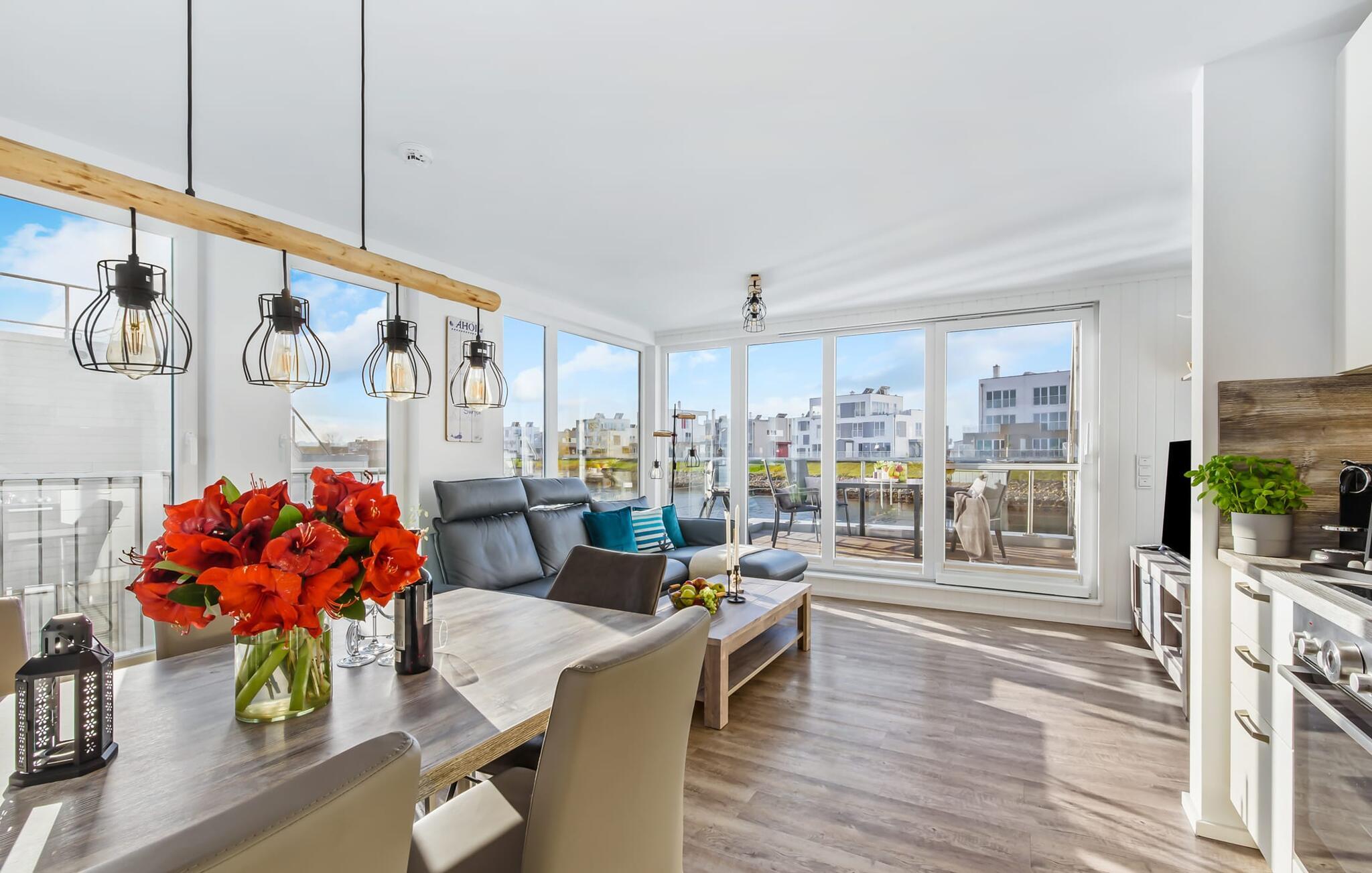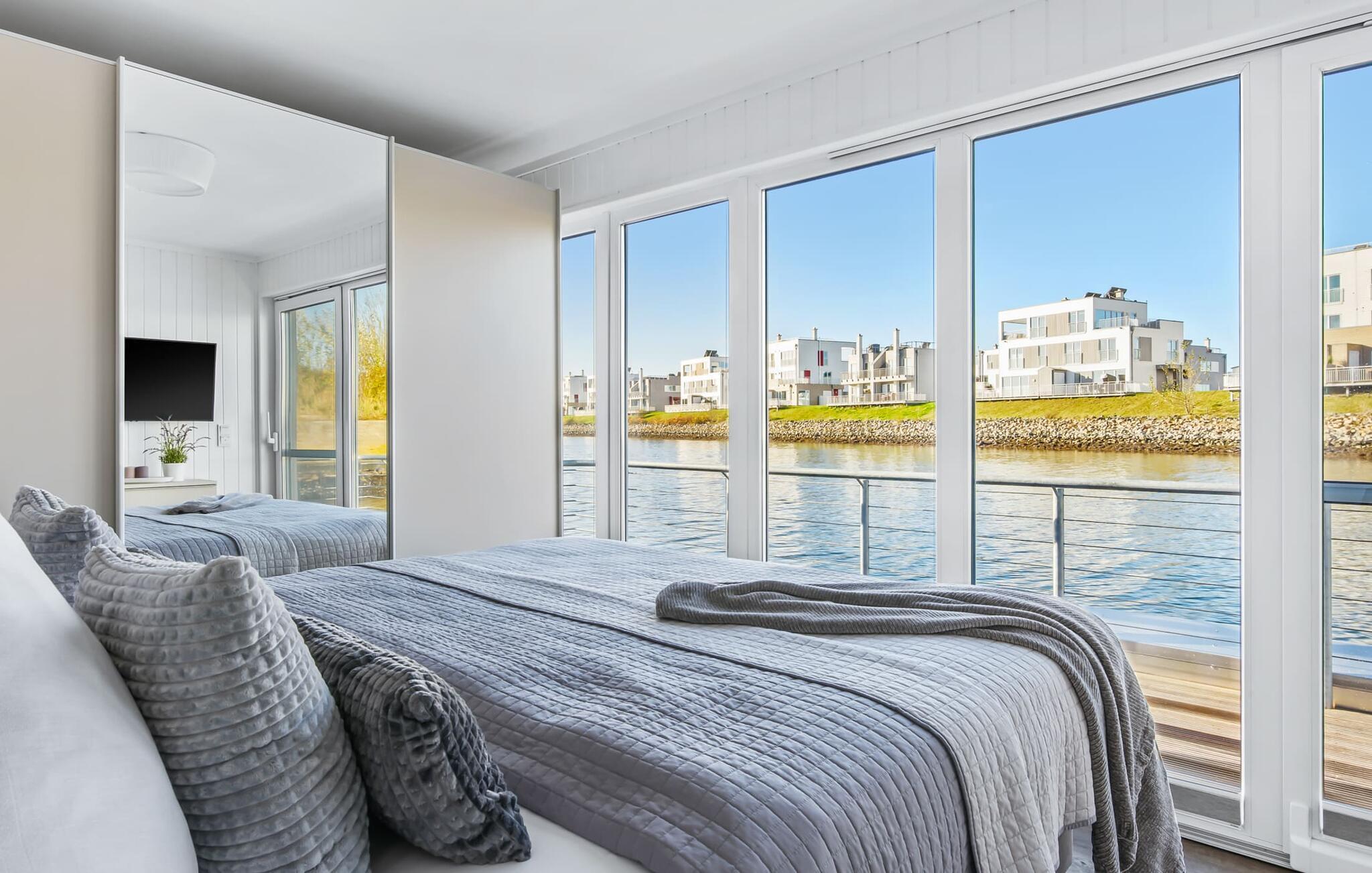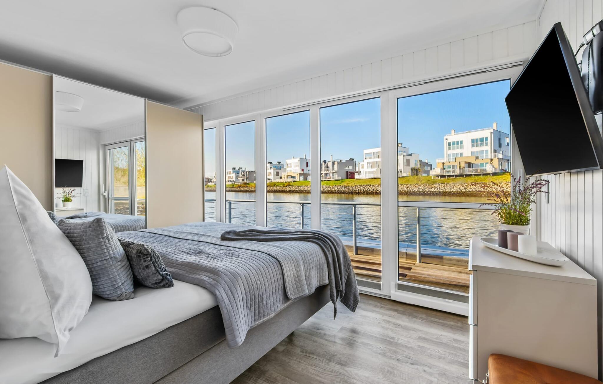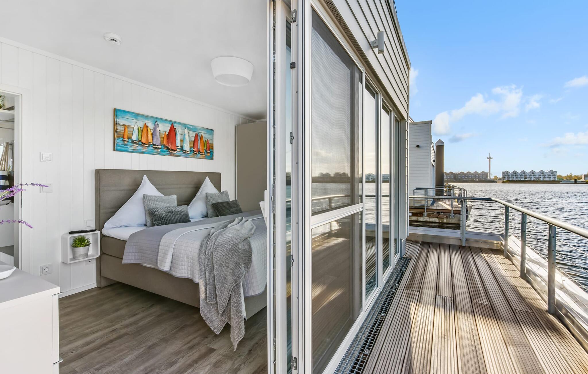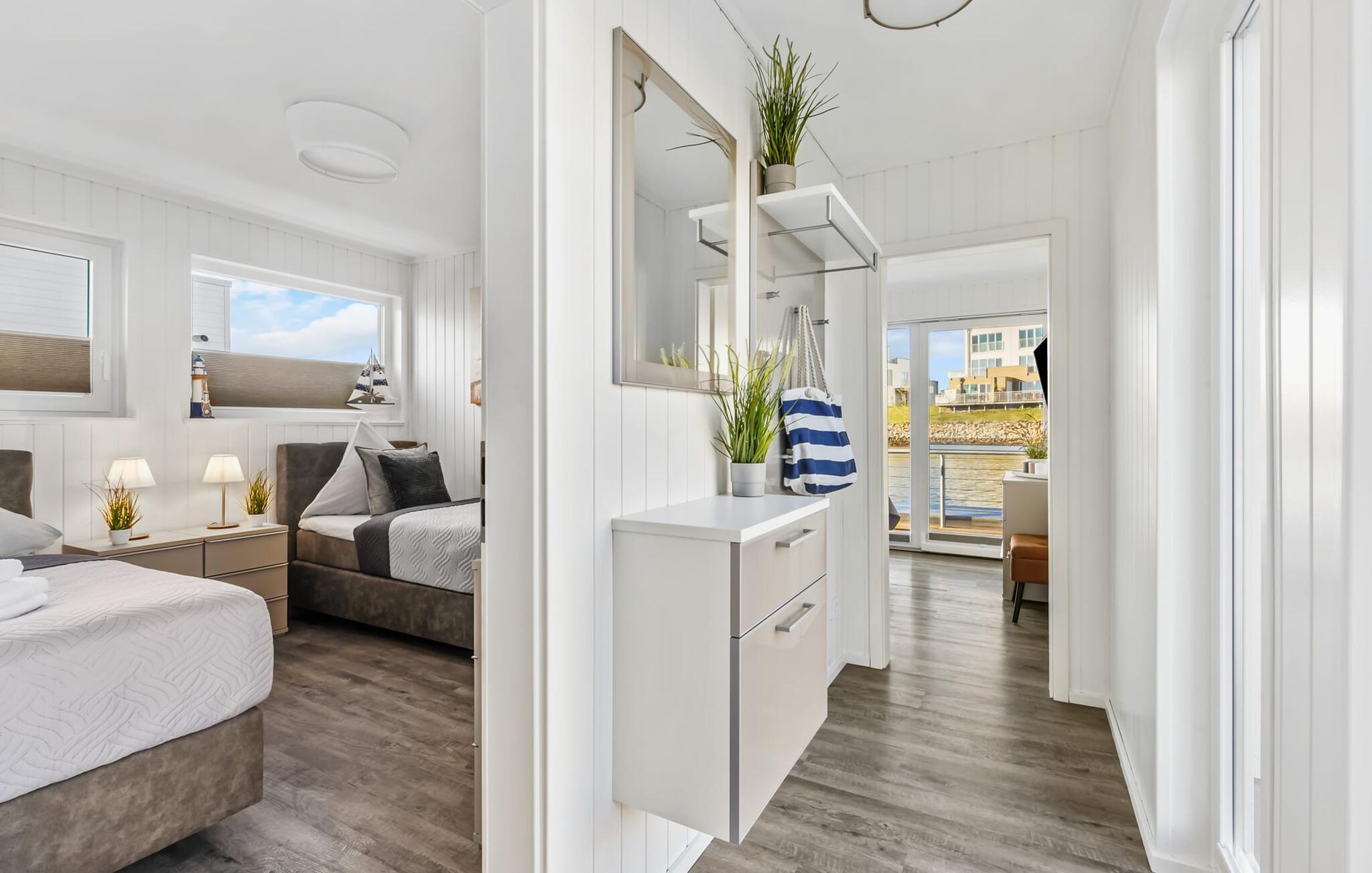 Det er svært at forestille sig SlesvigHolsten uden måger, og ingen ved med sikkerhed, om der faktisk var en mågered på det flydende hus MÖWENNEST... Det flydende hus MÖWENNEST har meget mere luksus at byde på end en rigtig mågered. Tre terrasser i tre forskellige niveauer og en privat bådplads lige ved siden af huset er blot nogle af højdepunkterne. jeres parkeringsplads er placeret direkte ved anløbsbroen og kun få meter fra ferielejligheden. Brug den tilgængelige håndkærre og rul jeres bagage ind i denne drømmende ferieidyl. Stueetagen er så at sige wellness-området på MÖWENNEST. Her ligger de to soveværelser, som begge er udstyret med boxmadrasser. I har valget mellem en dobbeltseng med TV og udgang til den første terrasse. Her kan I slappe dejligt af både inden I går i seng og efter at være vågnet. Eller I kan vælge de to enkeltsenge. Her er også et tv. Bruserummet med brusebad i gulvniveau og stort vindue lader intet tilbage at ønske, og den finske sauna overfor forkæler jer med øjeblikke af velvære i hver sæson. Gå op ad trappen til første sal, og en lille drøm venter dig: oversvømmet med lys og et vandpanorama fra hvert vindue, der får jer til at holde pause. Denne moderne stue/spisestue af høj kvalitet med inkluderet tekøkken tilbyder alt hvad I behøver for en afslappet og afslappende ferie. Perfekt køkkenudstyr, en komfortabel spiseplads og et indbydende hyggehjørne med fjernsyn omgivet af gulv til loft vinduer. Havet virker ikke. Åbn derefter skydedøren og gå ind på endnu en terrasse, som indbyder til hyggelige aftener med stilfulde udendørsmøbler og grill. Man skulle tro, at det ville være nok med hensyn til komfort, men MÖWENNEST tilbyder endnu mere. Ved at bruge den udvendige trappe på den anden terrasse kan I nå tagterrassen med en 360 graders panoramaudsigt over Slien, Østersøen og feriestedet Olpenitz ved Østersøen. Det er virkelig overvældende og en ferieoplevelse, som I sent vil glemme. Og strandstolen af høj kvalitet inviterer jer til at blive hængende, forundre, se og give slip. Vores yndlingssted: helt klart strandstolen på tagterrassen! Bemærk venligst: OstseeResort Olpenitz er meget populært, og der bygges fortsat i parken. Ikke desto mindre kan I se frem til en 5-stjernet standard og et førsteklasses ophold. Byggeaktiviteterne kommer ikke til at forstyrre jer på ferien, og derfor gives der ikke yderligere afslag i prisen.