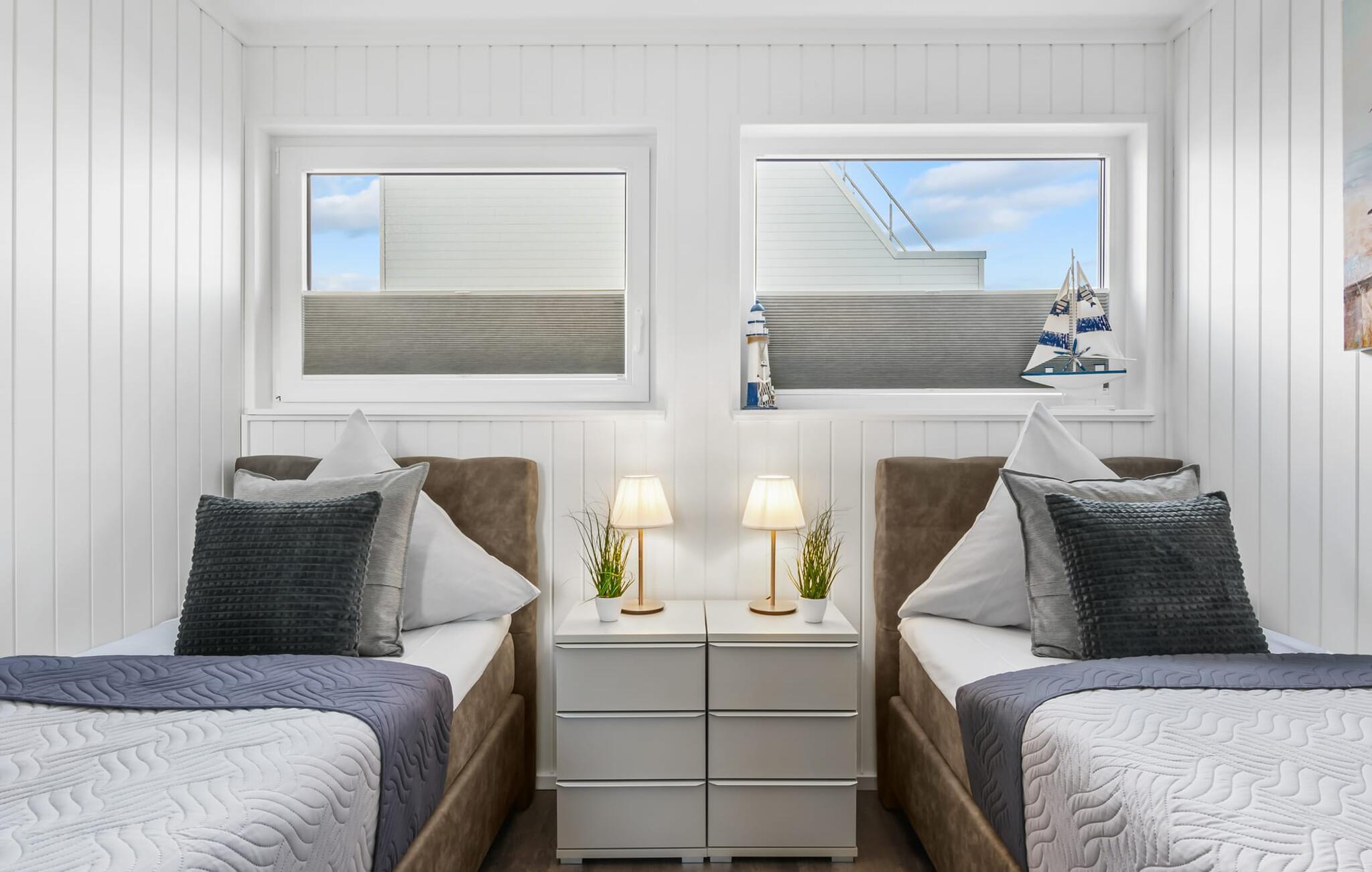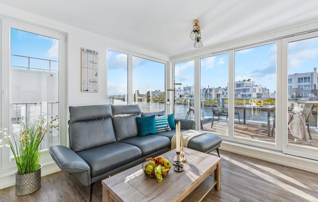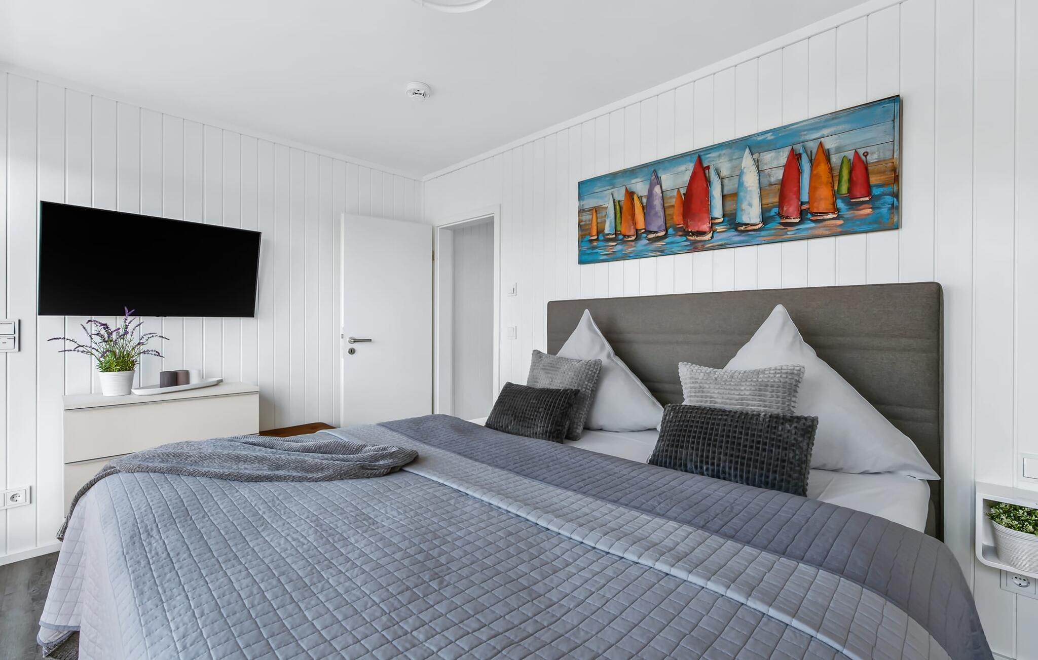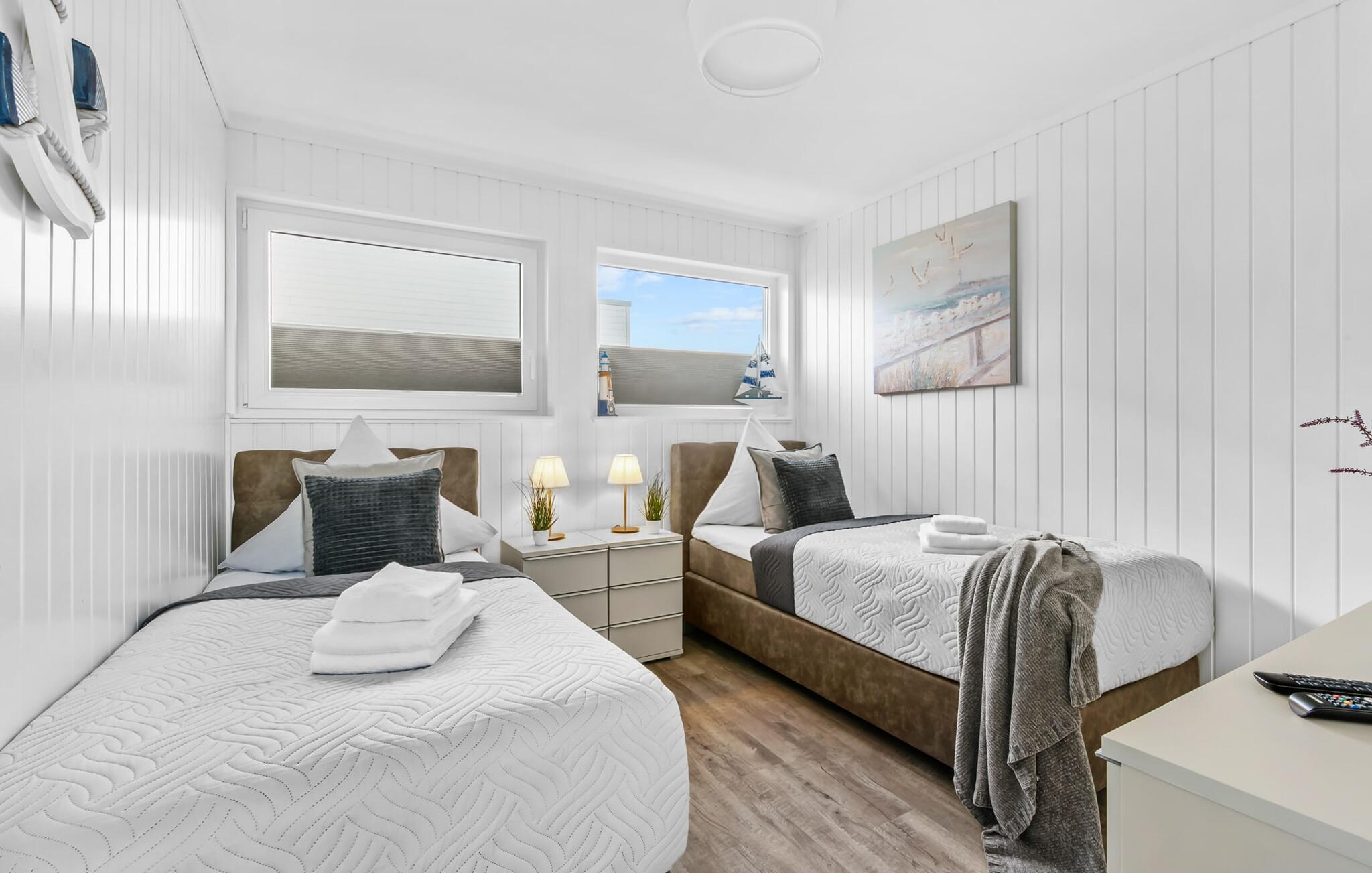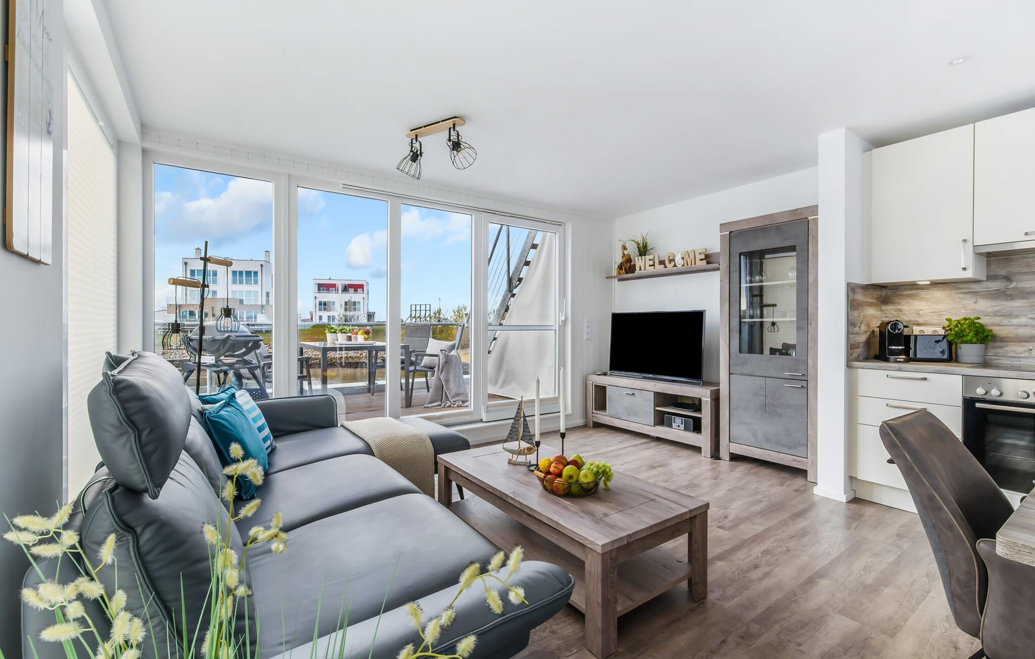 Det er svært at forestille sig SlesvigHolsten uden måger, og ingen ved med sikkerhed, om der faktisk var en mågered på det flydende hus MÖWENNEST... Det flydende hus MÖWENNEST har meget mere luksus at byde på end en rigtig mågered. Tre terrasser i tre forskellige niveauer og en privat bådplads lige ved siden af huset er blot nogle af højdepunkterne. jeres parkeringsplads er placeret direkte ved anløbsbroen og kun få meter fra ferielejligheden. Brug den tilgængelige håndkærre og rul jeres bagage ind i denne drømmende ferieidyl. Stueetagen er så at sige wellness-området på MÖWENNEST. Her ligger de to soveværelser, som begge er udstyret med boxmadrasser. I har valget mellem en dobbeltseng med TV og udgang til den første terrasse. Her kan I slappe dejligt af både inden I går i seng og efter at være vågnet. Eller I kan vælge de to enkeltsenge. Her er også et tv. Bruserummet med brusebad i gulvniveau og stort vindue lader intet tilbage at ønske, og den finske sauna overfor forkæler jer med øjeblikke af velvære i hver sæson. Gå op ad trappen til første sal, og en lille drøm venter dig: oversvømmet med lys og et vandpanorama fra hvert vindue, der får jer til at holde pause. Denne moderne stue/spisestue af høj kvalitet med inkluderet tekøkken tilbyder alt hvad I behøver for en afslappet og afslappende ferie. Perfekt køkkenudstyr, en komfortabel spiseplads og et indbydende hyggehjørne med fjernsyn omgivet af gulv til loft vinduer. Havet virker ikke. Åbn derefter skydedøren og gå ind på endnu en terrasse, som indbyder til hyggelige aftener med stilfulde udendørsmøbler og grill. Man skulle tro, at det ville være nok med hensyn til komfort, men MÖWENNEST tilbyder endnu mere. Ved at bruge den udvendige trappe på den anden terrasse kan I nå tagterrassen med en 360 graders panoramaudsigt over Slien, Østersøen og feriestedet Olpenitz ved Østersøen. Det er virkelig overvældende og en ferieoplevelse, som I sent vil glemme. Og strandstolen af høj kvalitet inviterer jer til at blive hængende, forundre, se og give slip. Vores yndlingssted: helt klart strandstolen på tagterrassen! Bemærk venligst: OstseeResort Olpenitz er meget populært, og der bygges fortsat i parken. Ikke desto mindre kan I se frem til en 5-stjernet standard og et førsteklasses ophold. Byggeaktiviteterne kommer ikke til at forstyrre jer på ferien, og derfor gives der ikke yderligere afslag i prisen.