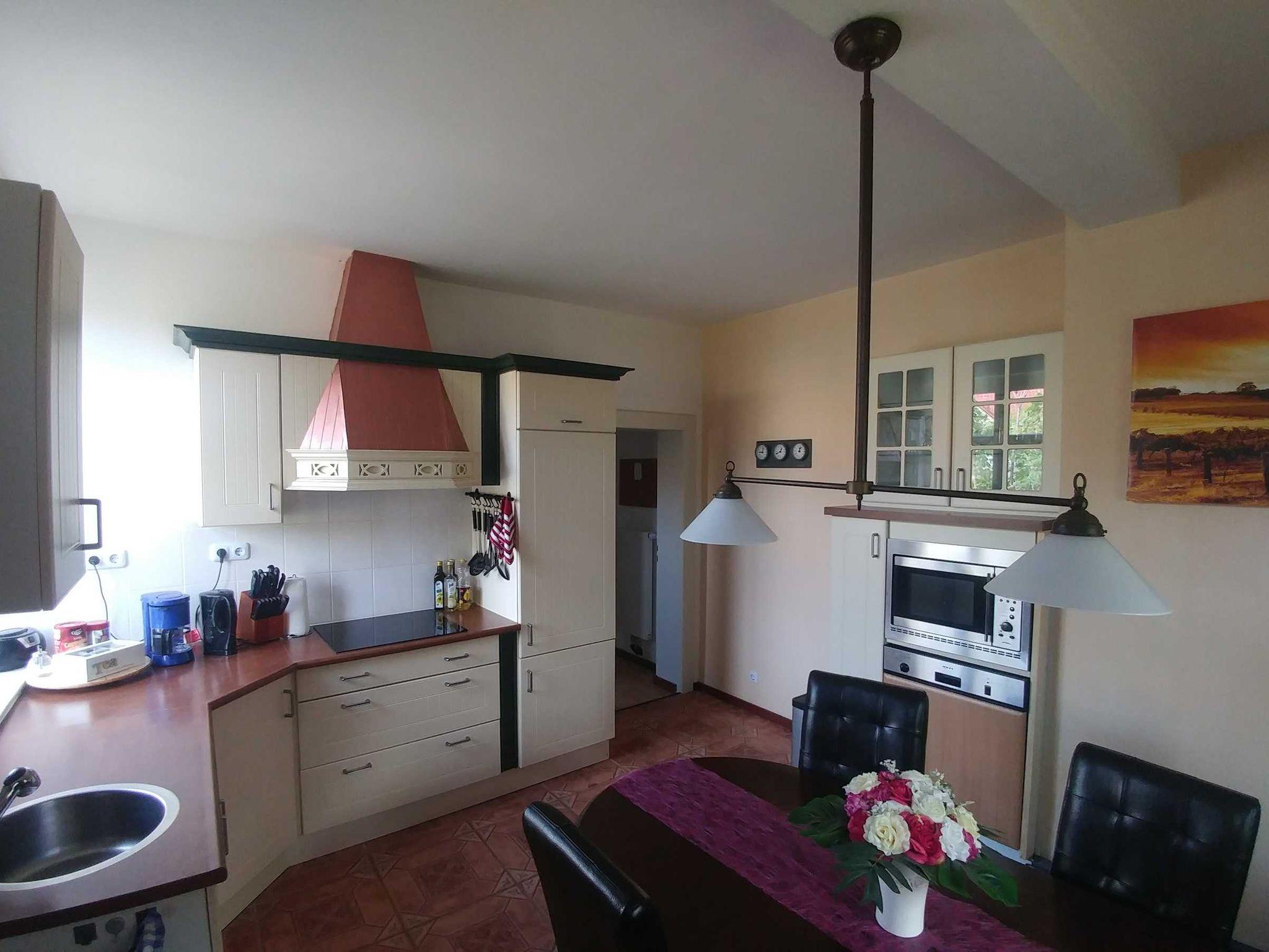 Die Küche ist ausgestattet mit Induktionskochfeld, Backofen/Mikrowellekombinationsgerät, Toaster, Kaffeemaschine, Wasserkocher, Geschirrspüler, Kühlschrank sowie Geschirr für 6 Personen.