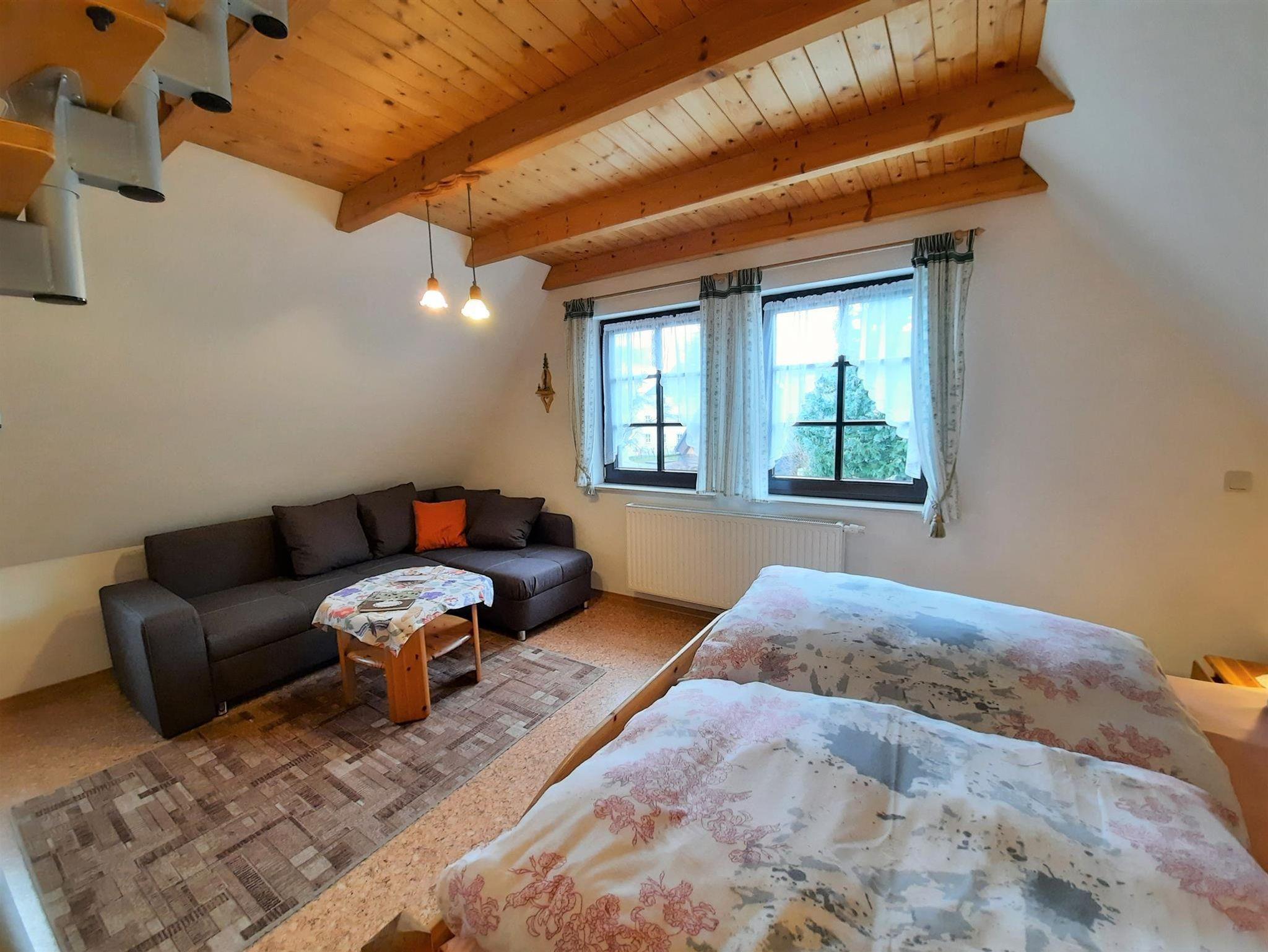 Die 40 m² große Wohnung befindet sich im Nebenhaus (Angerschänke). Sie verfügt über einen Wohn-/ Schlafraum mit Doppelbett, eine komplett ausgestattete Küche, Dusche/ WC. Vom Wohnraum aus gelangt man über eine Treppe auf den Schlafboden, wo nochmals zwei weitere Betten (Aufbettung auf Anfrage) zur Verfügung stehen.