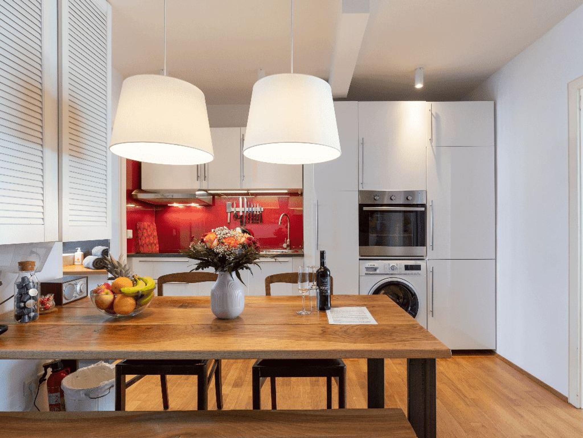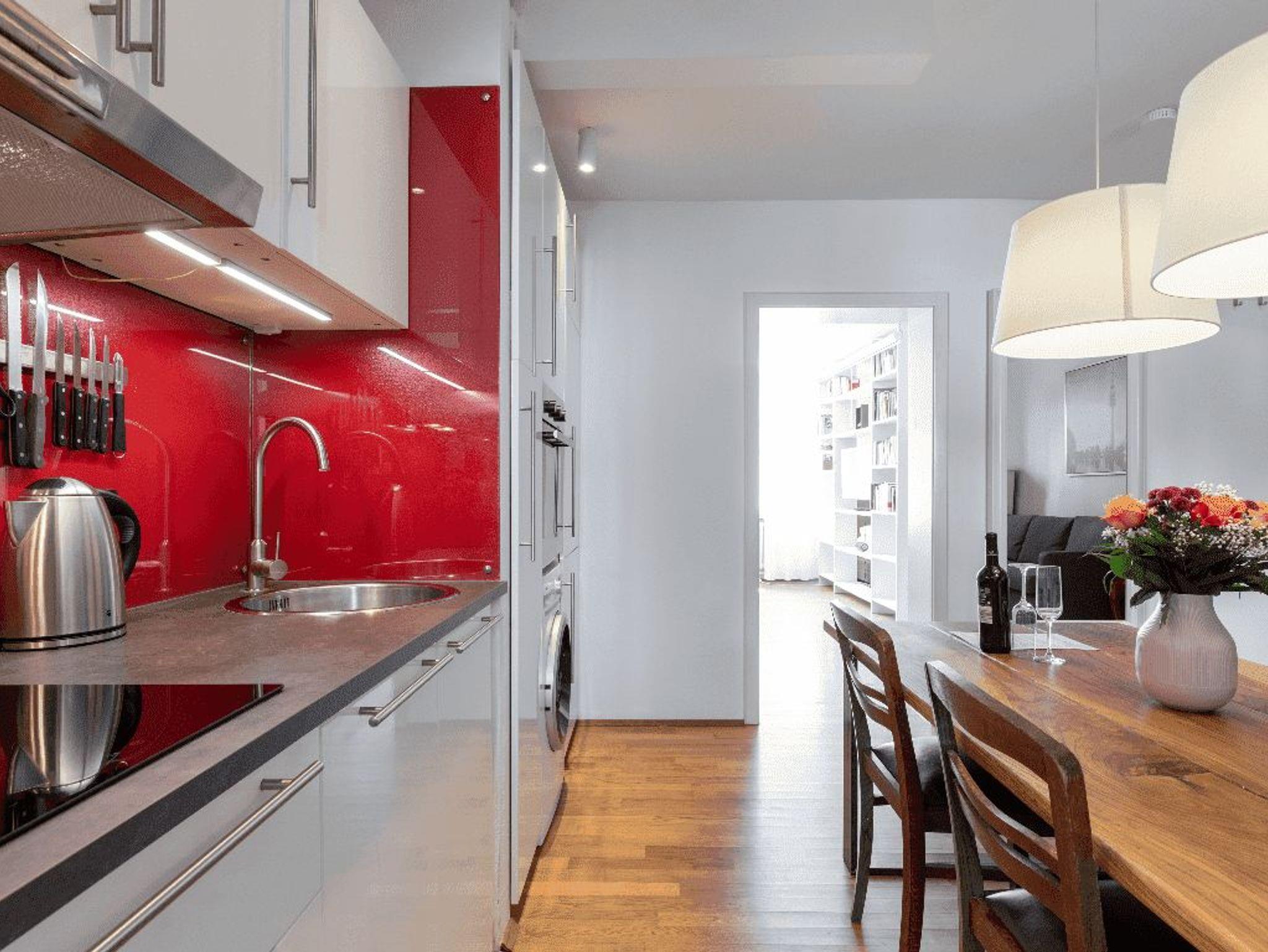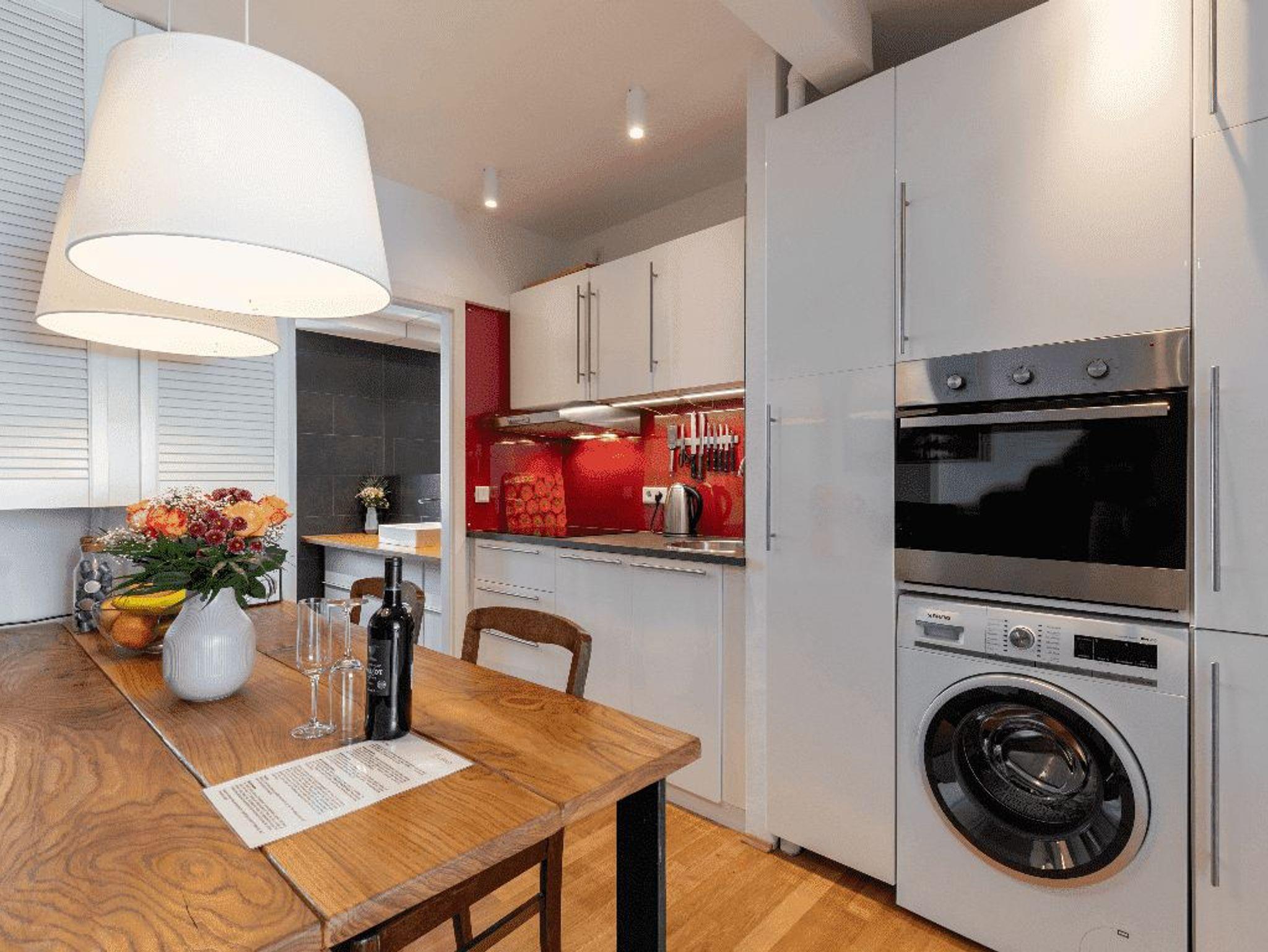 Bewundere antike Möbel und alte Truhen in diesem leuchtenden Refugium, das nur einen Steinwurf vom Geschehen entfernt liegt. Klare Linien, ganz in Weiß gehaltenes Dekor und glänzende Hartholzböden bilden den Hintergrund für eine tiefblaue Wand und eine rubinrote Küchenrückwand.